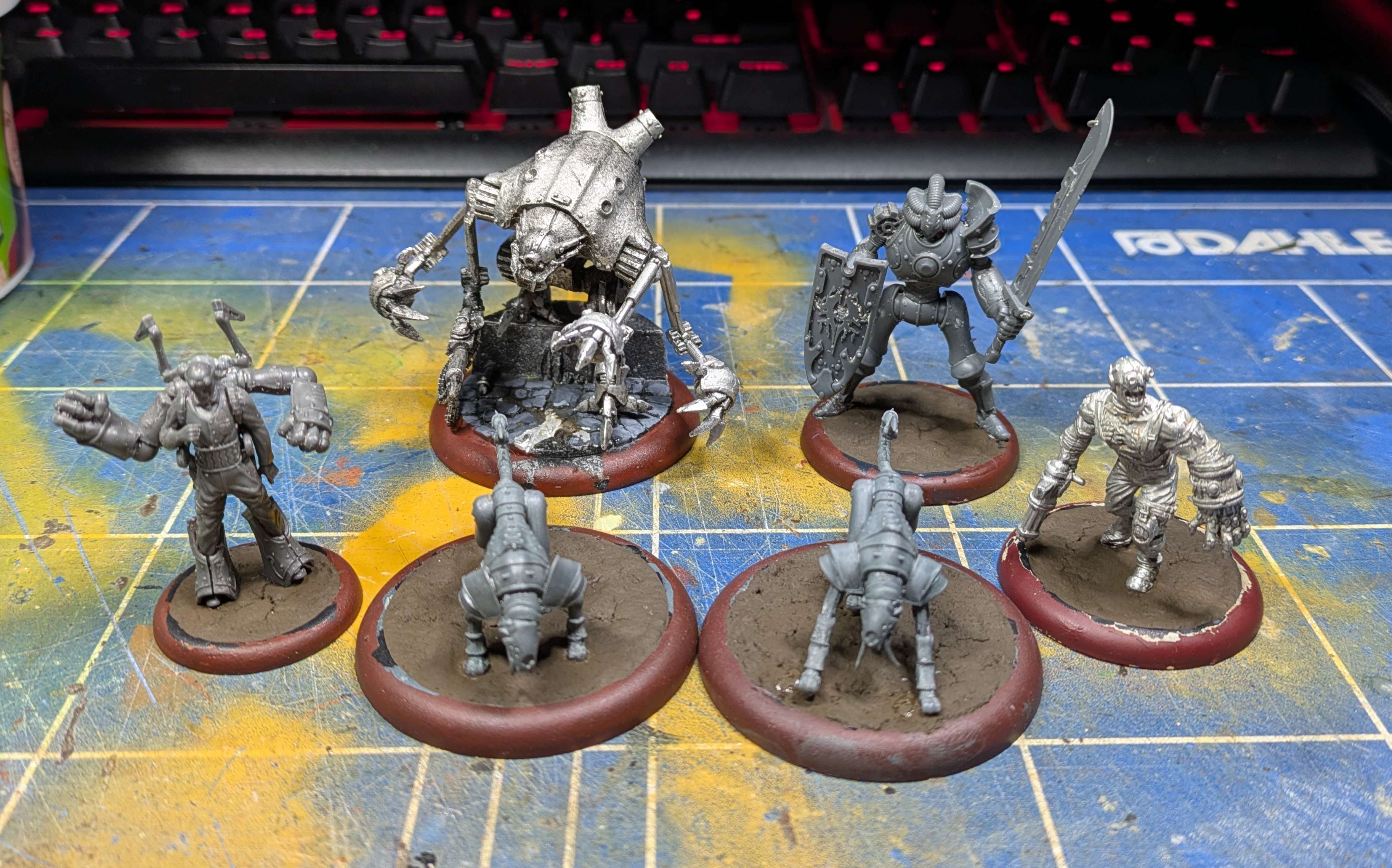 That means the first batch is Augmented. Six models; there are two metals and the other four are plastics. I hate the basing above everything else in this collection so my first step was to break everyone off the bases they were on. The large construct has a mental base insert so it stays. The rest got a layer of texture paste.
