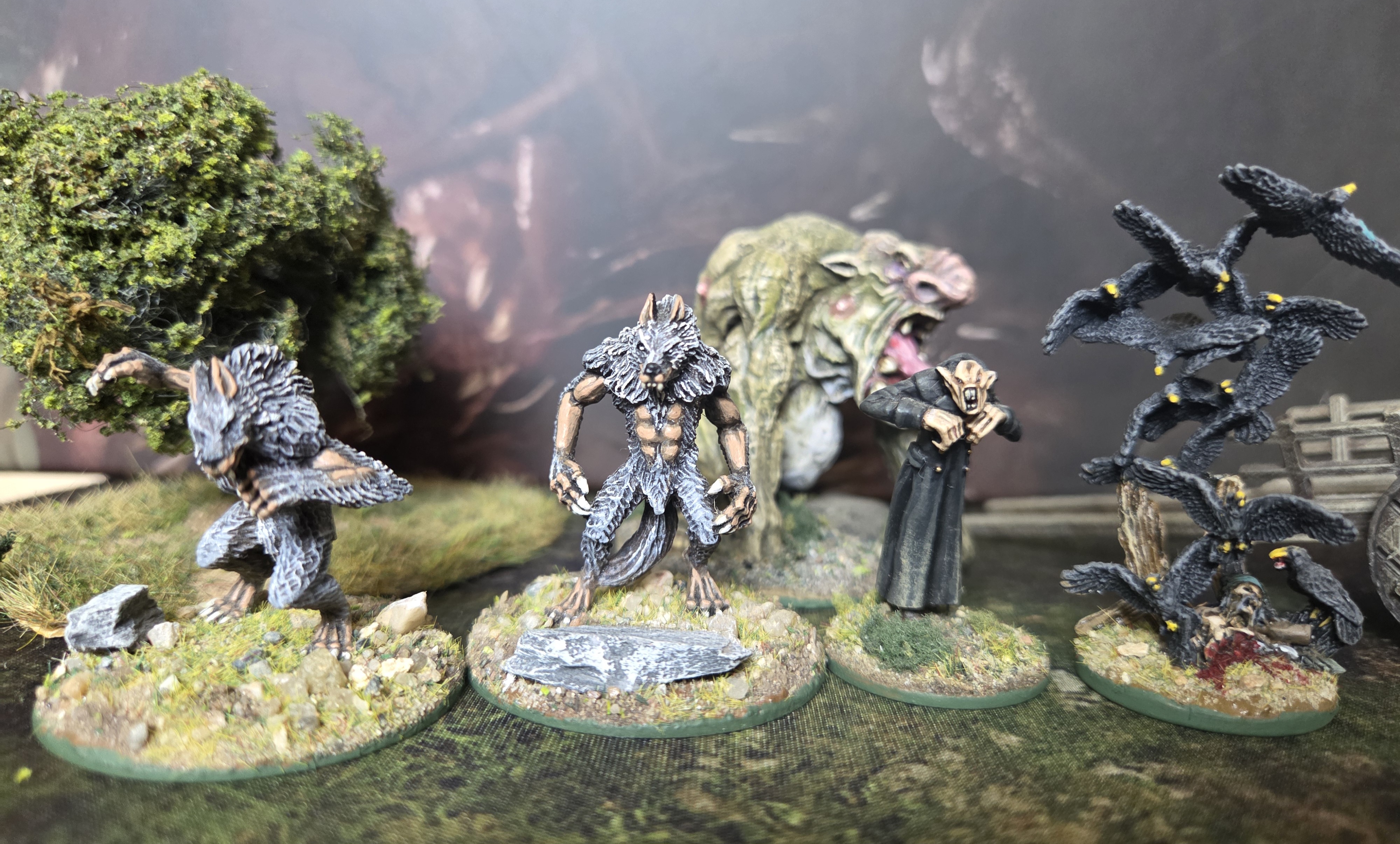 A selection of monsters completed and re based for game. Vampire and Werewolves from Northstar Dracula's America, crows from Reaper Miniatures and the troll is from Warp miniatures ( had this model for so many years but until now never had a use for him).The Conspiracy Spreads