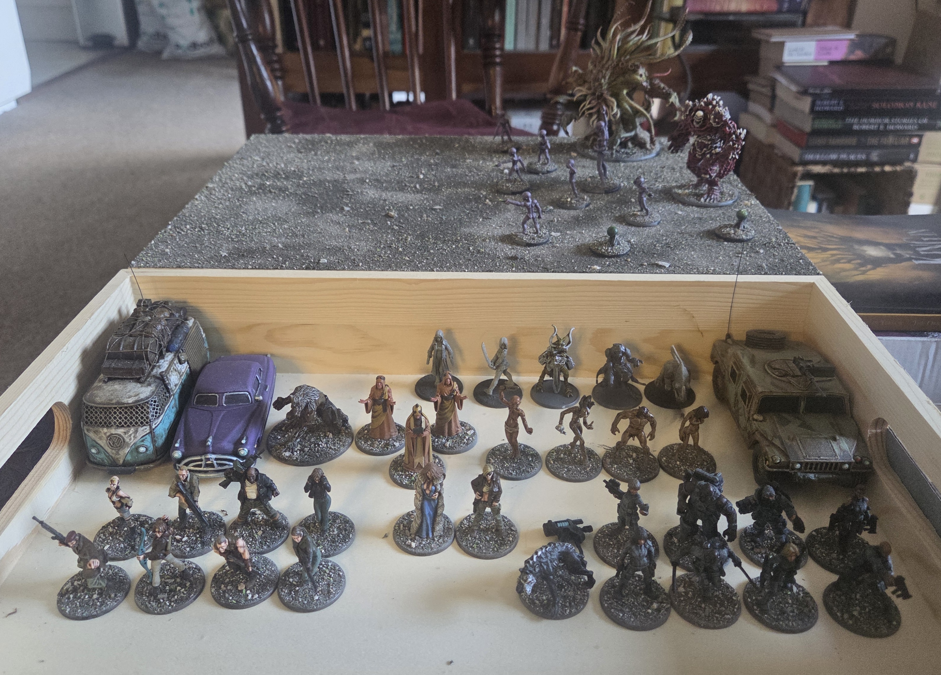 I started off with the Aliens as they were only two colour and should make an easy start, I then realised I need to document this so I took this photo of the painted Aliens and two monsters along with the box of other models.