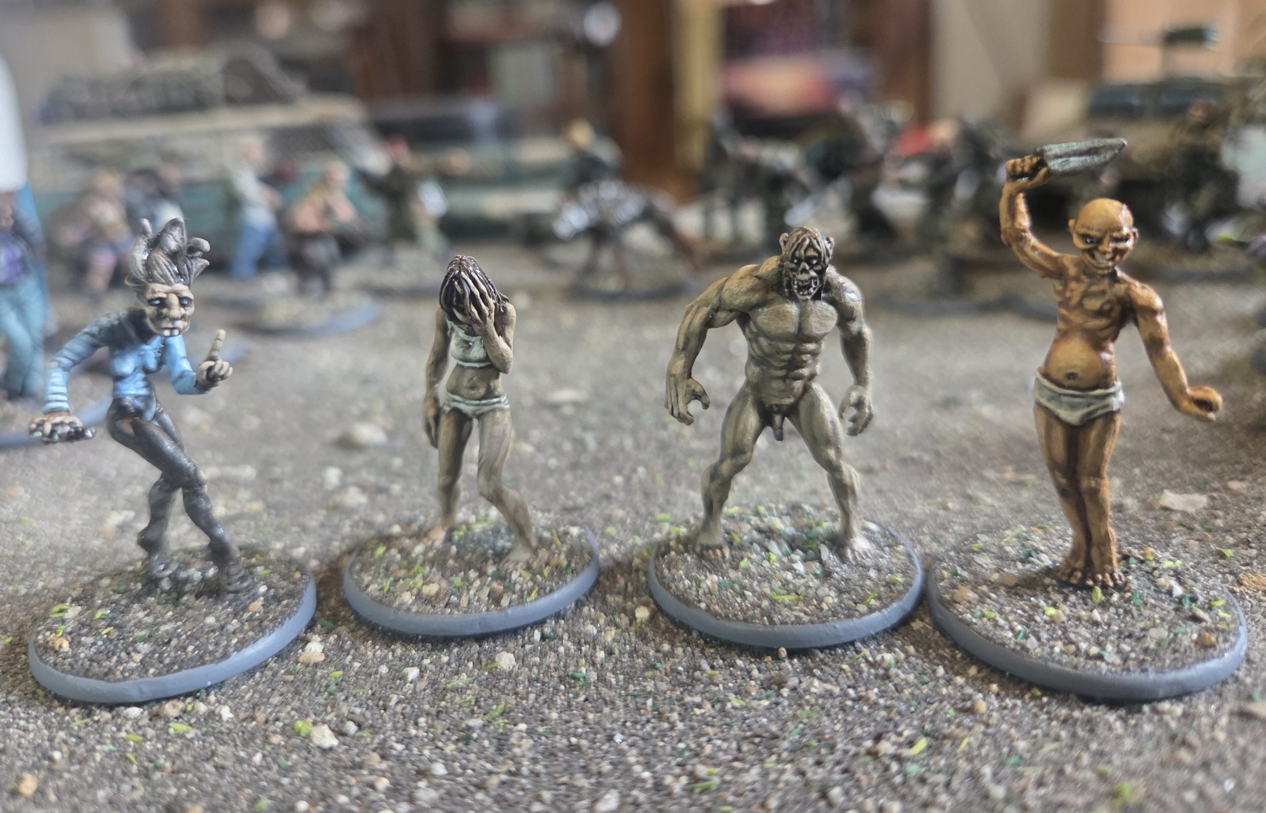 A close up of the zombie types. Tooth fairy, two regular zombies and yhat yellow bastard inspired by Sin City.Even though up until now I have been unable to finish the original Fragged Empire Models as some components failed to arrive in time (I will finish as soon as stuff arrives as am still inspired to complete these), I have completed over 60 models for a few projects during this challenge which I am really pleased with.