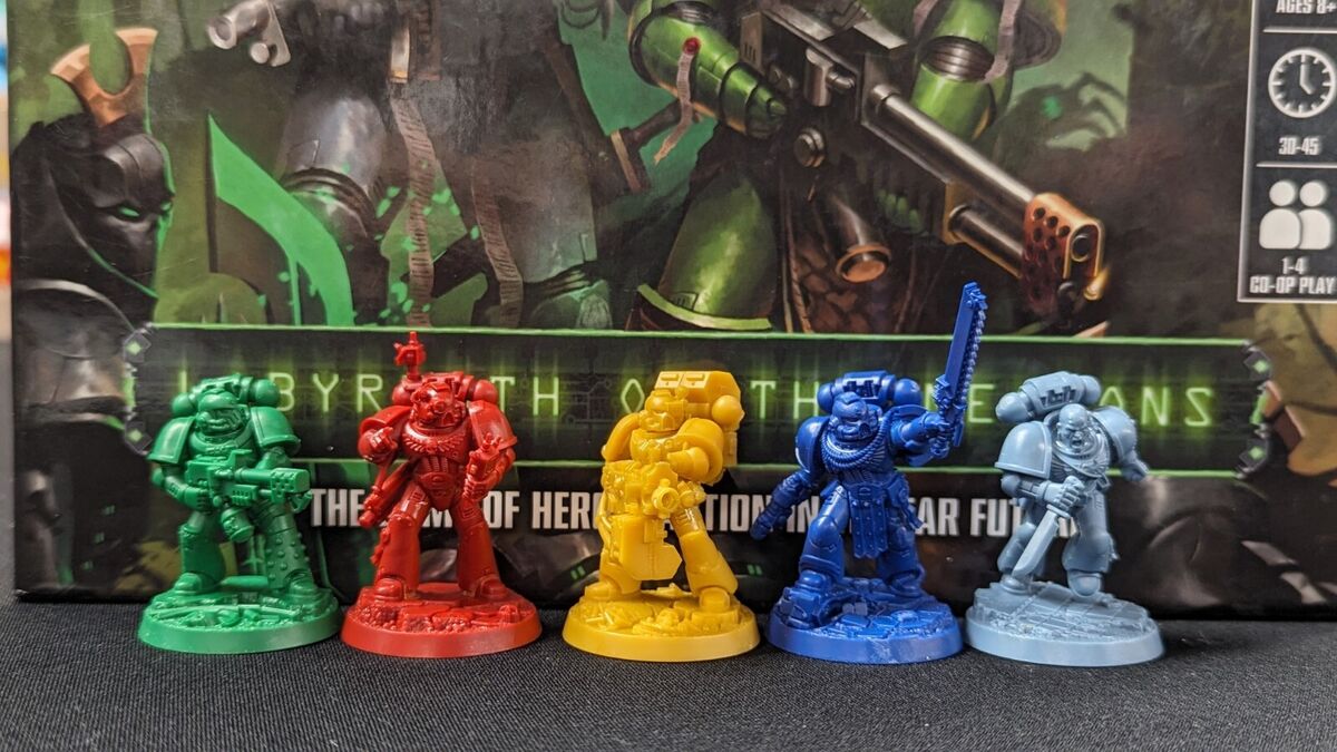 One such game is “Space Marine Adventures: Labyrinth of the Necrons.” A fairly straightforward board game, it has pretty middling reviews on its own, but it does come with five easy-build Space Marines™ (although sadly no Necrons.) These minis are taken from the “Space Marine Heroes” line, which were designed in Japan, and are therefore some of the best designed minis in the catalogue for easy assembly and clean lines. The Heroes line were blind box collectible minis, featuring a dozen or so marines of different varieties and loadout. This game gathered five such marines and put them together as a mixed bag of chapters working together to battle the xenos threat, which sure sounds a lot like the Deathwatch. The game can be picked up for about 25 bucks, which is a little more per model than I usually prefer to pay ($2 a mini, if I can manage it,) but they were of a quality that made it worth the splurge. I in part got them to use with my students at the games club I run at the school where I work. They were sturdy and color coded, which made them good for running skirmish games with teenagers. But they were always bound for a greater destiny.