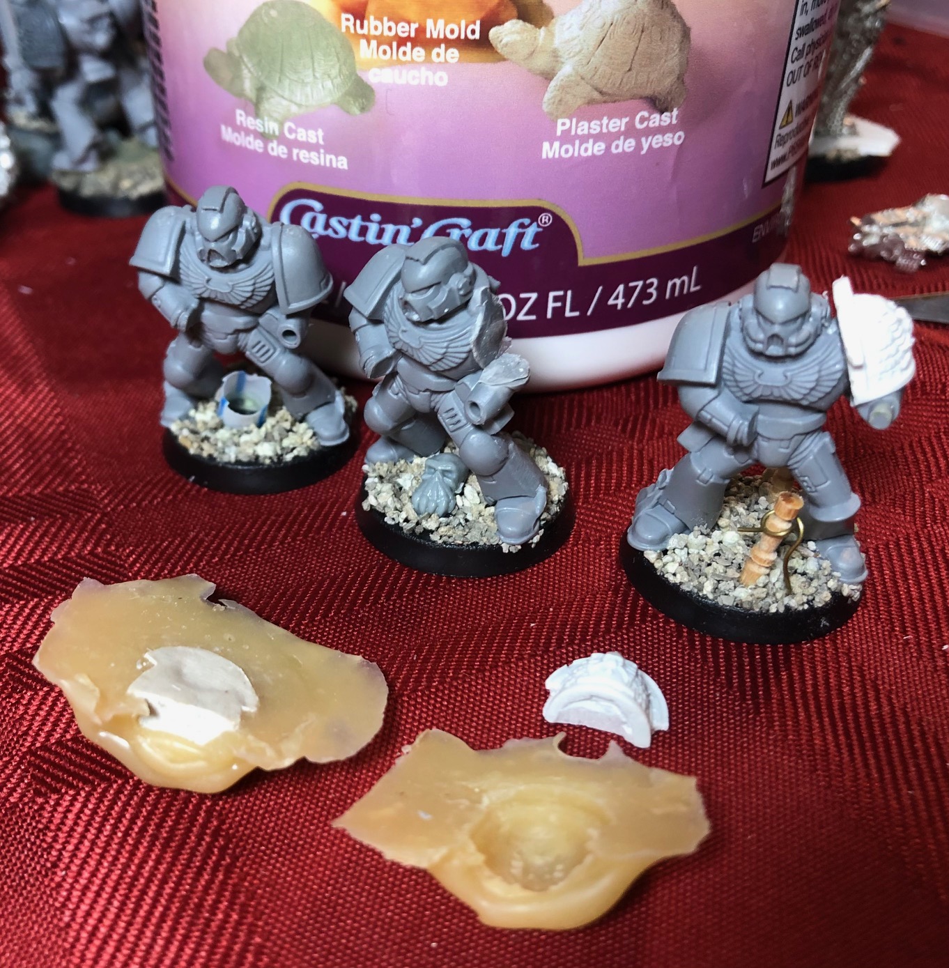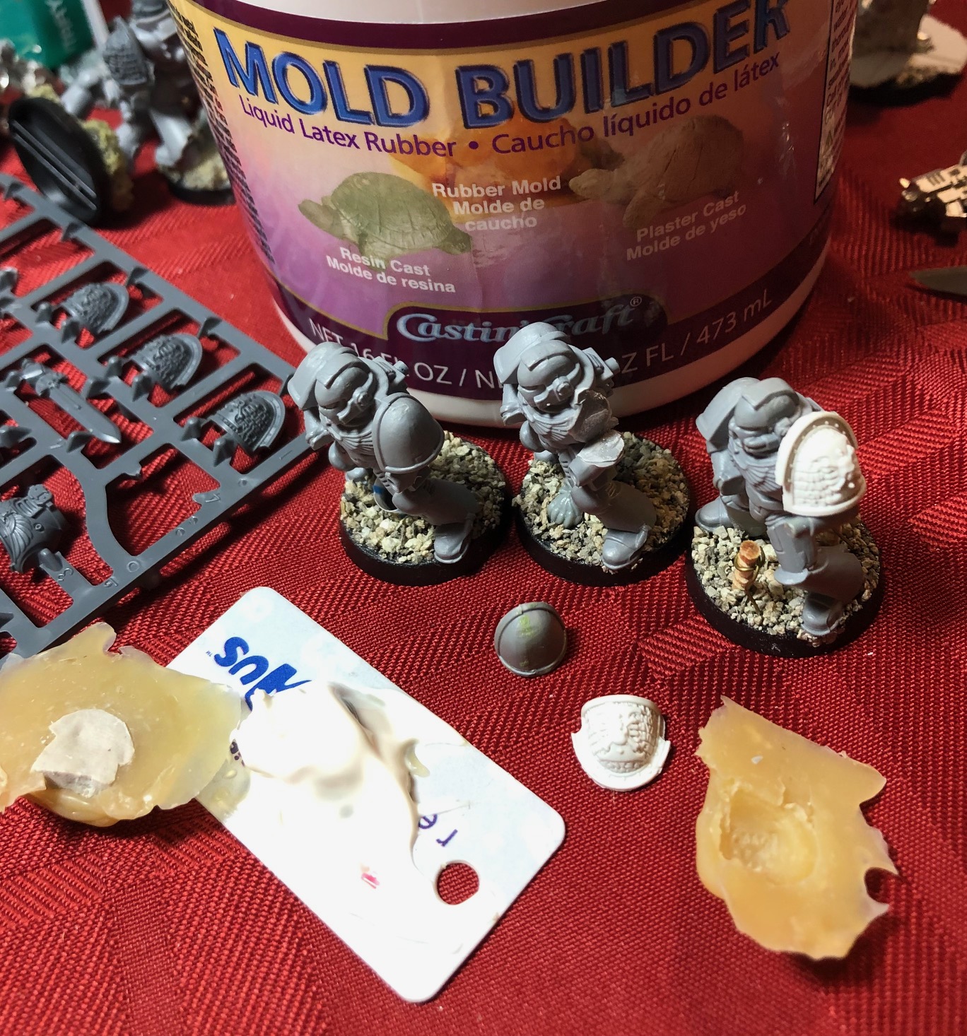 To create the actual mold itself, I used some mold-making paste. This is a thick latex concoction that one slathers over the surface one wishes to reproduce, applying multiple layers over time to make a flexible rubber mold. The first layer I applied with a Testors brush with stiff plastic bristles, making sure to push the latex into every nook and cranny to ensure good detail of the castings. Once that first layer was dry, I slathered more and more on in thicker and thicker coats. If you are thinking of doing this, use a brush you don’t need for painting later, and be sure to clean the bristles well after each use. After the first couple of layers, you can just slap it on using a popsicle stick, as I did.