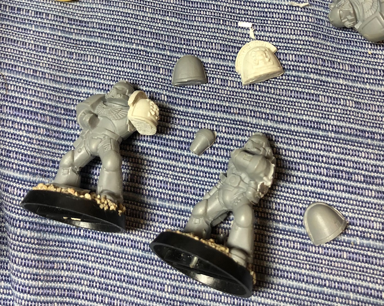 I decided to replace the entire shoulder of the old marines. Using a craft saw and hobby knife, I carved off the entire shoulder. On some models, this left the nub of the left arm that stuck out underneath attached by a smidge of plastic to the torso, and on others, this was completely detached, which would not be a problem. I could have sculpted a blob of cheap putty to replace the bit and then stuck one of those fancy GW pads atop it, and Bob would have indeed been my uncle. But that brings me back to the expense issue, a perennial concern when dealing with the lads from Nottingham. I did not want to have to go out and buy at least one more conversion sprue to finish the project, so naturally I instead turned to crime.
