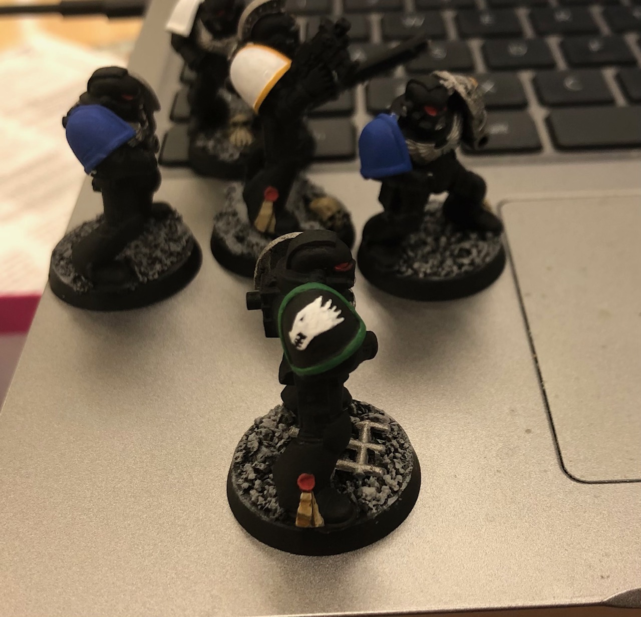 It’s always bugged me that the concept of the Deathwatch is meant to draw from ALL of the chapters, but we usually only see a handful of A-listers, and always in the most stereotypical positions: the leader of a kill team will be an Ultramarine, the Salamander will be the one with a flamer, the White Scar will be on a bike, and the Fisty Boy will have a massive gun. Yawn. Other chapters know how to use flamers too, and lots of marines can ride bikes. So I made sure to have a wide diversity of chapters, well-known and otherwise (ideally on more than one of each chapter for variety,) and to mix up their ‘positions on the field’ if you will.