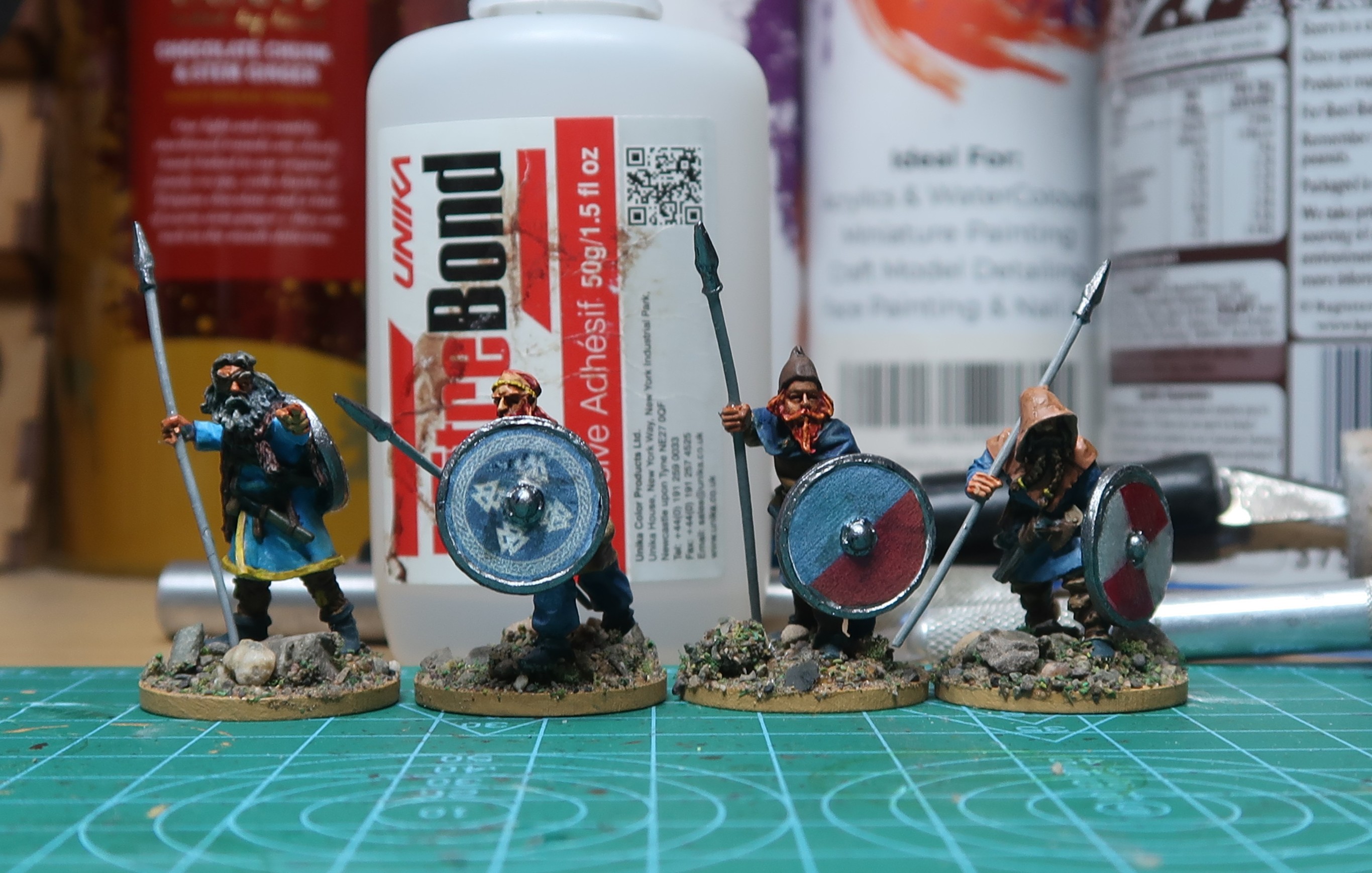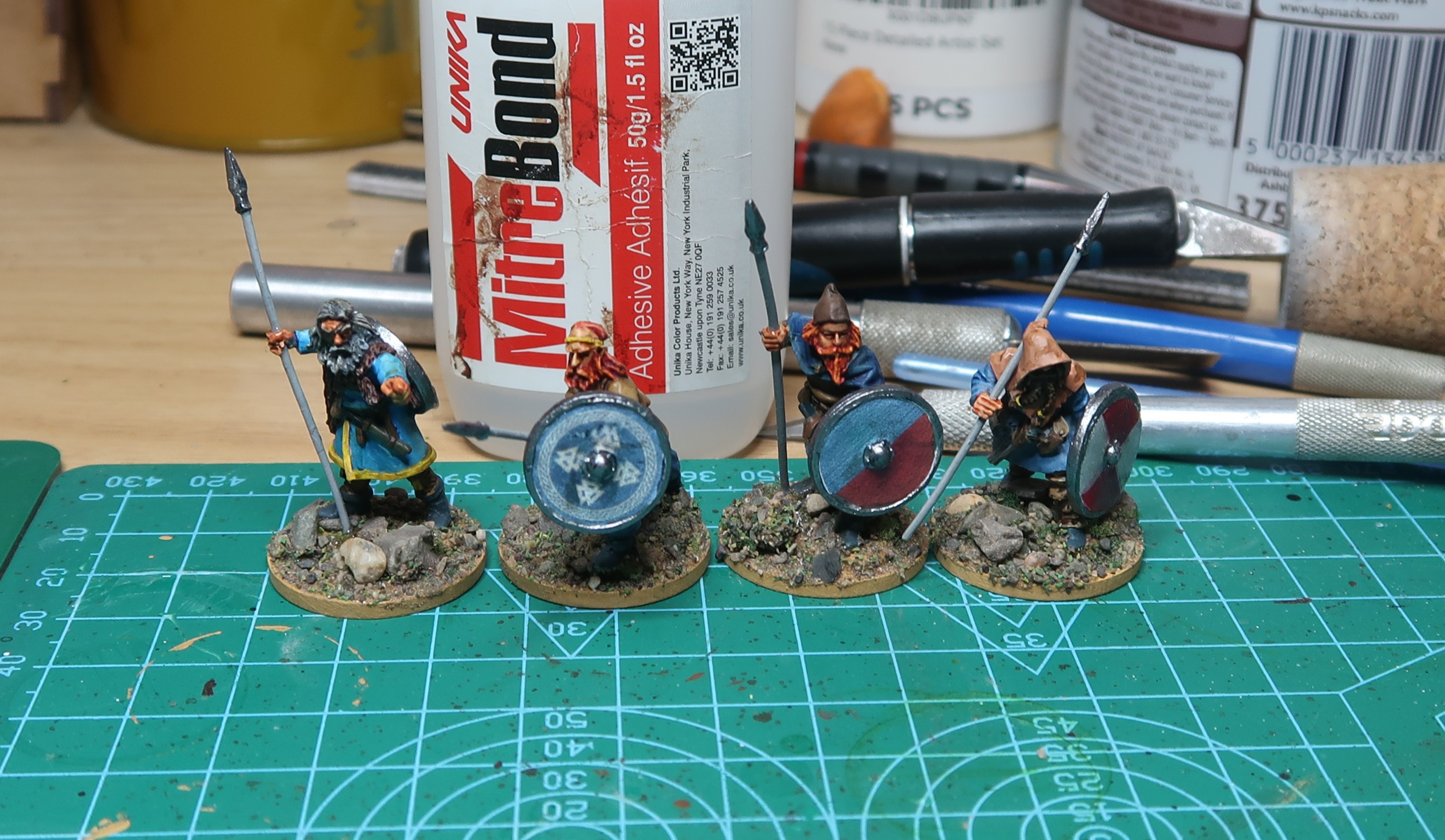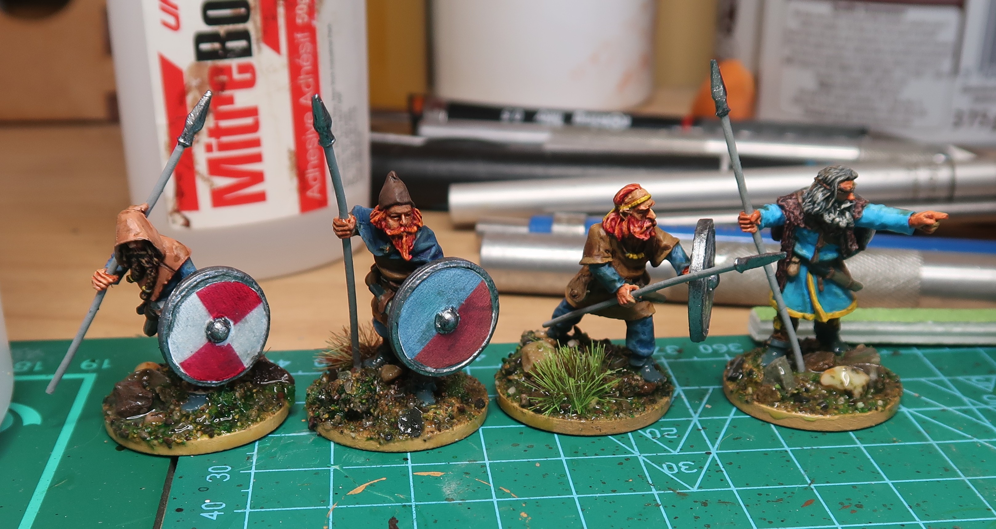 Leif’s tunic got painted German Cam. Orange Ochre (70.824) from Vallejo and then washed Bony Matter SpeedPaint (Army Panter), looked okay but the camera lied (or at least was not in focus) so no evidence is presented. Gunnar’s tunic was panted Grey Blue (70.943) from Vallejo and then washed with Magic Blue SpeedPaint (Army Painter); looked average but I still seem to have forgotten how to focus a camera (if I ever did know) so we will just have to use our imaginations.