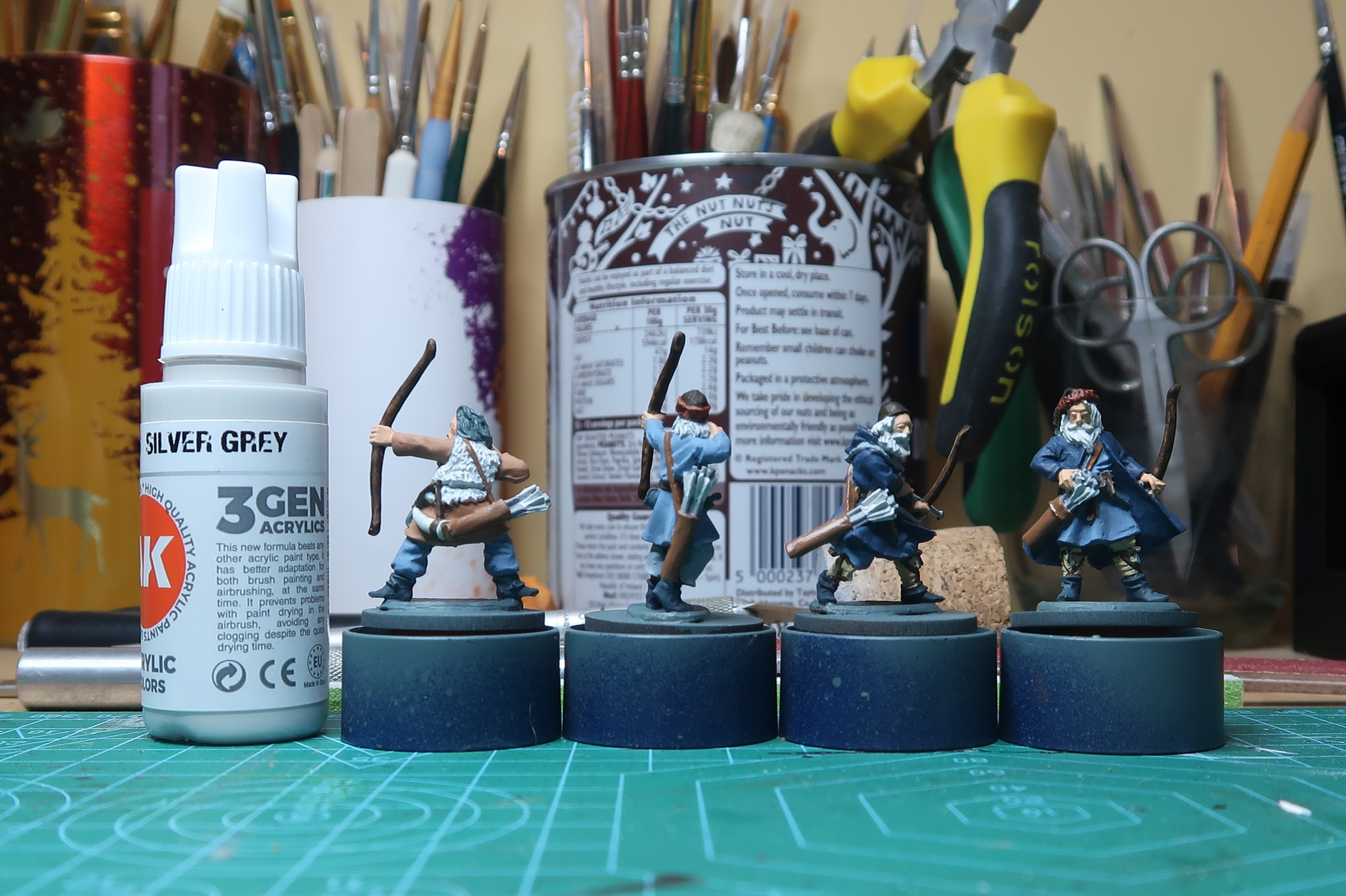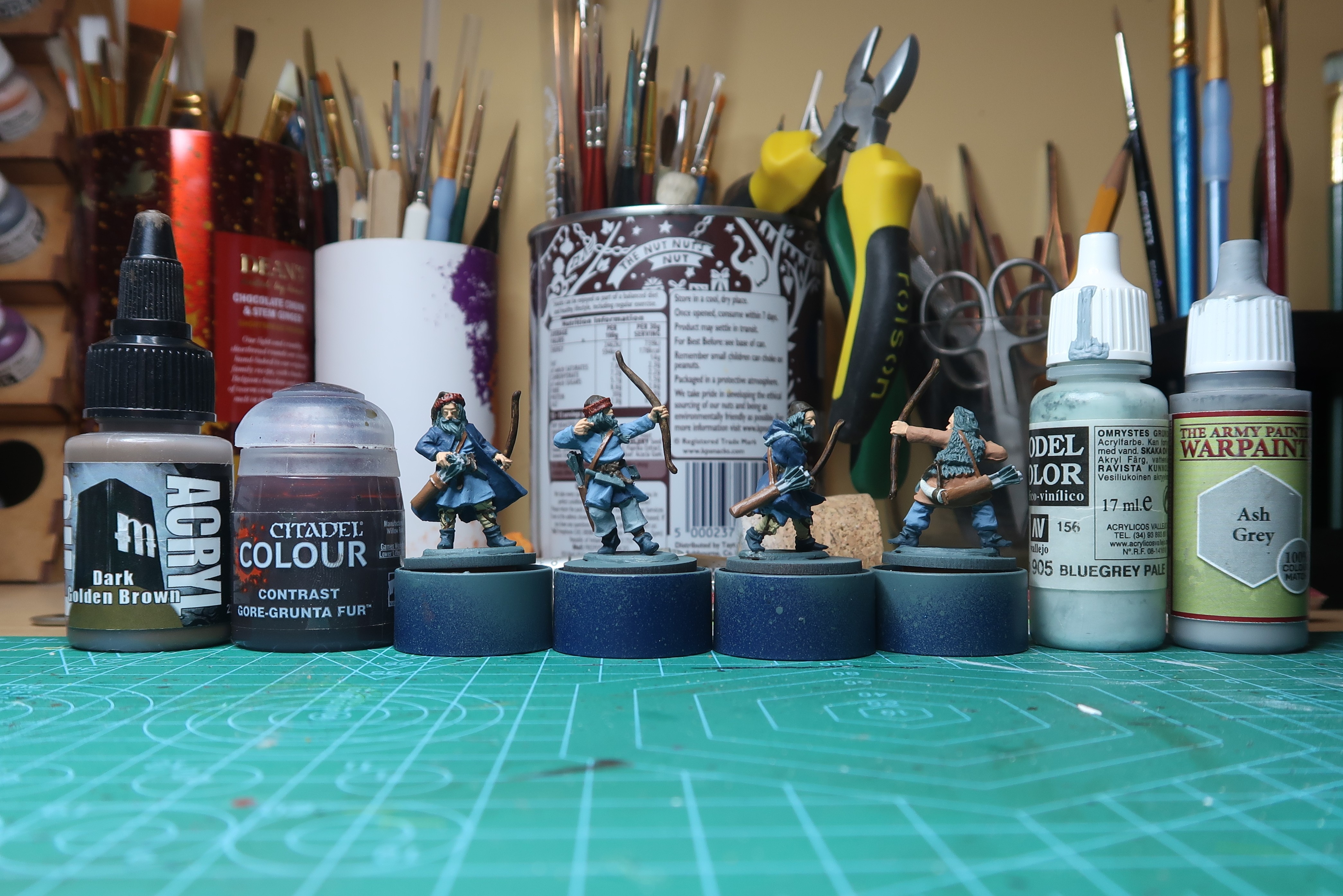 I still had some time on the clock so Ragnar and Agnes’s strapping on their leggings got some Dark Golden Brown (Pro Acryl) and the two hat fur bands got a coat of contract Gore-Grunta Fur (Citadel). Agnes seemed to have some sort of cowl/covering over his tunic so I painted it Blue Grey Pale (70.905) from Vallejo just to see if it worked for me. Everyone’s arrows got Ash Grey (Army Painter).