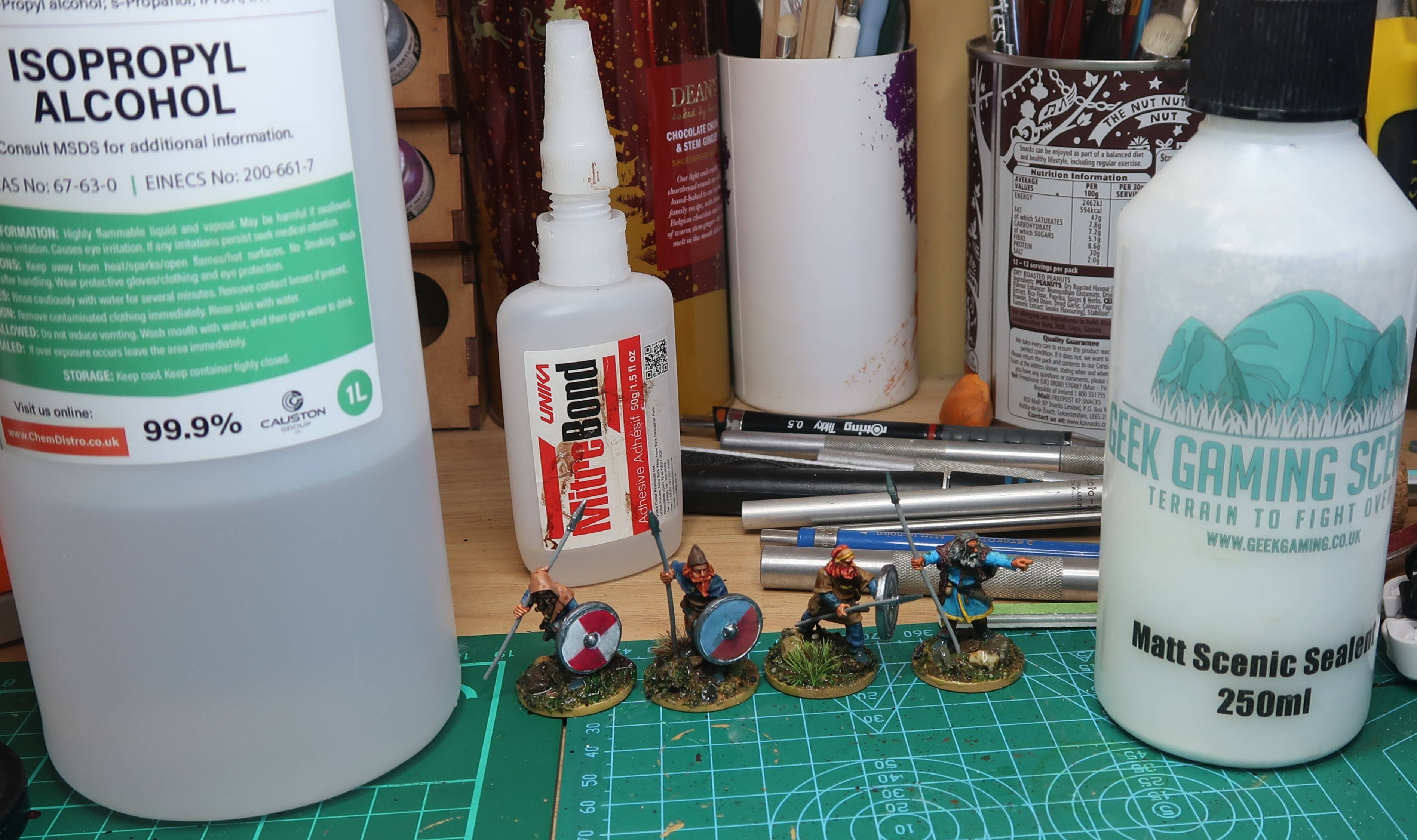 My bottle of Matt Scenic Sealant Spray (Geek Gamer Scenics) has stopped spraying so I use a dropper. I know the surface tension needs to be broken before I can apply it and, in the past, I have used isopropyl (95%) to do this. The down side is it leaches out the green parts of the base ready mix but I seem to remember Jerry saying he uses his at 75% so I mixed a squirt of Matt Scenic Sealant with a squirt of isopropyl and applied it directly – worked a treat, no leaching and after adding a tuft or two I had finished my first 4 figures in a long time (I will not say how long… not sure I can remember that far back).