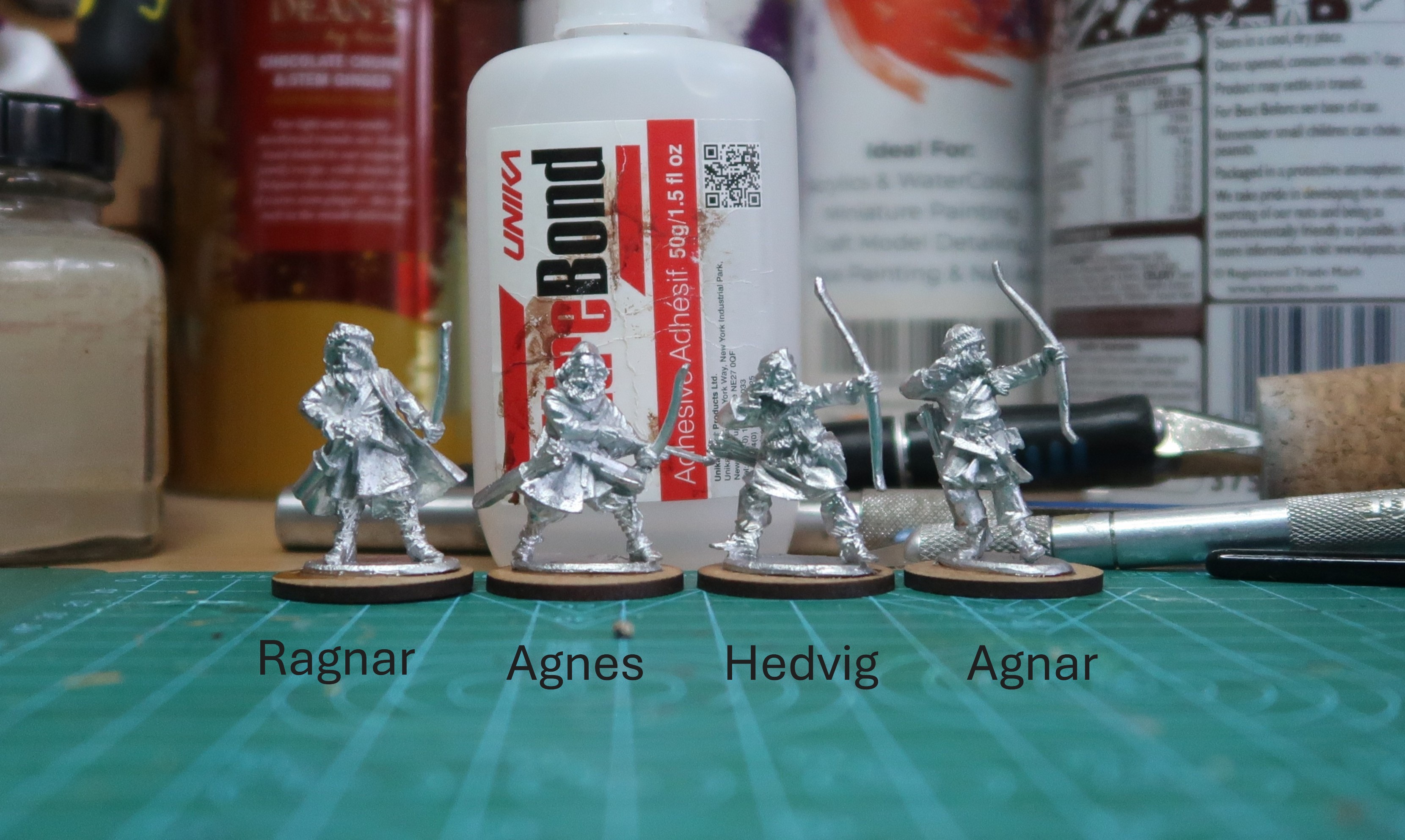 Rolling a D8 produced a 4, which on the sheet someone had kindly written out told me I was to now paint Bondi with Bows – MBV 110. They had already been nicely cleaned up, I suspect by the same person but it was some time ago, so with a final buff with a filing stick I glued them onto the supplied bases (good shot of the glue I used, poor shot of the figures… I will now start to watch YouTubes on how to take pictures and be more mindful about that I am doing, this might take some time).