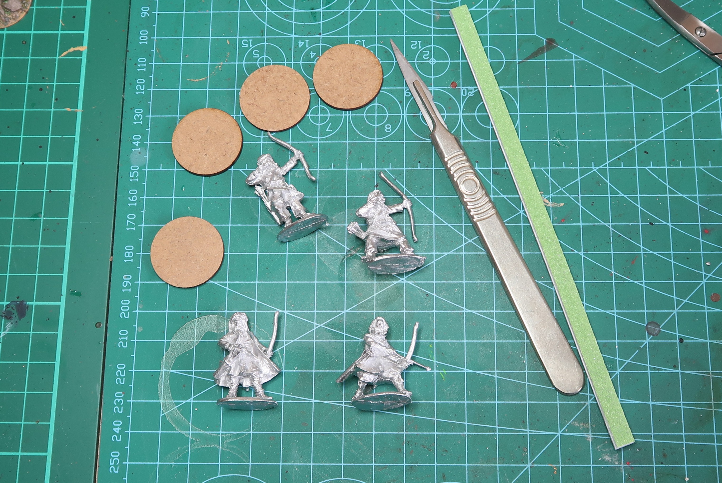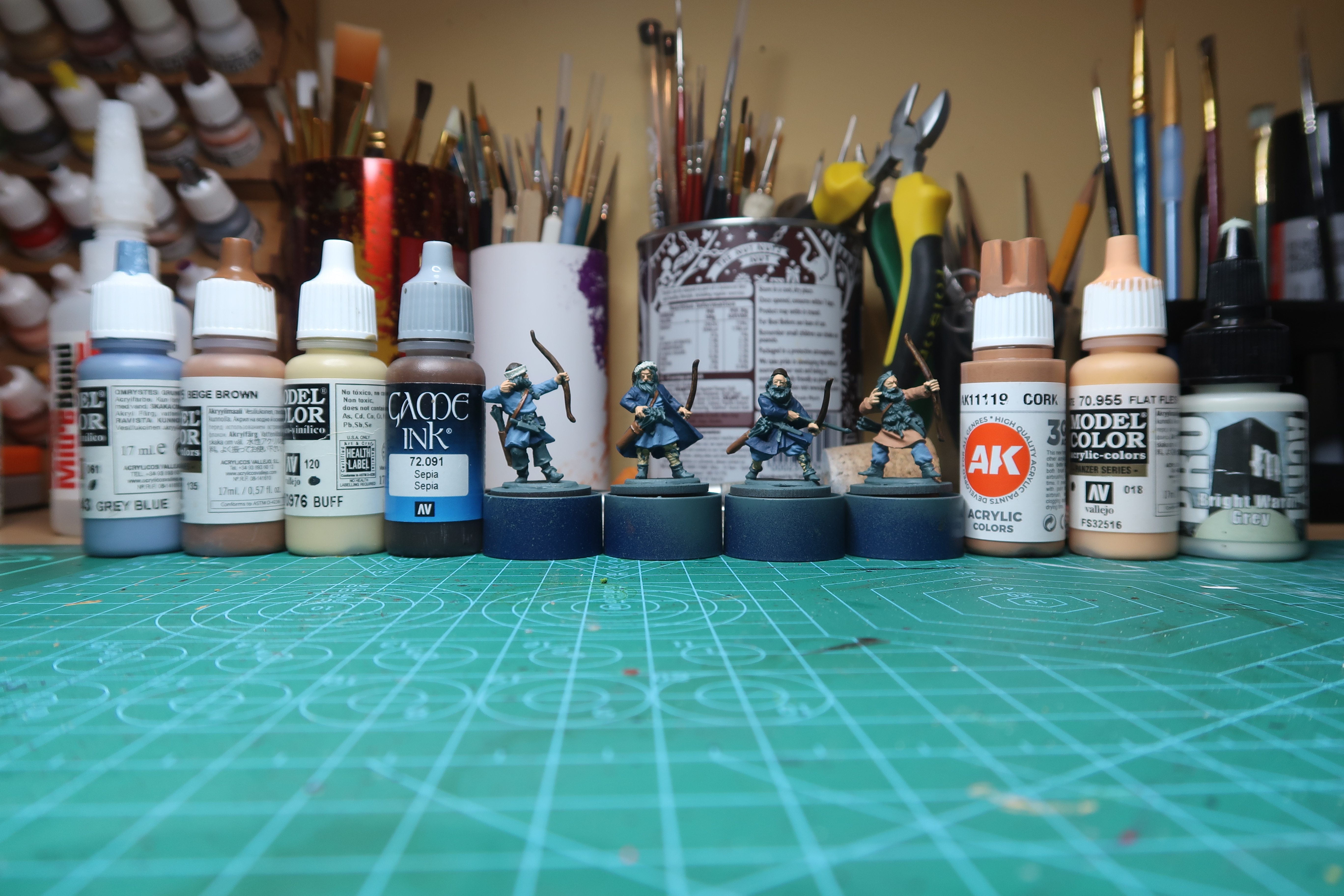 All quivers and leather work got Beige Brown (70.875) from Vallejo – which came out too glossy but I guess that can be fixed when they get varnished. Bows got Sepia Ink (72.091) from Vallejo and everyone got Flat Flesh v on the bit that looked like skin.