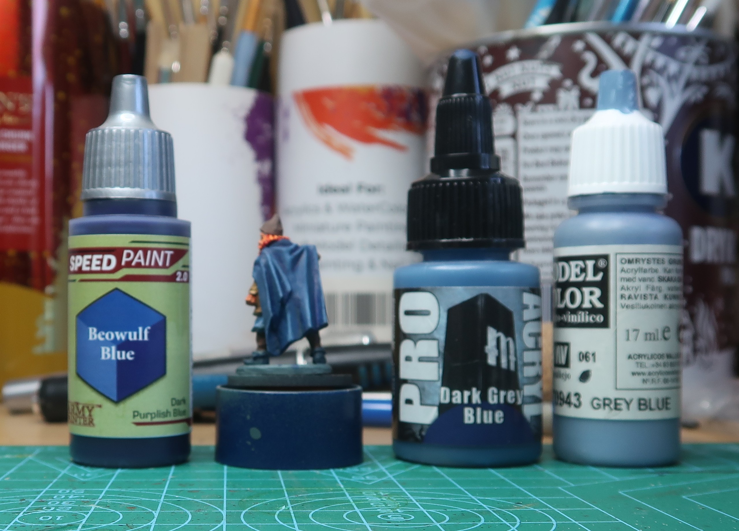 Today was family preparation day – people arriving tomorrow. Found 10 mins to try again a triad of blues for Ragnar’s coat (Dark Grey Blue (Pro Acryl; Grey Blue (70.943) and Blue Grey Pale (70.905) both from Vallejo); I do not think I am learning yet.