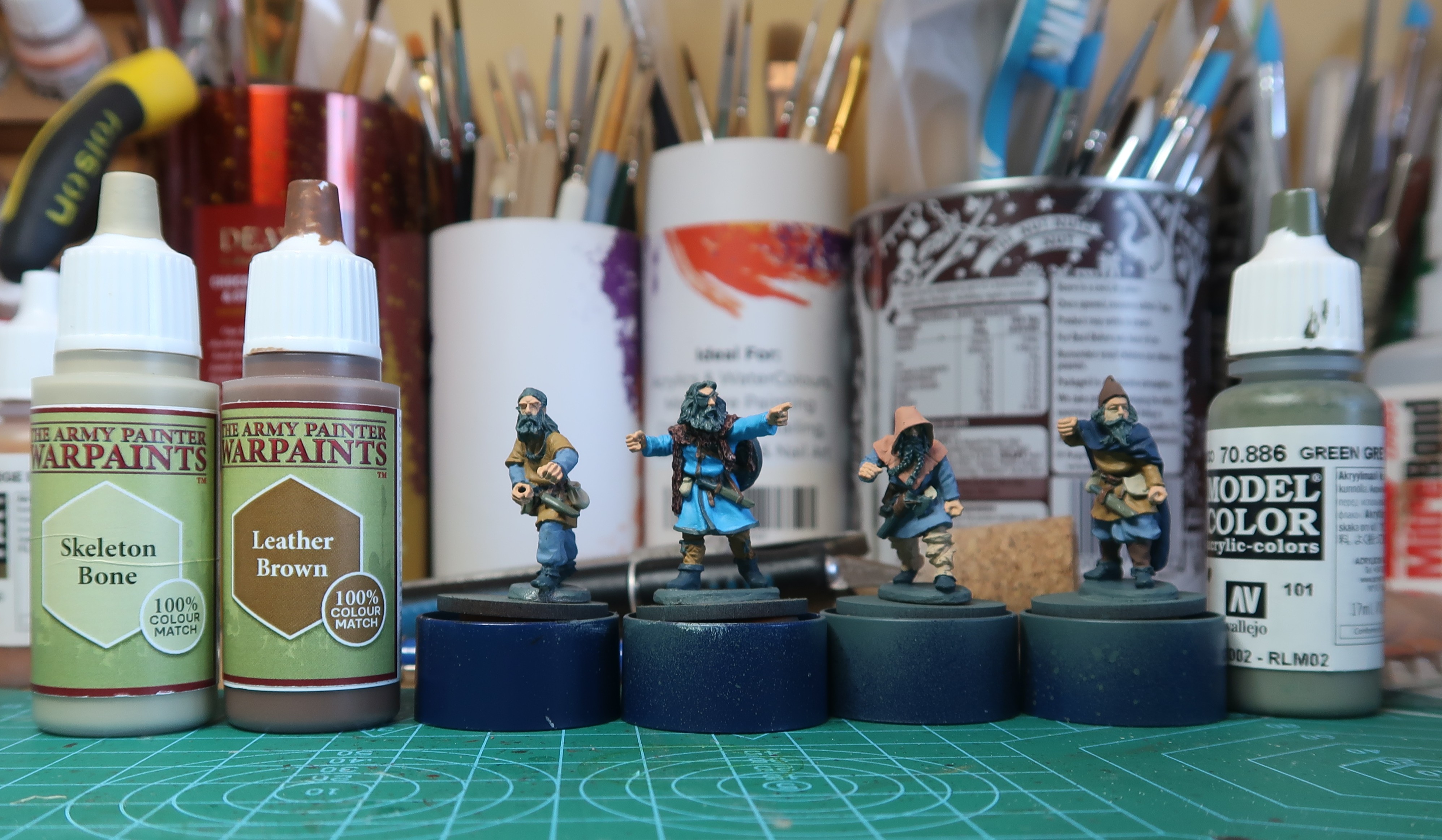 The whole team then got: Skeleton Bone (Army Painter) on their pouches; Leather Brown (Army Painter) on their bits of leather (including Sigrid’s hat) and Green Grey (70.886) from Vallejo on their scabbards. As an aside most of my paints are very old and many of them do not need (or take well) to thinning. None of this “two thin coats” or “thin your paints” crap here; the Leather Brown is a good case in point – shook the living daylights out of it, vortexed it until I could not feel my hand and then shook it again… came out like watered down water and took several coats to cover the primer (I suspect it is user error… it normally is).