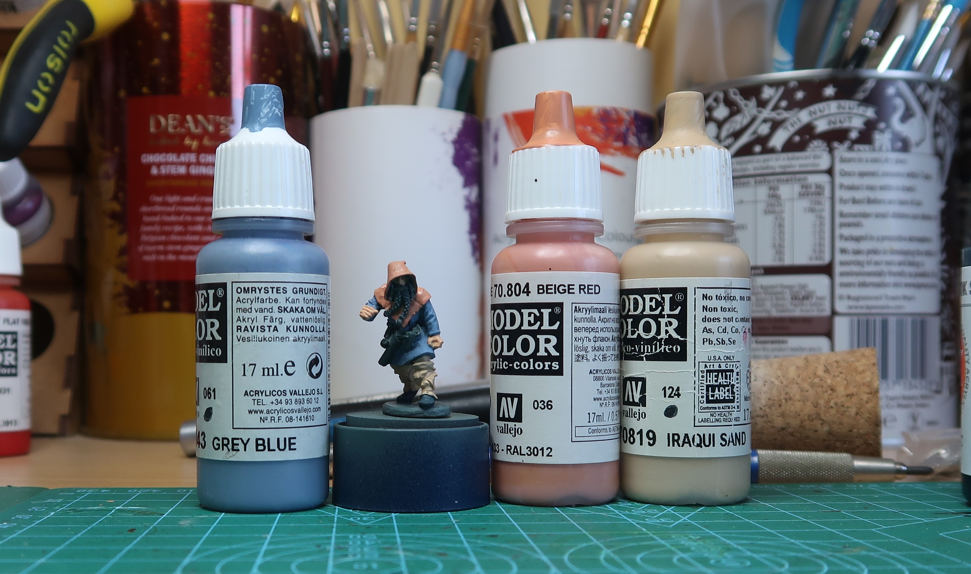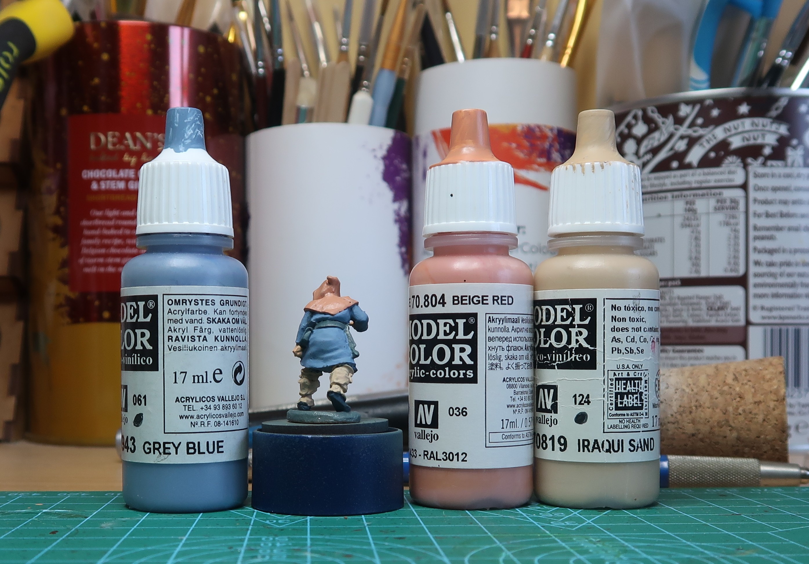 Gunnar’s top was panted Grey Blue (70.943); hood Beige Red (70.804) and leggings/wrap Iraqi Sand (70.819) all from Vallejo.
