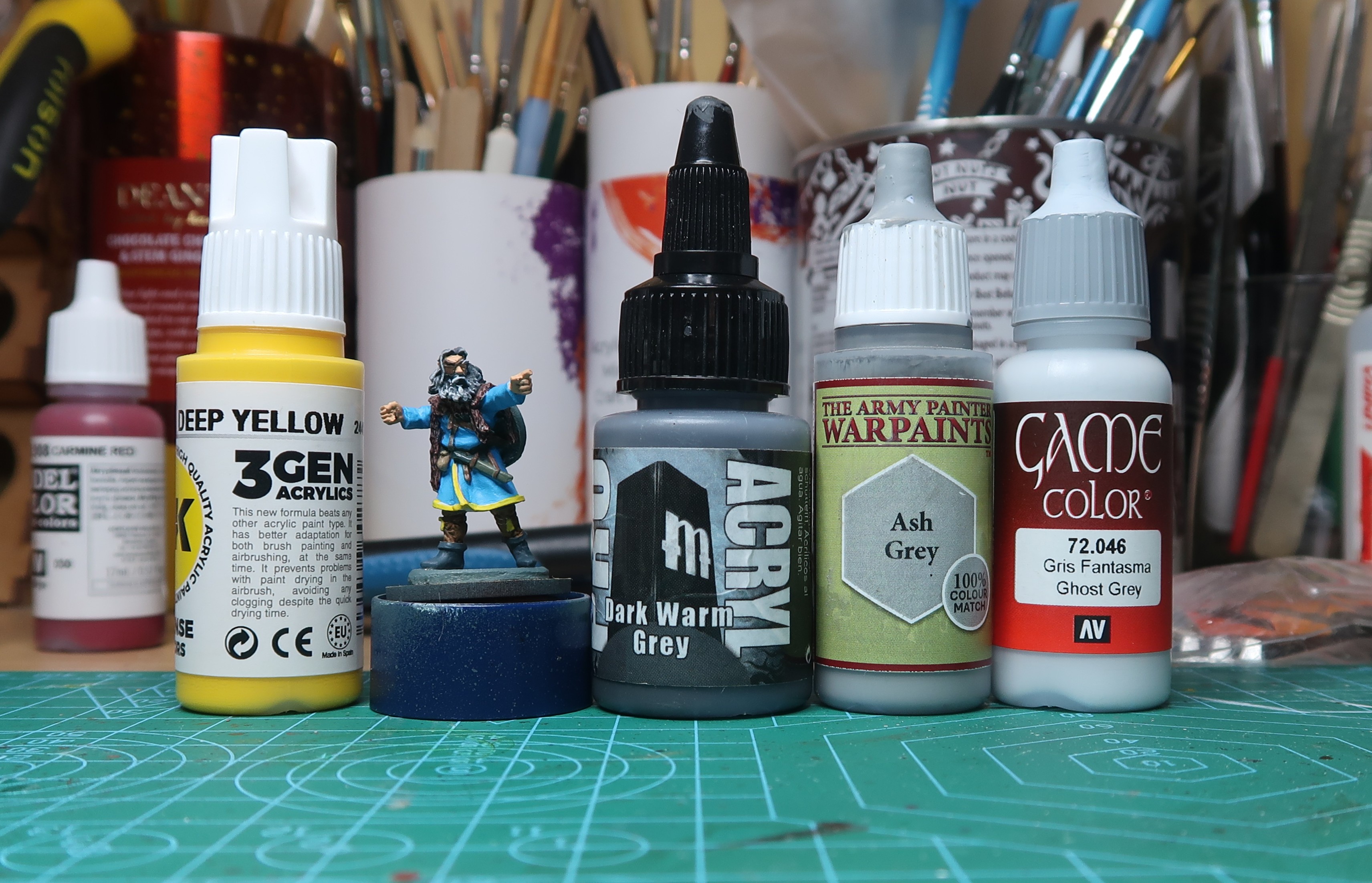 Harald got some Deep Yellow (AK) trim to his cloak and then I decided he was “older” so base coated this hair with Dark Warm Gray (Pro Acryl) then painted Ash Grey (Army Painter) and highlighted with Ghost Grey (72.046) from Vallejo. On paper it should have looked a lot better than it did… I will try to learn from this.)