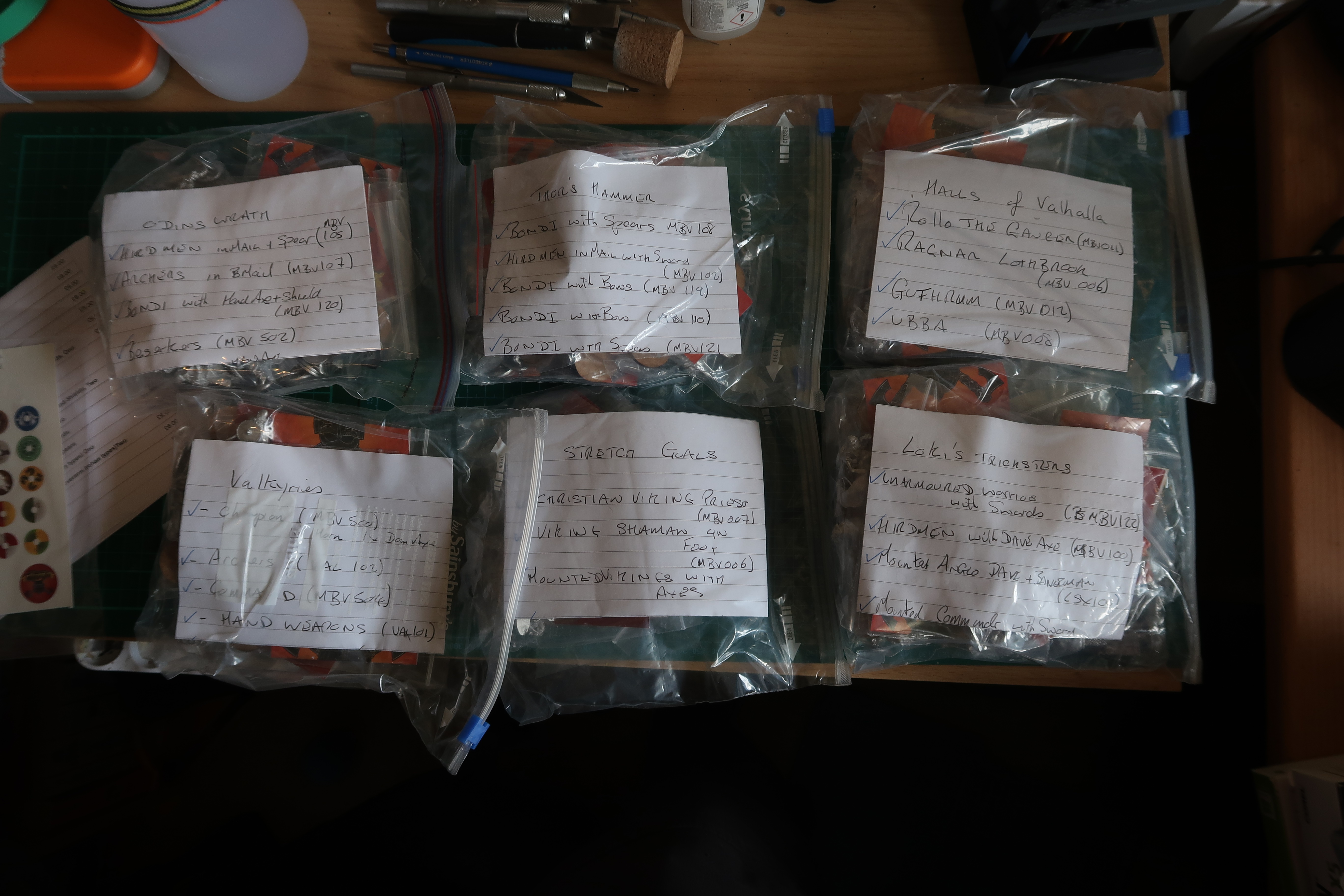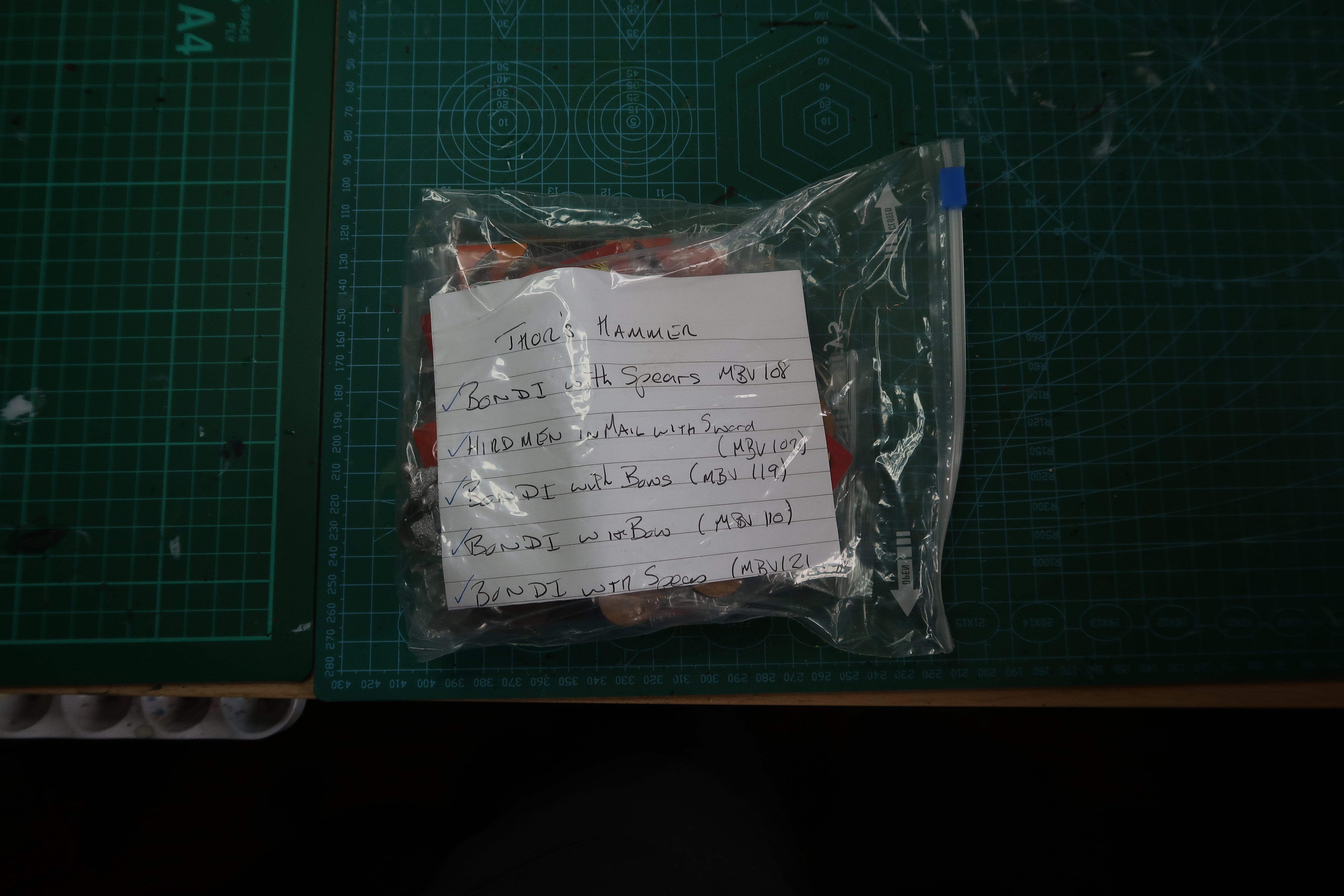 Unsure what I wanted to do I decided to let the Dice Gods decide, rolled a D6 and got a 2 so it is Thor’s boys… so out with the blue type paints and watch some YouTubes on red hair. It seems the same person who put them into factions also split them up into groups (must buy that person a beer some time, as I have no memory of doing this). Eight smaller bags so I rolled a D8 and got a 2 (if I had been a bit brighter I would have noticed the same person had also written the contents of each bag on to a sheet of paper… this person must have been a genius) so it is Bondi with Spears – MBV 108.
