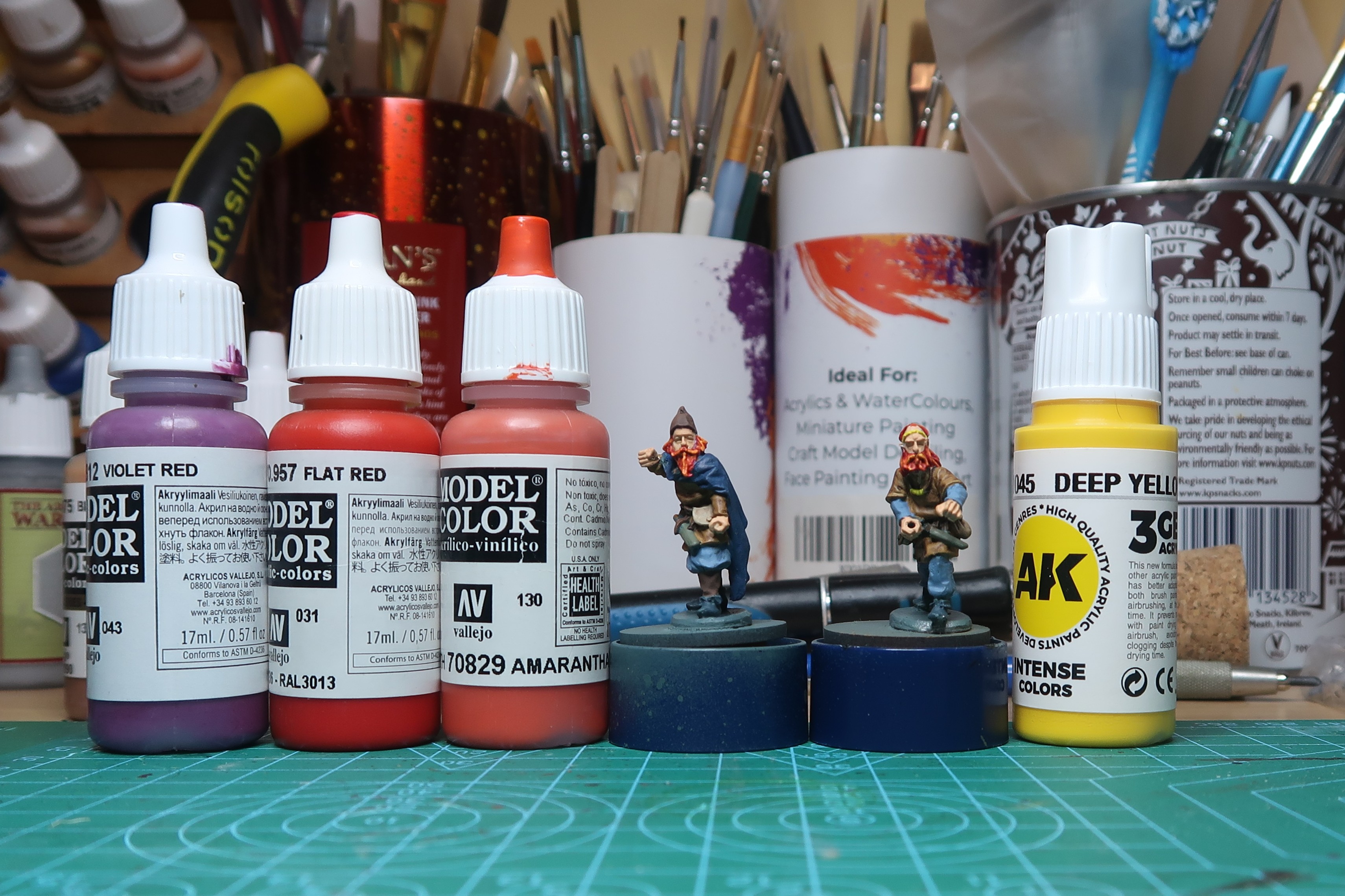 I found a “recipe” for red/ginger hair from YouTube (52 Miniatures) so Sigrid and Leif got to try it out. Violet Red (70.812) in the deepest parts, then Flat Red (70.957) for the base hair followed by a good covering of Amarantha Red (70.829) and highlighted with a mixture of Amarantha Red and Deep Yellow (AK). Once again it looks nothing like how it was on YouTube but I will learn. Leif also got a bit of Deep Yellow (AK) on this neckless and headband.