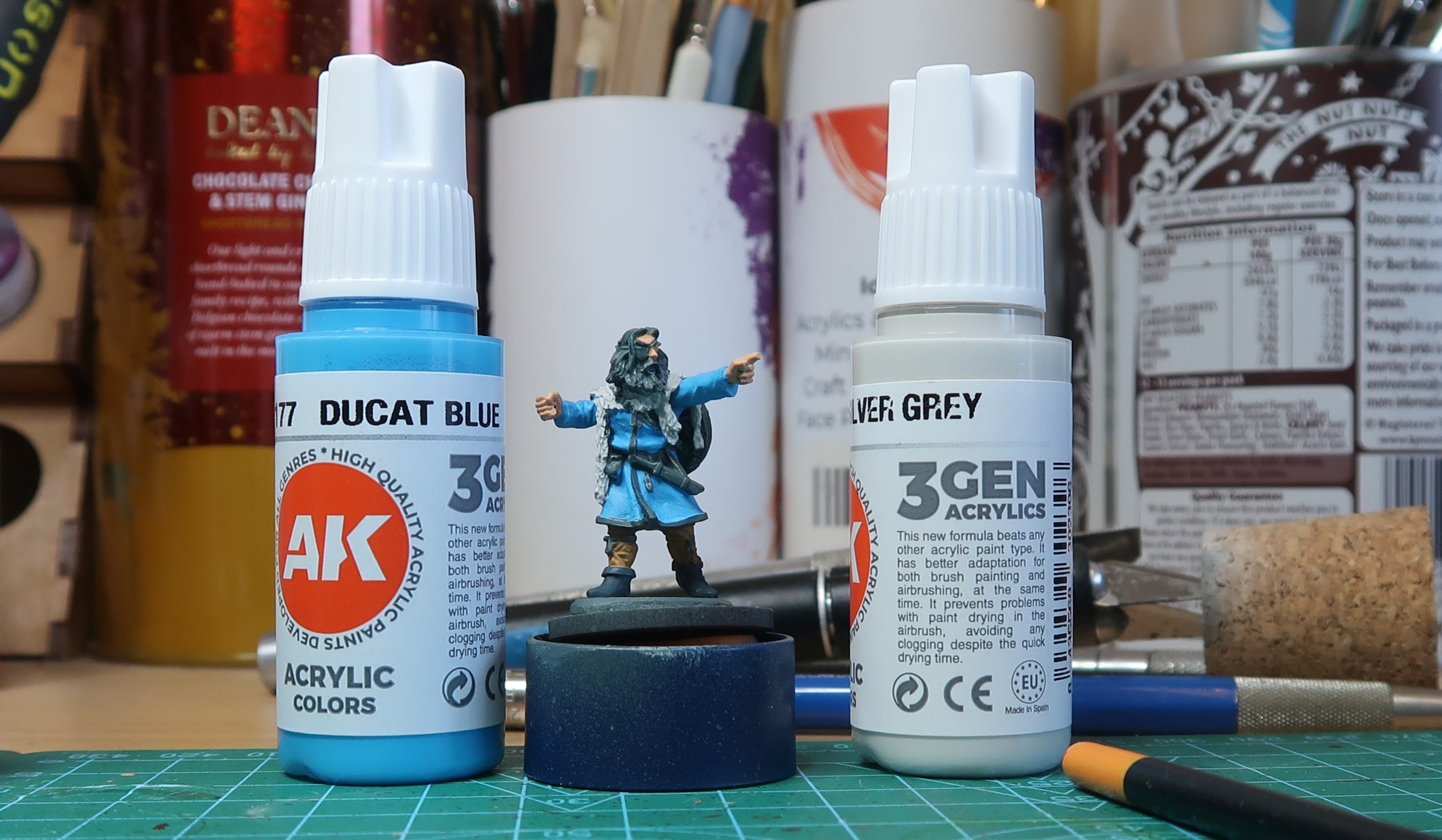 Harald got Ducat Blue from AK on his cloak and he seems to have an animal pelt so I painted it Silver Grey from AK so I could use Ruddy Fur from Army Painter on it.