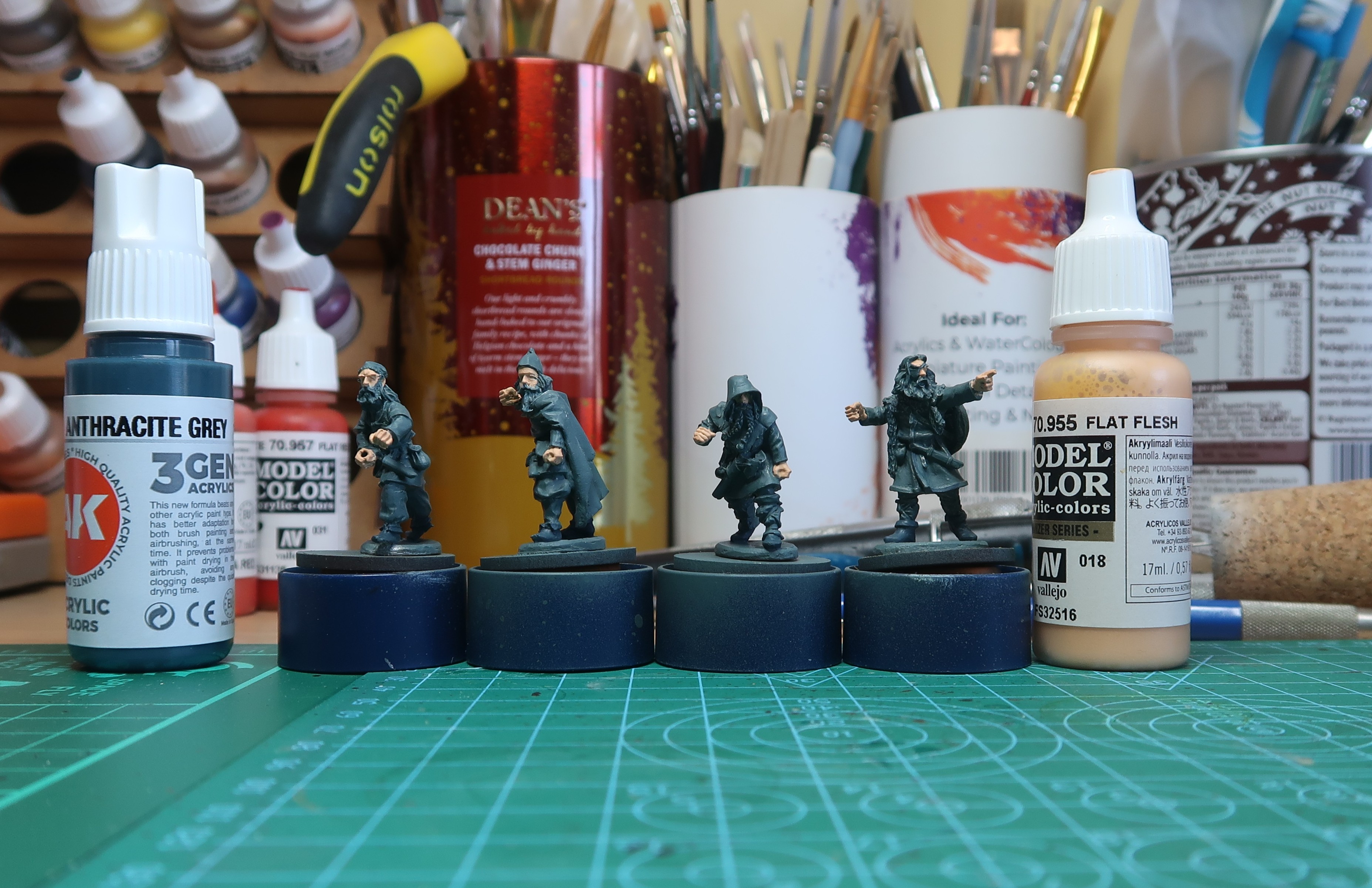 Boots got Anthracite Grey from AK (looked just a little darker than the Mechanics Standard Grey and when dried I could not tell the difference) and faces got Flat Fresh (70.955) from Vallejo.