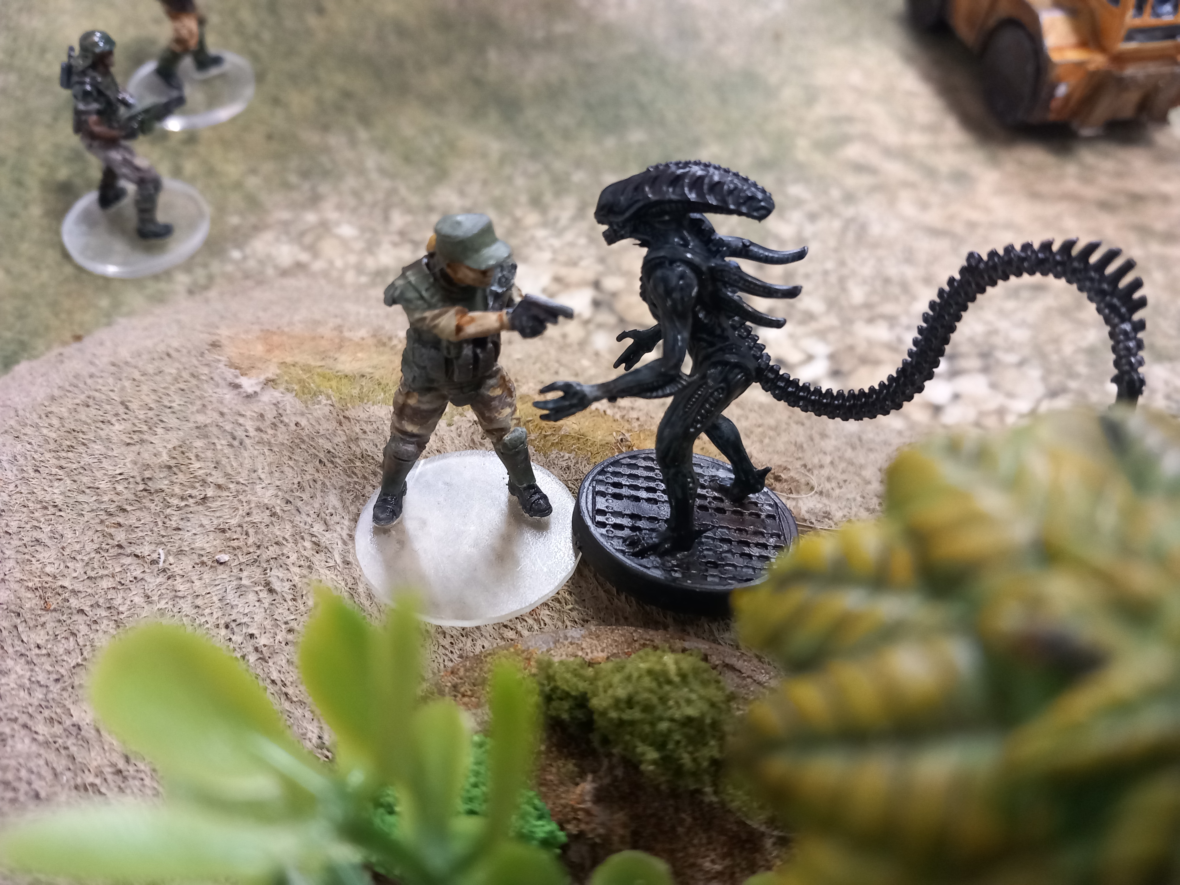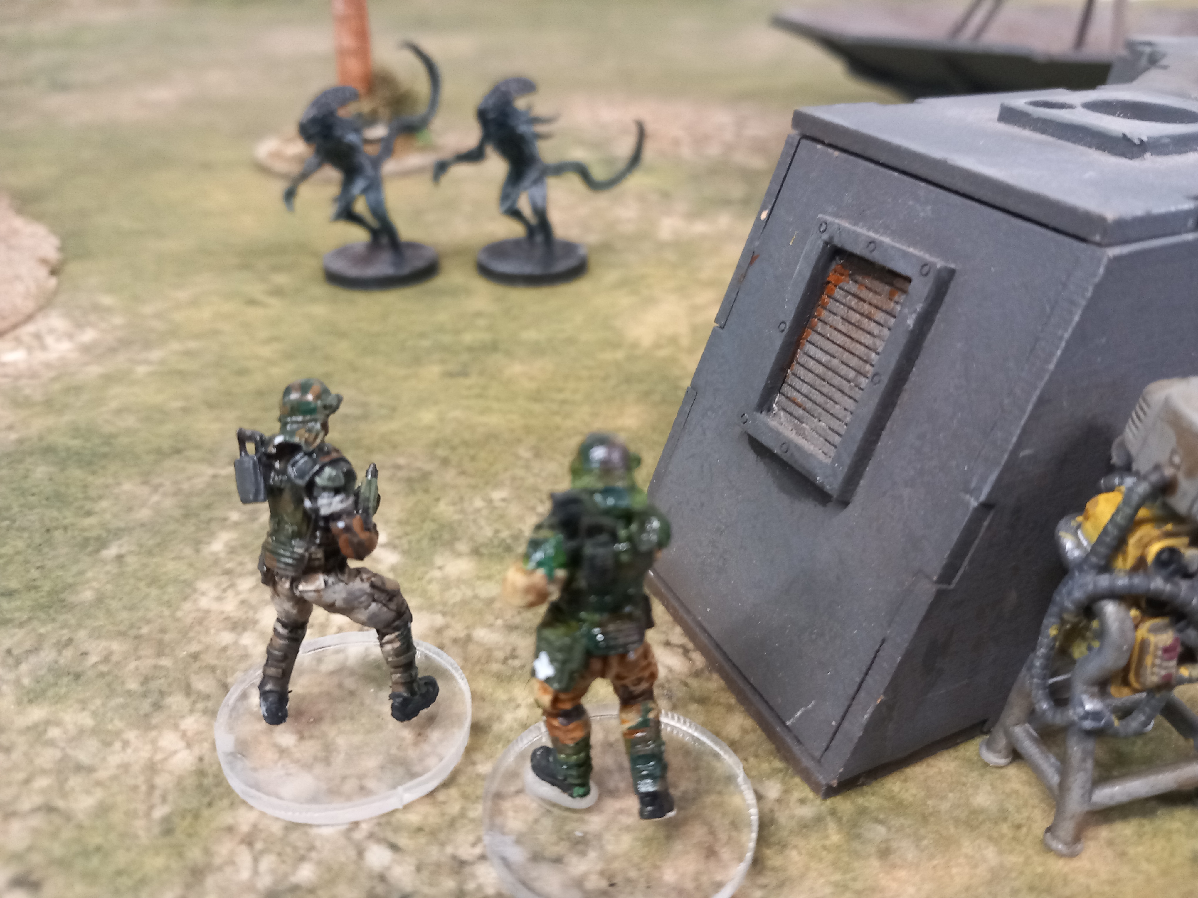 Sgt Beck gets close enough to activate a cargo hauler which moves back and forth distracting the xenos from approaching