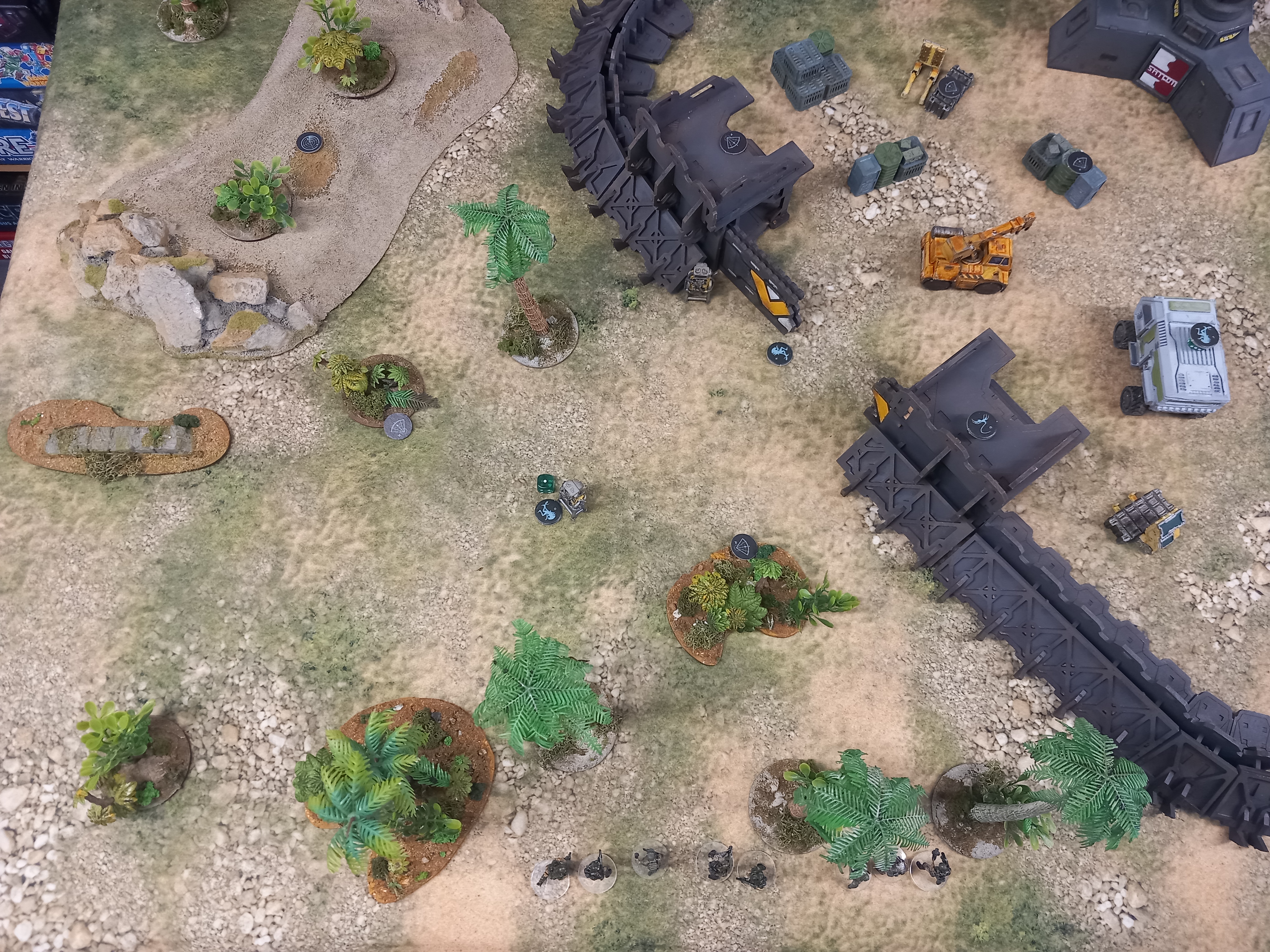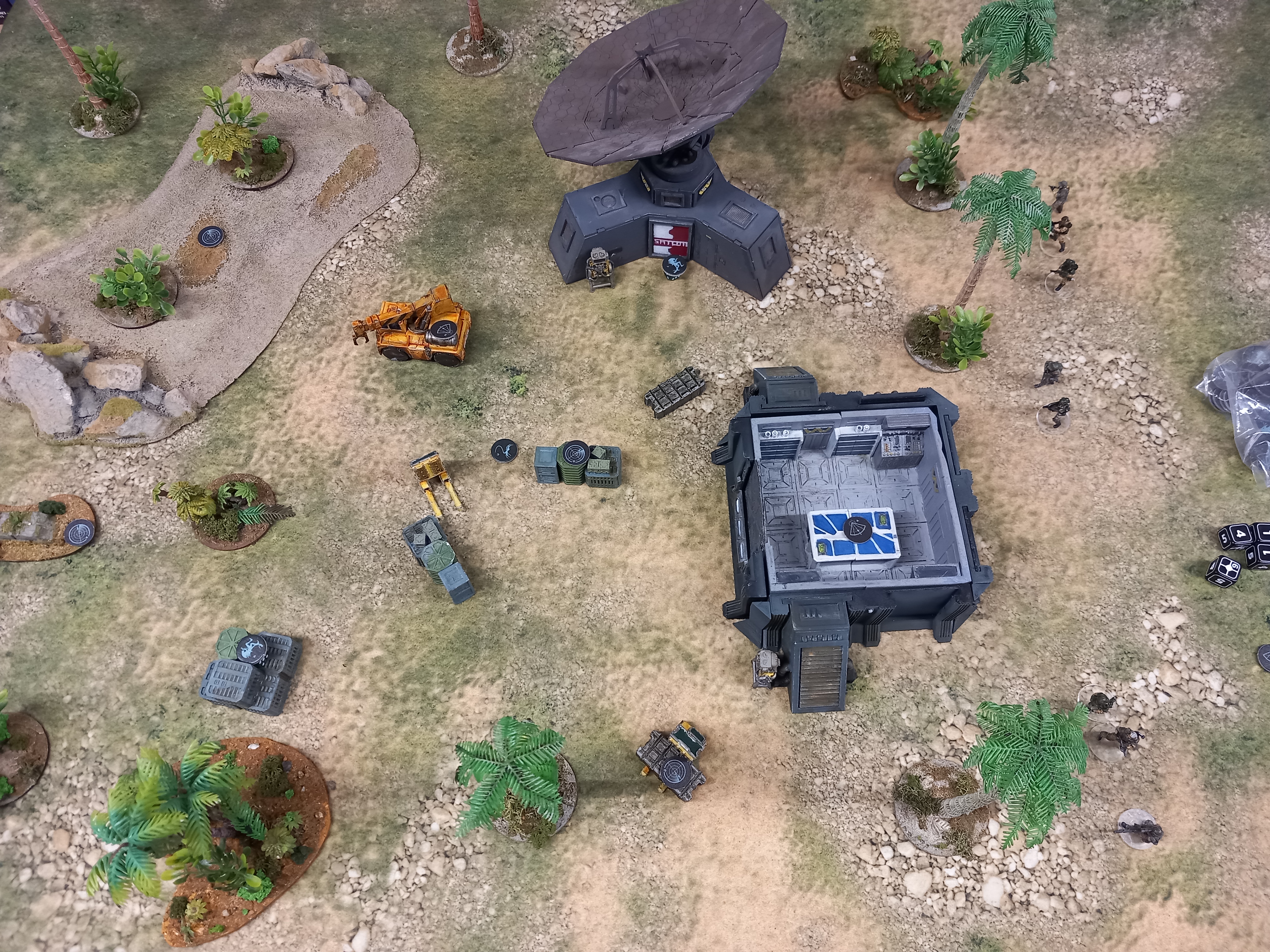 Comms have gone down on the tropical world of LV4-76 known as Brierleys world. The planetary Marine garrison has sent a squad to survey Comms tower ten. For a game of Bughunt 6 dice are positioned around the board numbered 1 to 6. Three dice are rolled to indicate which ones are objectives. Each objective is rolled for to discover mission parameters. Command want the hill scouted. The cargo stack needs securing and ghe beacon reactivated. Also on the board are 6 random locations which can be discovered. Unfortunately there are motion blips on each objective that may reveal something nasty.
