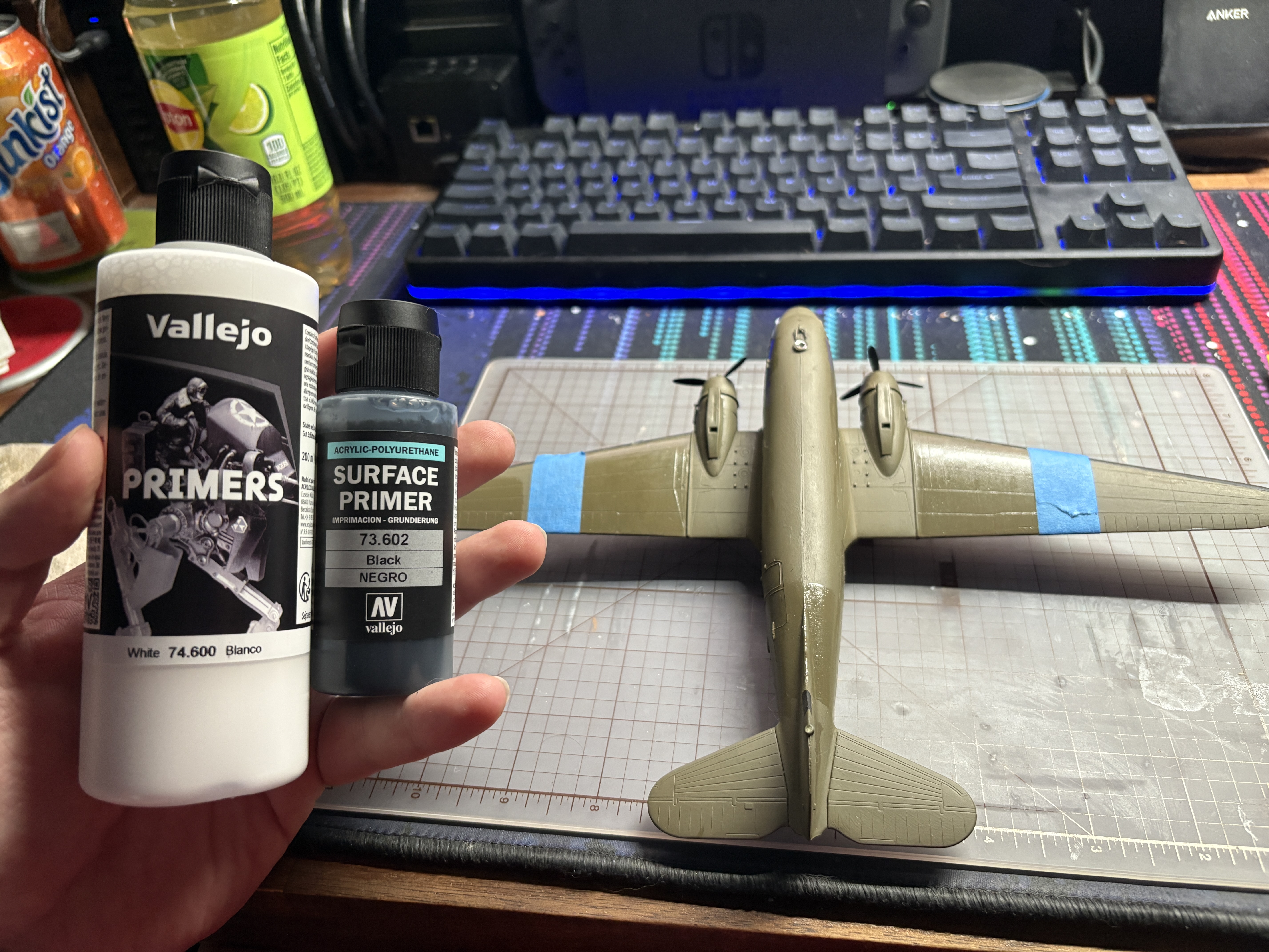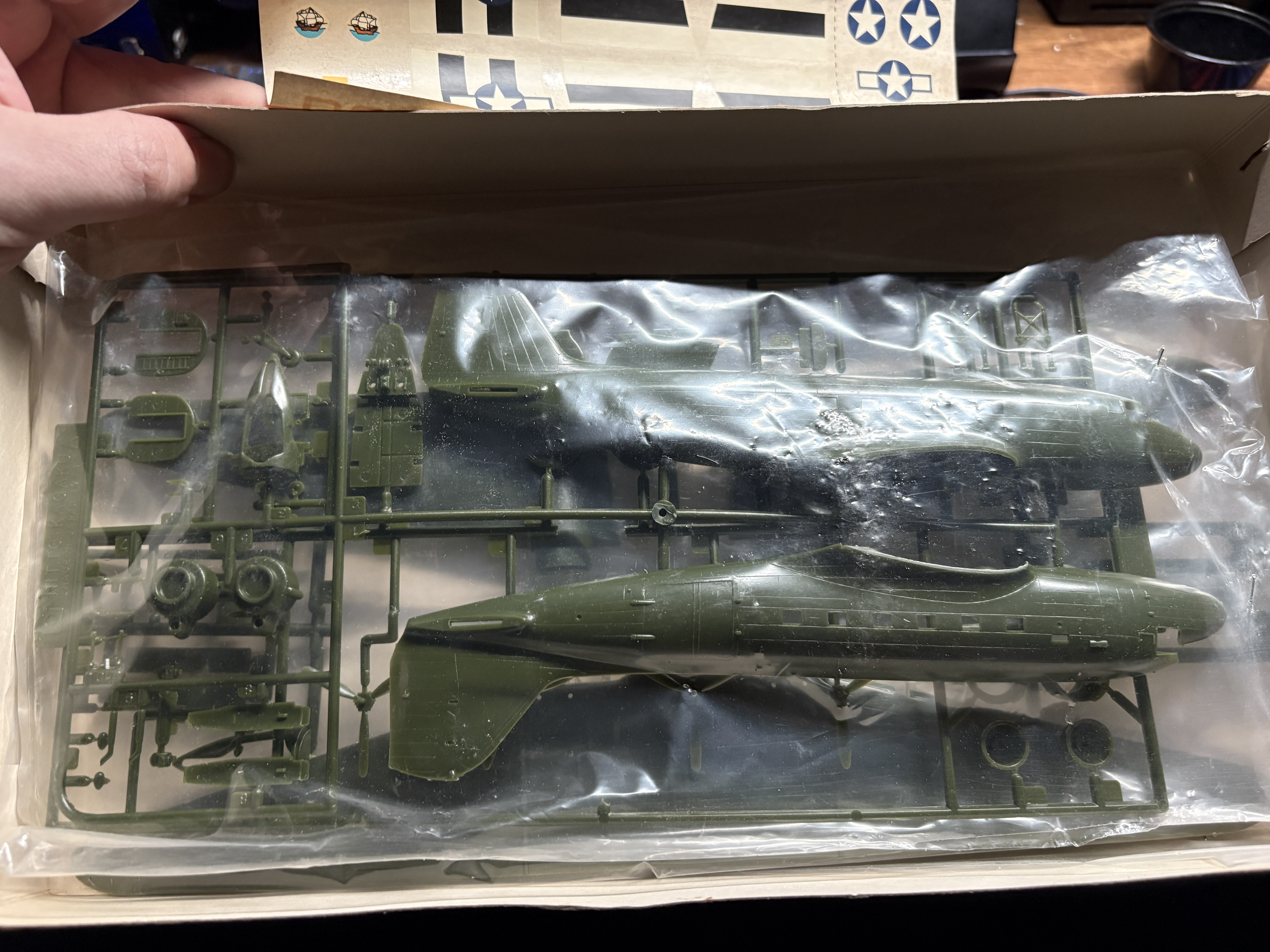 Given the age of the model all of the components are still in great shape. I question if the decals will still work but I’m going to give them a shot anyway. I didn’t take pictures of the assembly process as since this is a model plane first there are a lot of small detail pieces like a cockpit you can’t see from inside the plane with individual seats. You can’t see them but I assure you they are there. I primed the pieces while they were on the frame still with Vallejo Olive Drab spray primer. It left a very coarse texture but that should mean paint will stick to it better. After that I put all the bits together and this was the end result.