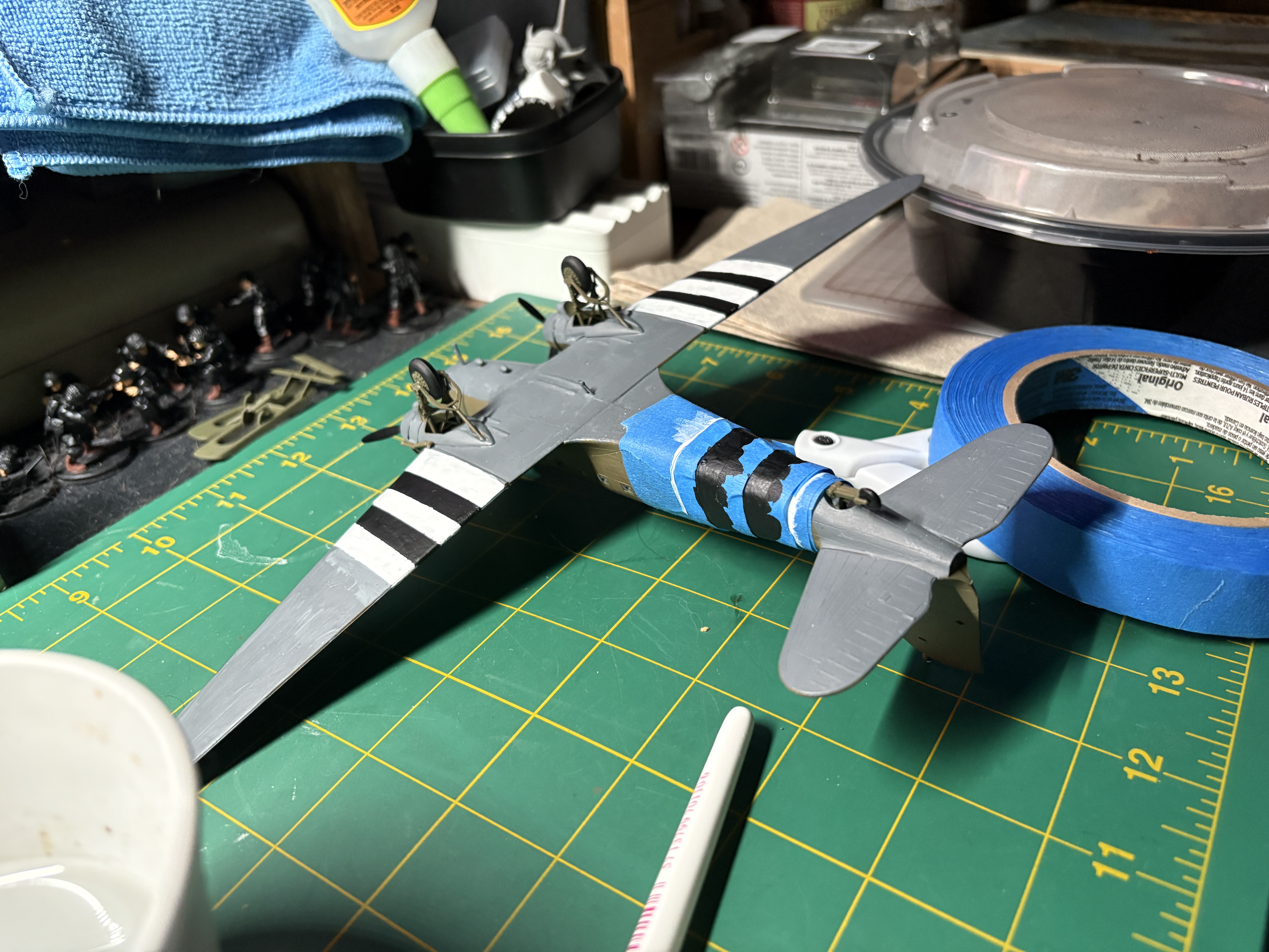 Time to fall back on blue tape and a steady hand. I cut one of the remaining decals to shape and make some pencil marks on the plane to see where I need to start masking. I mask up the edges and paint white over the whole section. Several coats of white later I finally got the look I was after. Upon the paint drying I masked off again for the black stripes.
