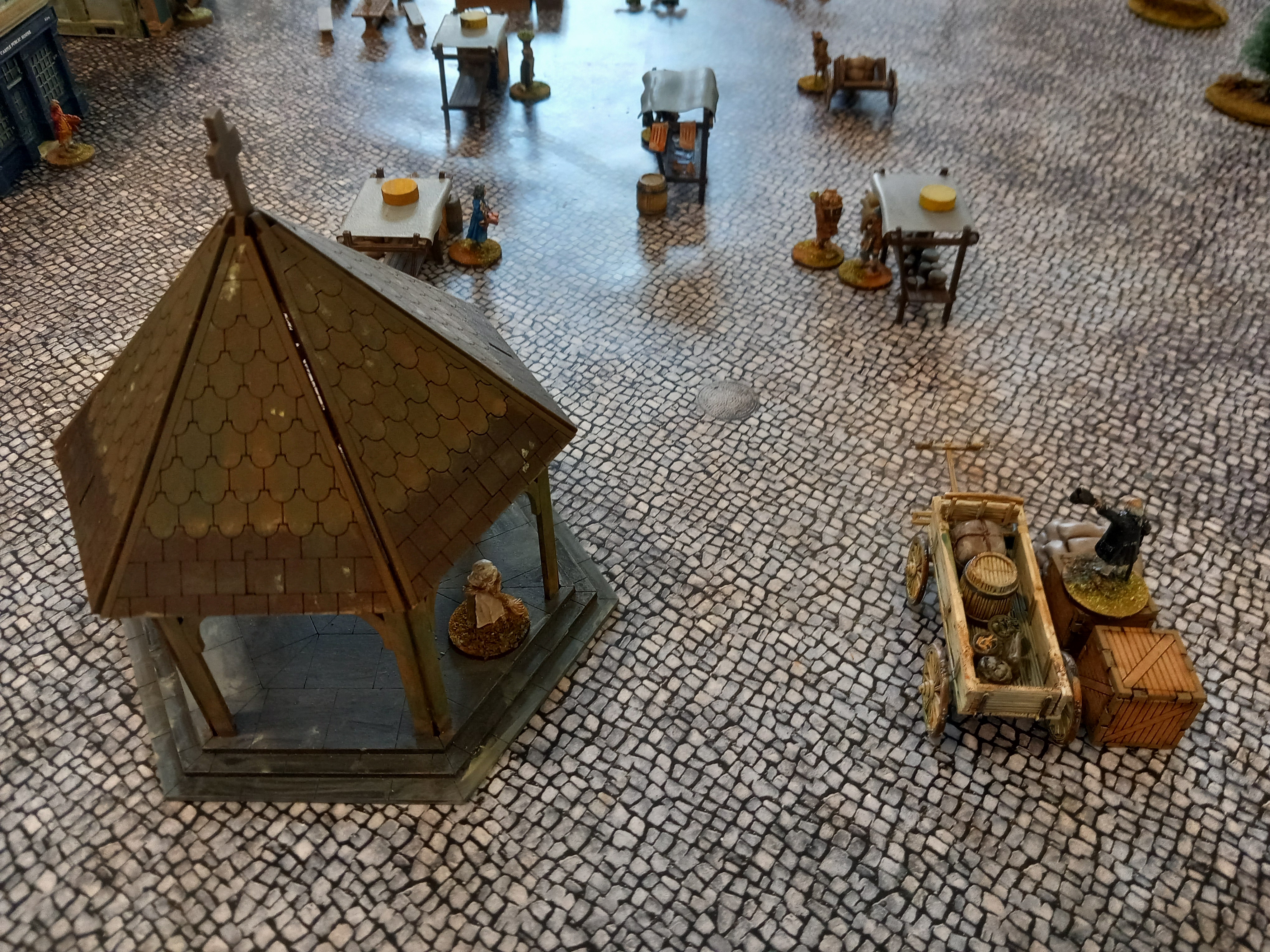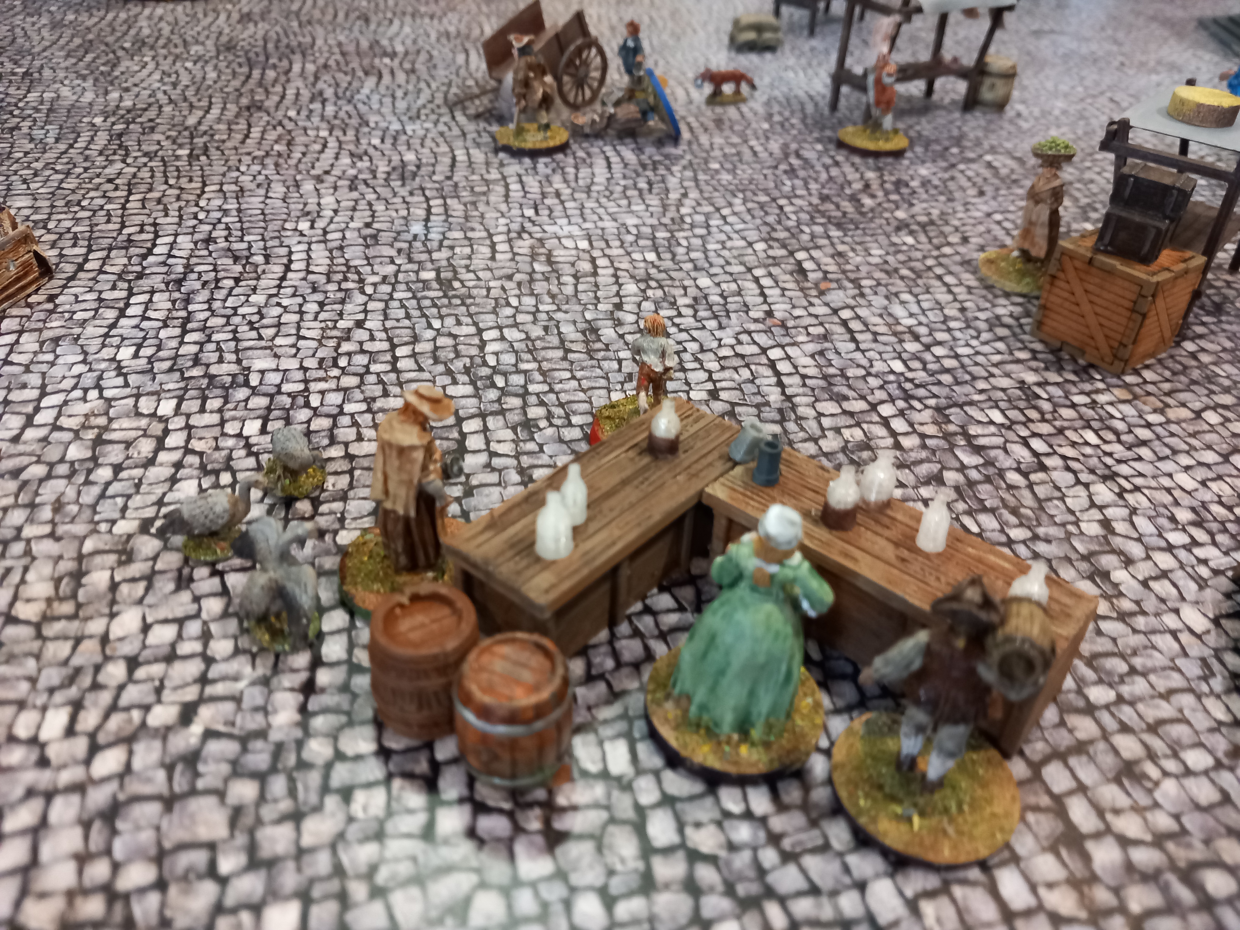 A couple of years ago I completed my previous cheese riot project that charted the creation of a game designed to recreate the events in Nottingham in 1766 when cheese prices led to a couple of days of rioting. Cheese was stolen and rolled away, the mayor knocked down by a rolling cheese while appealing for calm. Dragoons were called in and a man was killed by friendly fire. All this took place in the Nottingham market square during the annual goose fair. In my game each team of players control a duo of minis representing the women and "rude boys" who historically took part in the looting. The aim is to take a cheese counter from as many market stalls as possible and get it off the table. Each stall is defended by an angry merchant who must be overcome before any chees can be taken. At some point the mayor will turn up and read the riot act and call in the dragoons to restore order. My original game was just for colleagues but now the public are going to be involved so Ive had a look at the rules that need to be made clear.