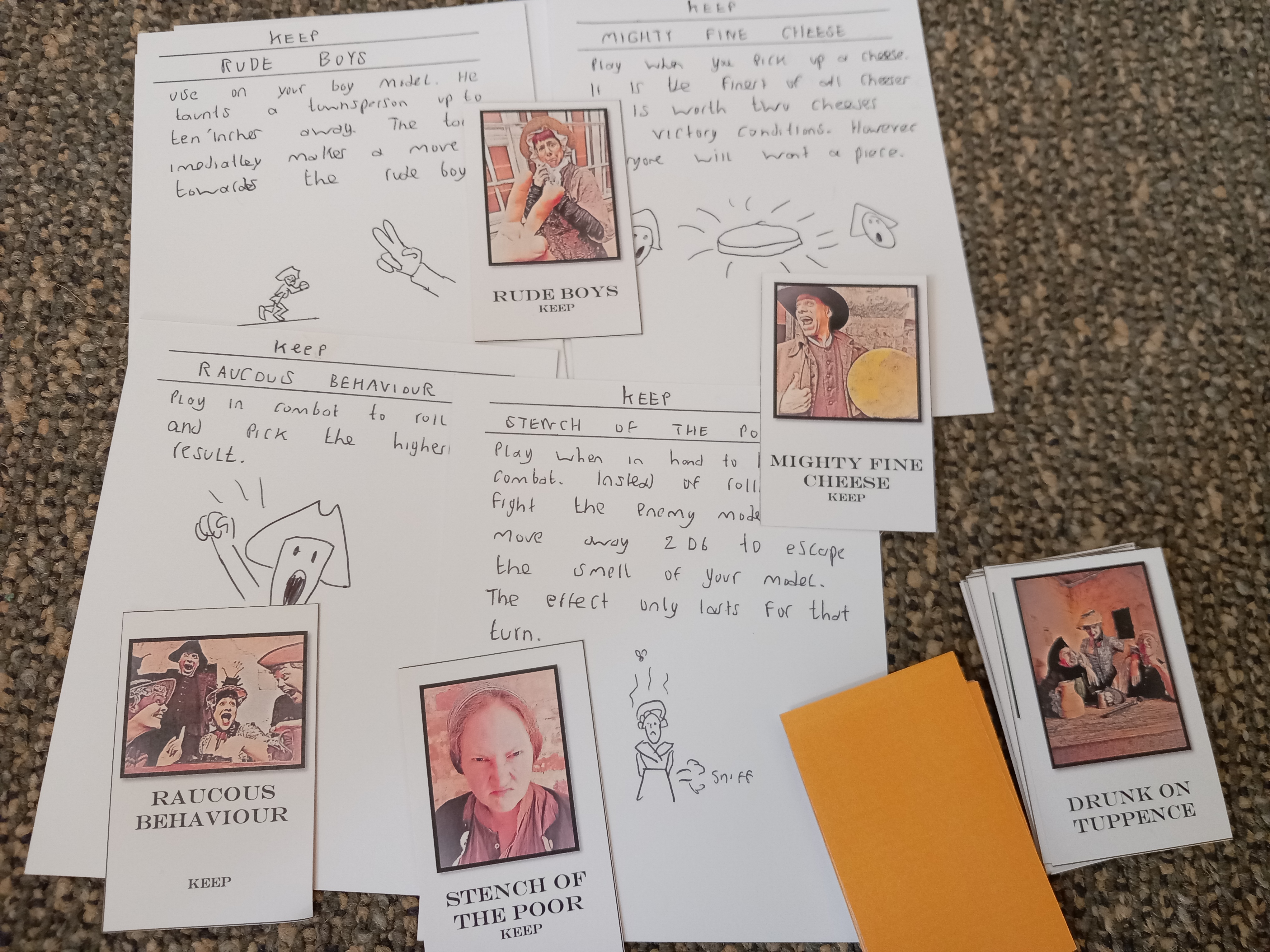 My previous event cards were just hand drawn on bits of paper. I went back and got some images and a few shots with friends dressed up to recreate events from history or just likely funny incidents. The cards are played during the game to help or hinder players.