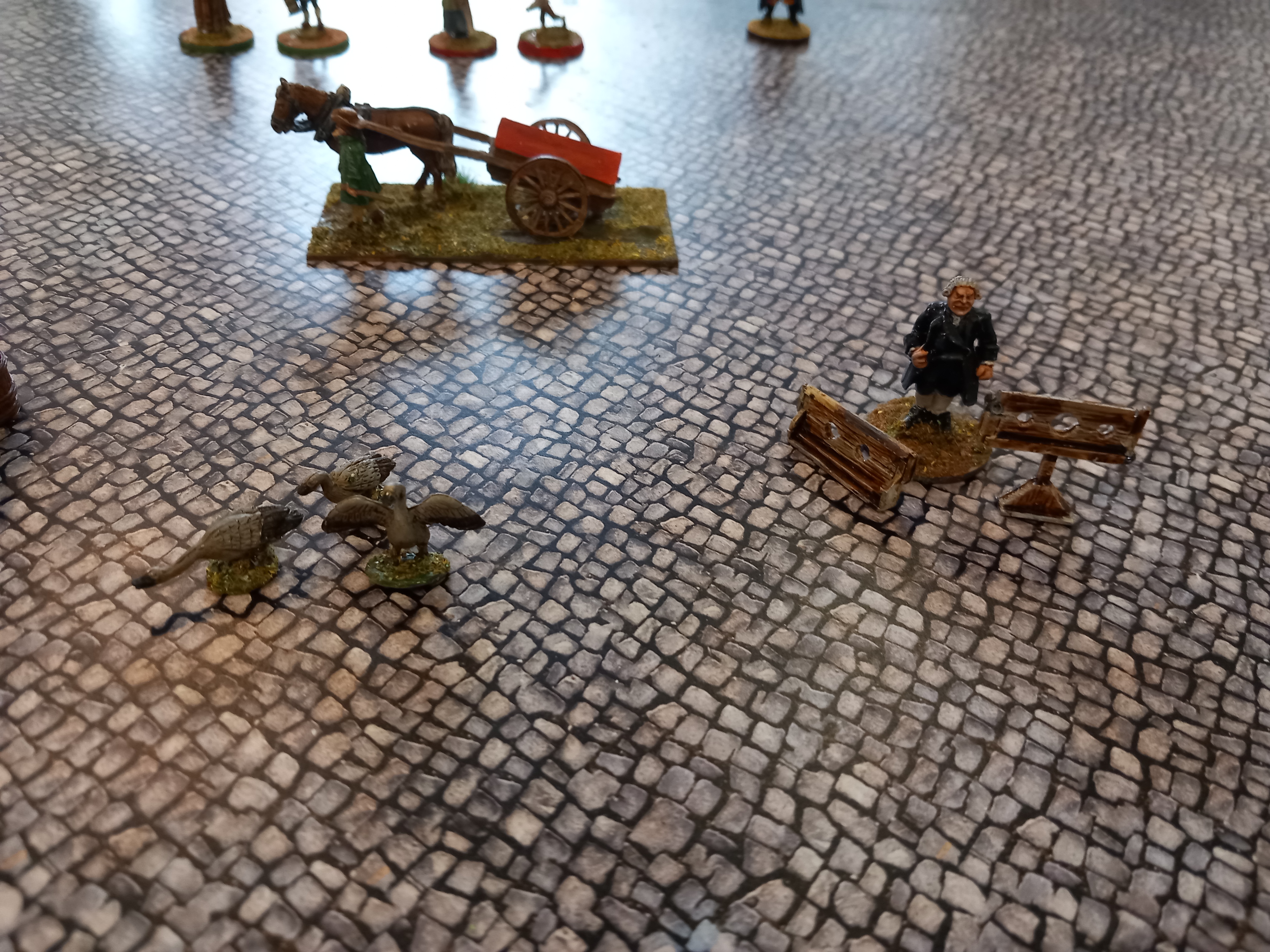 The board lay out. 4 cheese stalls with butcher in the middle. Other areas are the malt cross which Dragoons can't enter. The Lincoln merchants wagon. The gin stand and stocks. One team ended up in the stocks early in the game and failed to get a card go escape. We thought maybe those captured have to spend a number of turns locked up instead