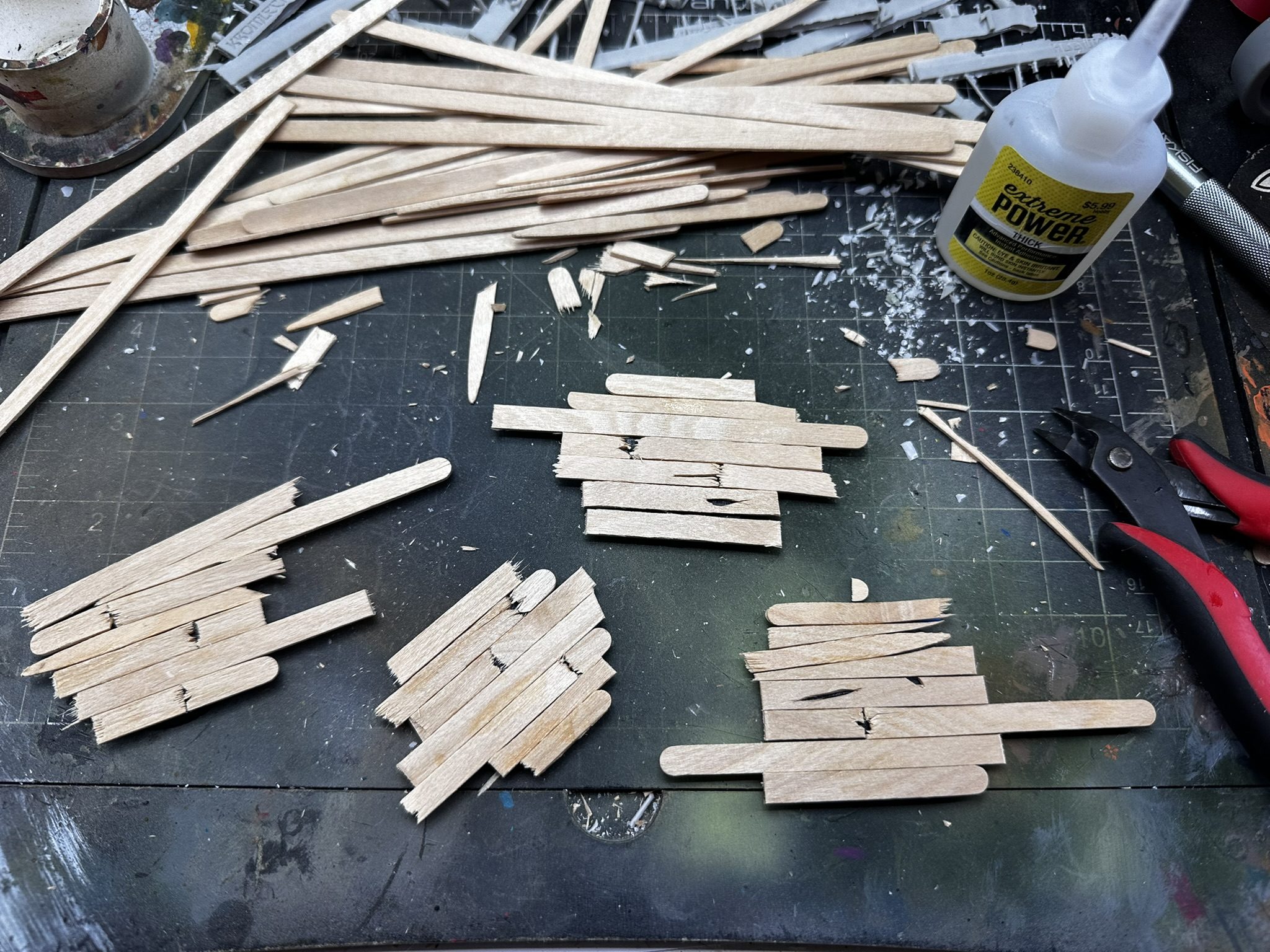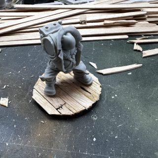 I used some coffee stirs that I picked up somewhere. I started by gluing them down to the bases and leaving them long. I wanted some variation and damage, so I offset the plank ends and dug some holes out of the centers of a few. Once I got one base completely covered, I flipped it over to the bottom and scored the overhangs close to the rim and broke them off. This gave me a rough end look, and I used my xacto to damage them some more. I cut some lines into the surface planning on using contrast to stain the wood. After a dry fit, I did this four more times.