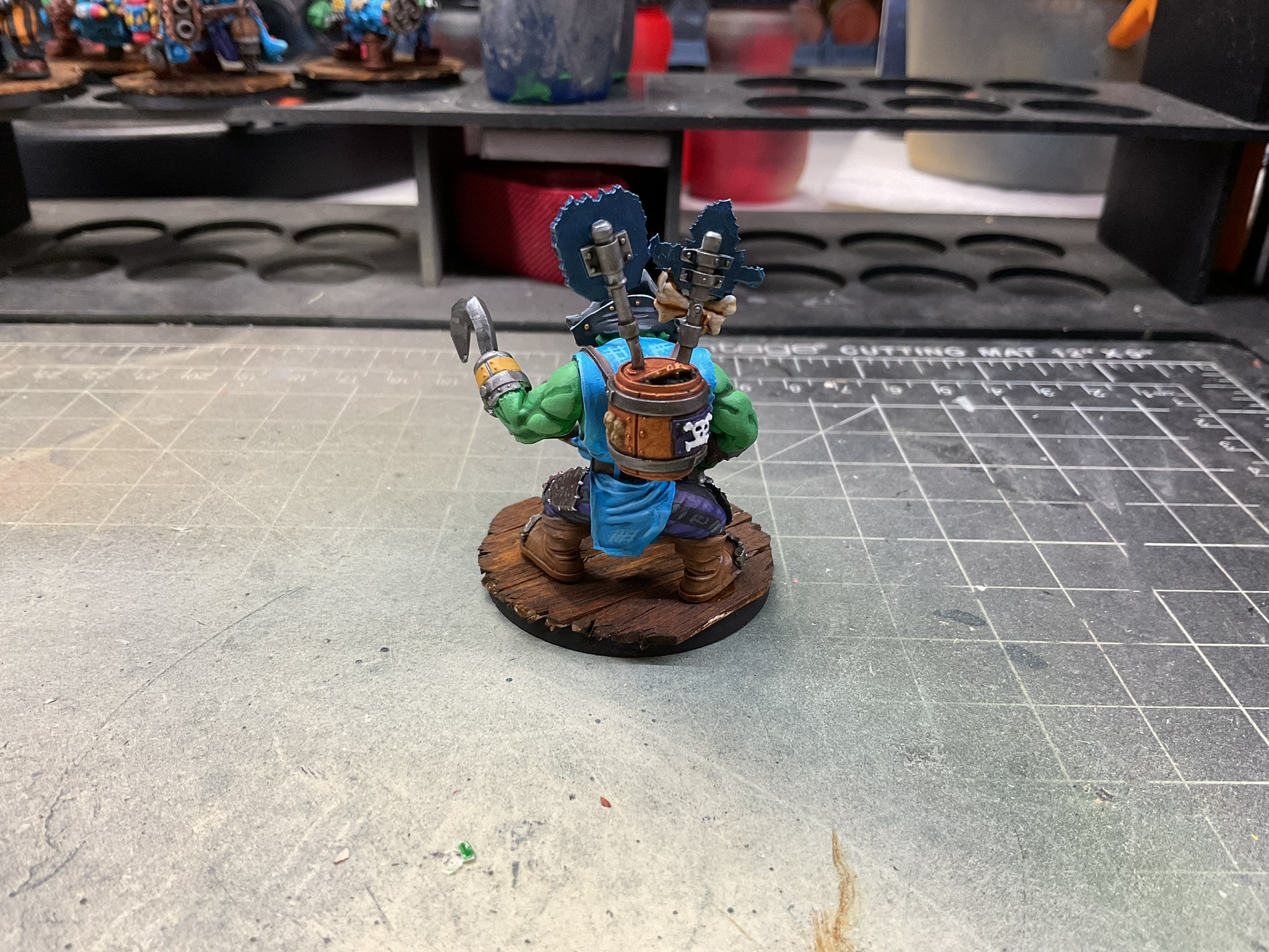 Once I finished that I started with a basecoat to the skin using Army Painter Fanatics Greenskin. This is a really rough coat, and I was not too careful about hitting areas around the skin right now following the “start from the inside” advise you always hear. By the time I finished all the skin, I was able to circle around and start adding some deeper color to the recesses. I did a coat of Army Painter Orc Skin speedpaint mixed 50/50 with Speedpaint Medium. This is gen one spedpaint, so after a few hours to dry, I hit it with a layer of Army Painter Matt Varnish through the airbrush. I think this will stop the reactivating that gen one was known for. Also, work is going to be hell this week, so they should get several says to cure.
