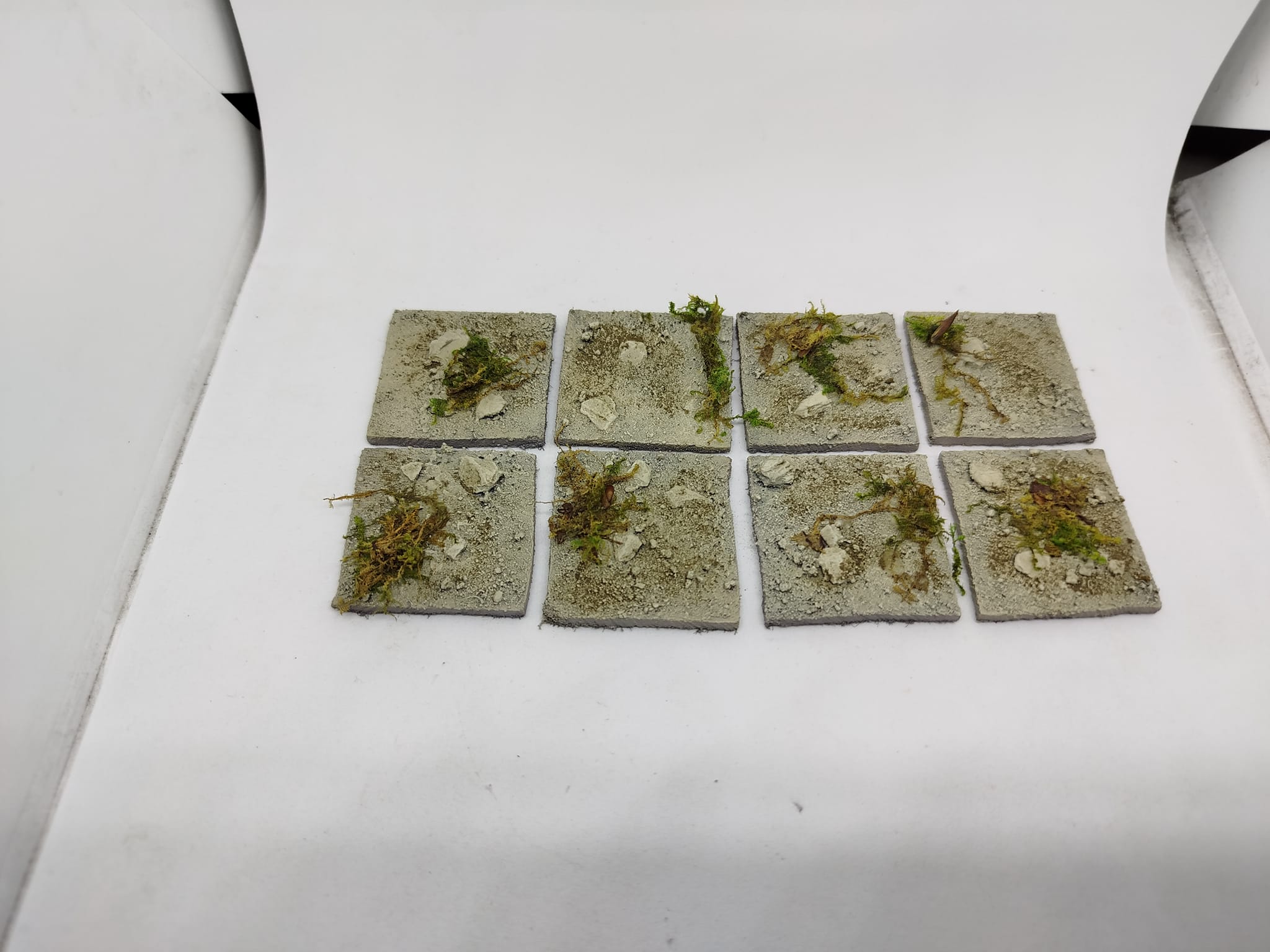 Finally, I took an old soft drybrush and rubbed lots of Vallejo Pigments 73.111 Green Earth in to everything, tapped off the excess, and then airbrush varnished everything immediately. (I tried a different pigment first on one tile and didn’t like it. For some reason it didn’t fade as much as the green I put over it)