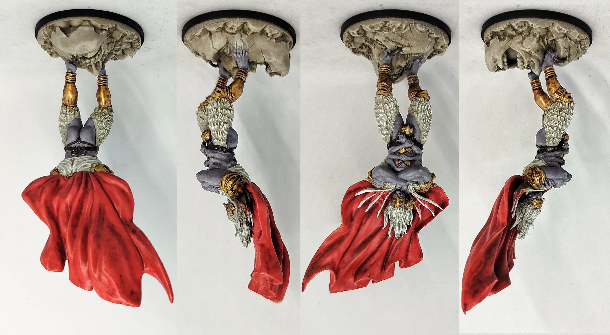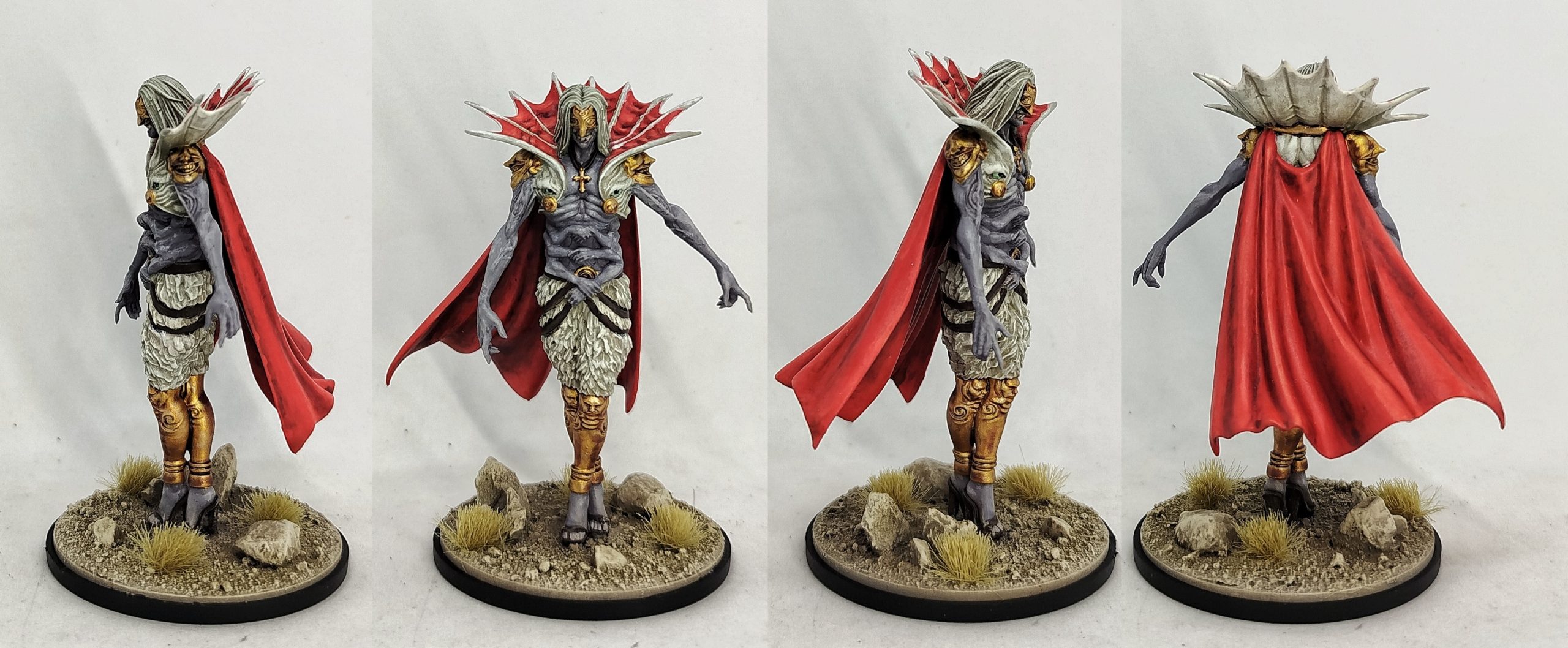 The Pariah (pics 1 & 2 above) is a male White Speaker who has gone rogue and stolen a red cloak on his way out of town. The Red Witches have been sent to hunt him down. In the upcoming Inverted Mountain campaign we will have to fight the Pariah while we are all hanging on the ceiling. He is the first upside down model I have painted, but there will be more. He has magnets in his base, and he sticks to a metal sheet at the top on my display cabinet, allowing him to actually hang upside down. It also saves on shelf space!
