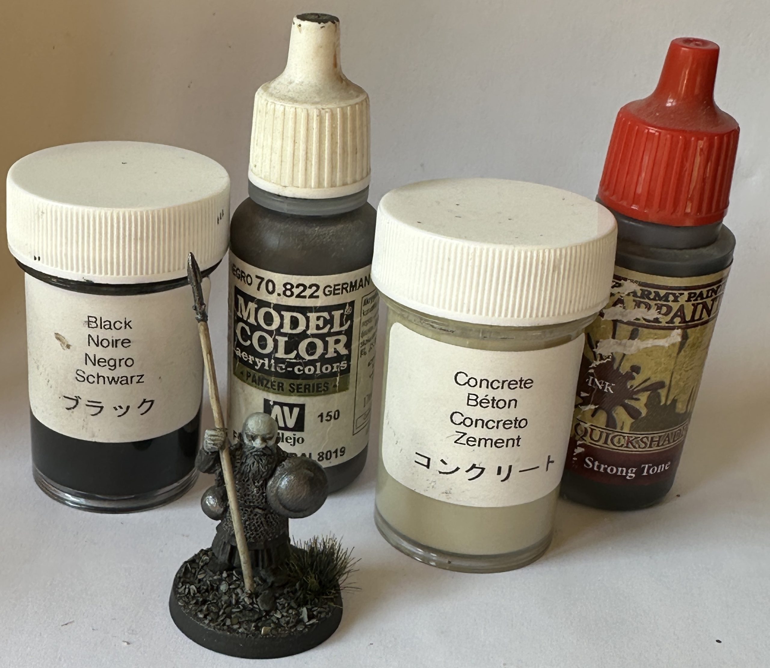 Clothing was done with the Black terrain liquid pigment. This black also went onto the leather with a subtle highlight of German Black Brown. Spear shafts and axe handles were done with the Concrete liquid pigment with a wash of Strong Tone to get a bit of wood grain.