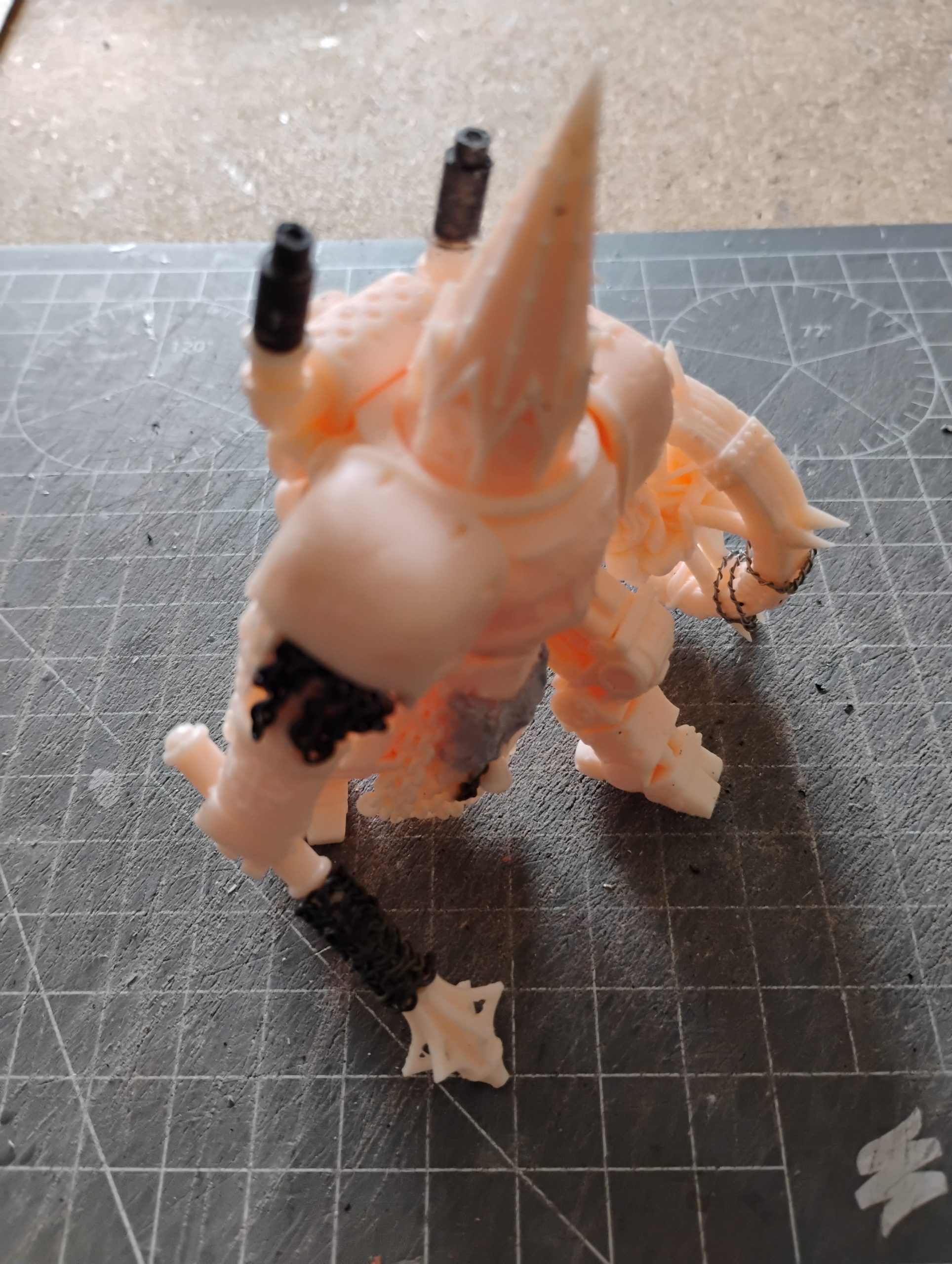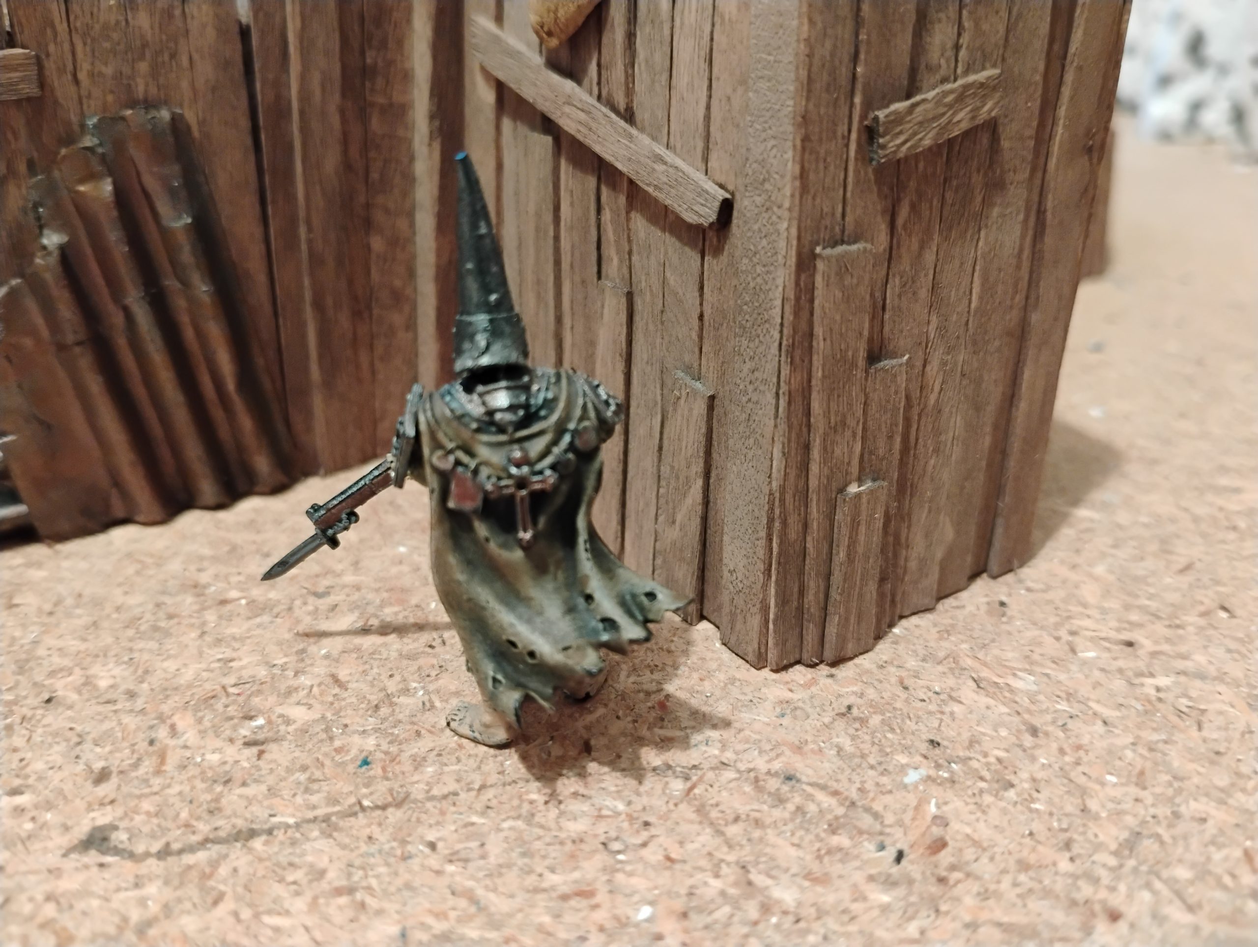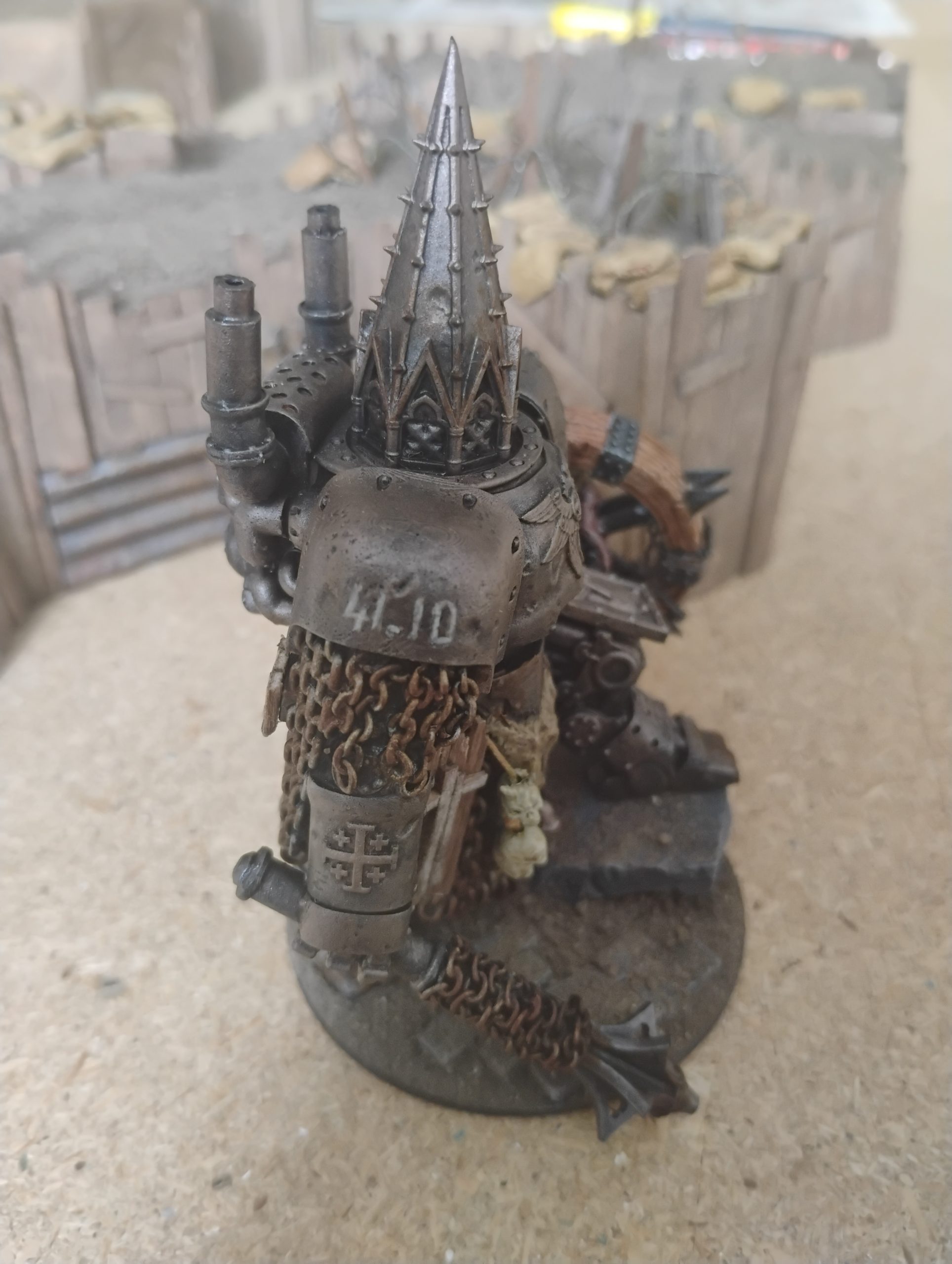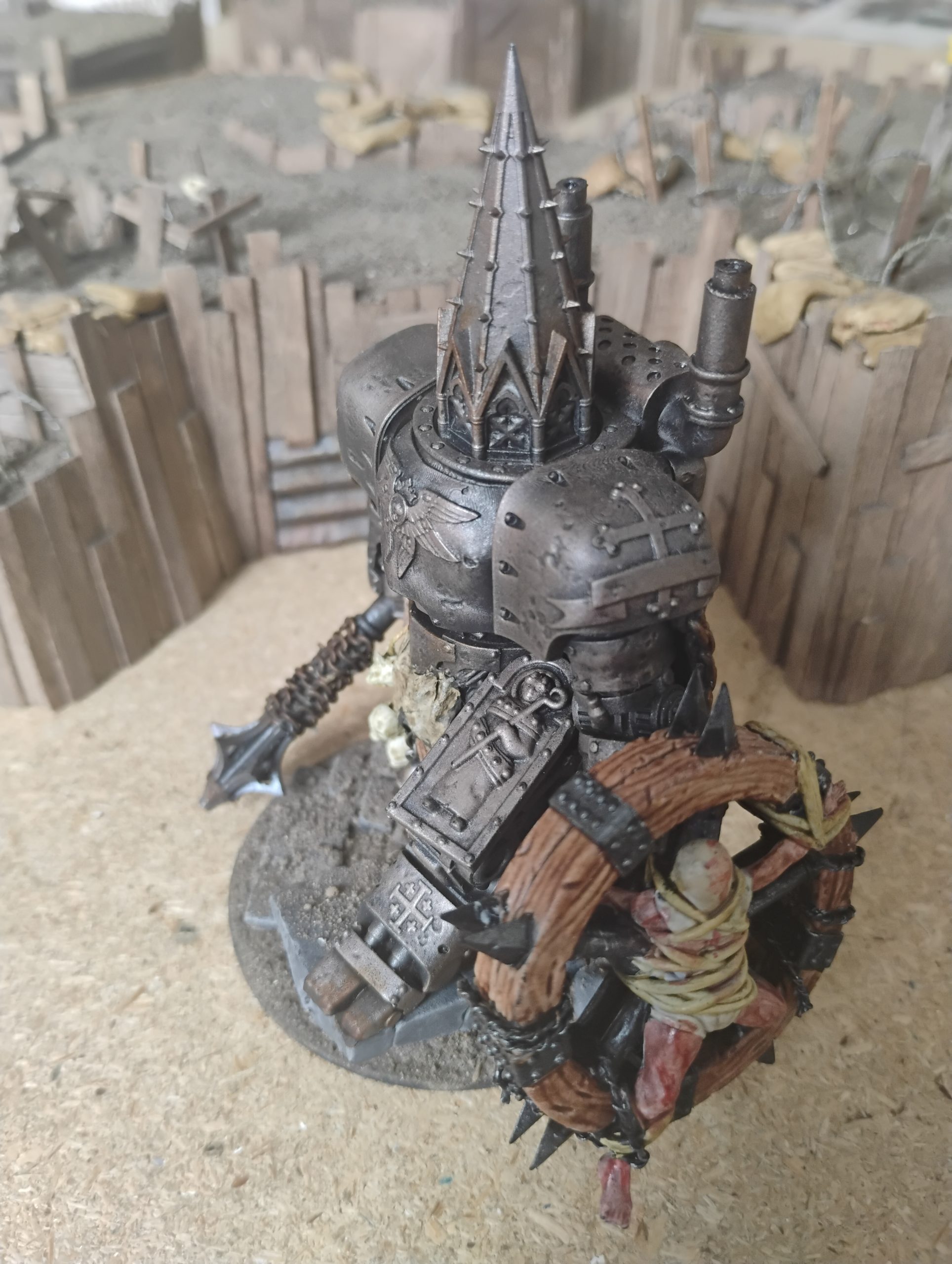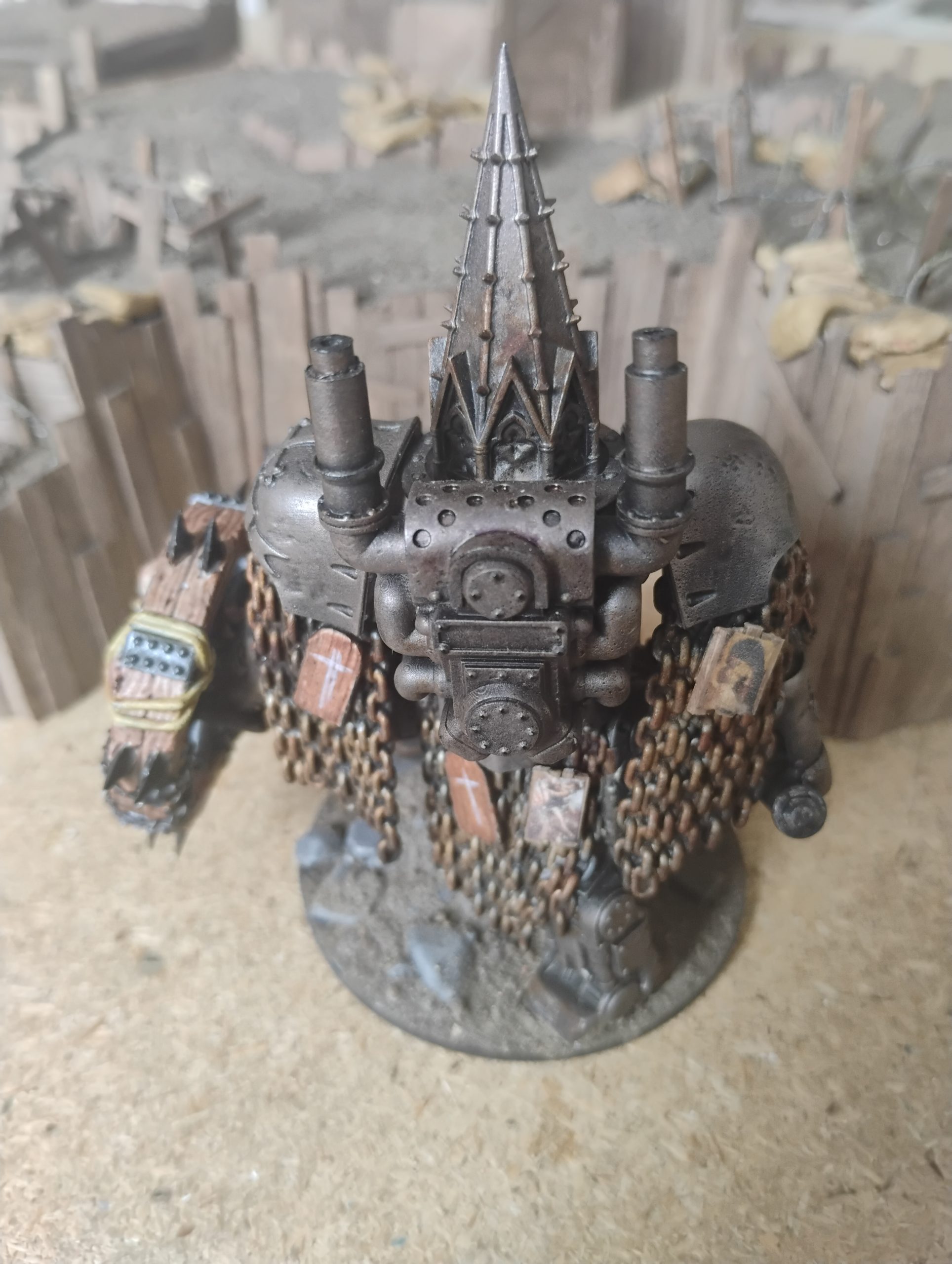 To change the visual from just a hulk of metal, I also replaced one of the leg guard with a wooden guard featuring a cross.