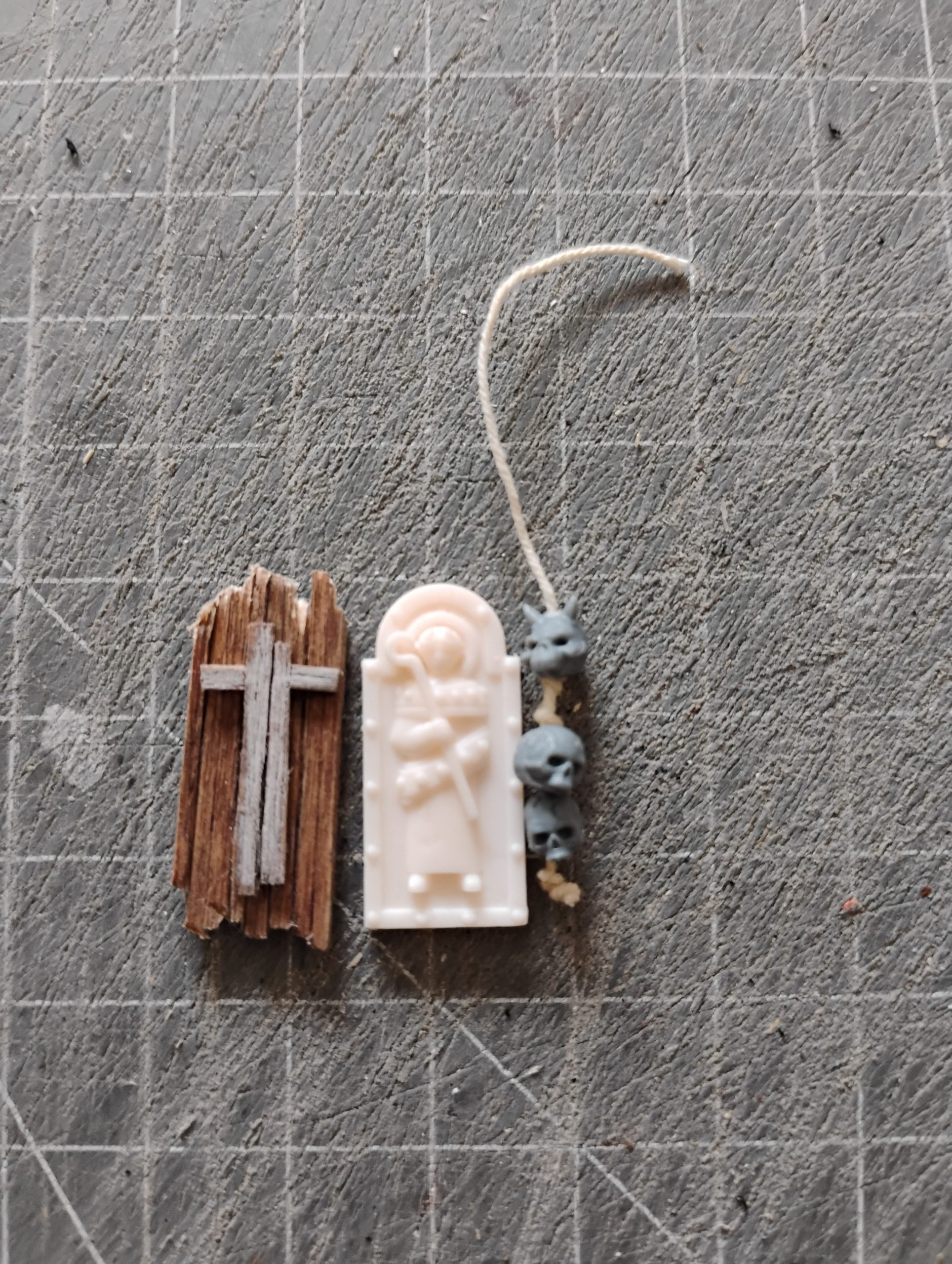 For this, I just simply make a cross with the coffee stir sticks, and used some jewellery chain to attach it to the model.