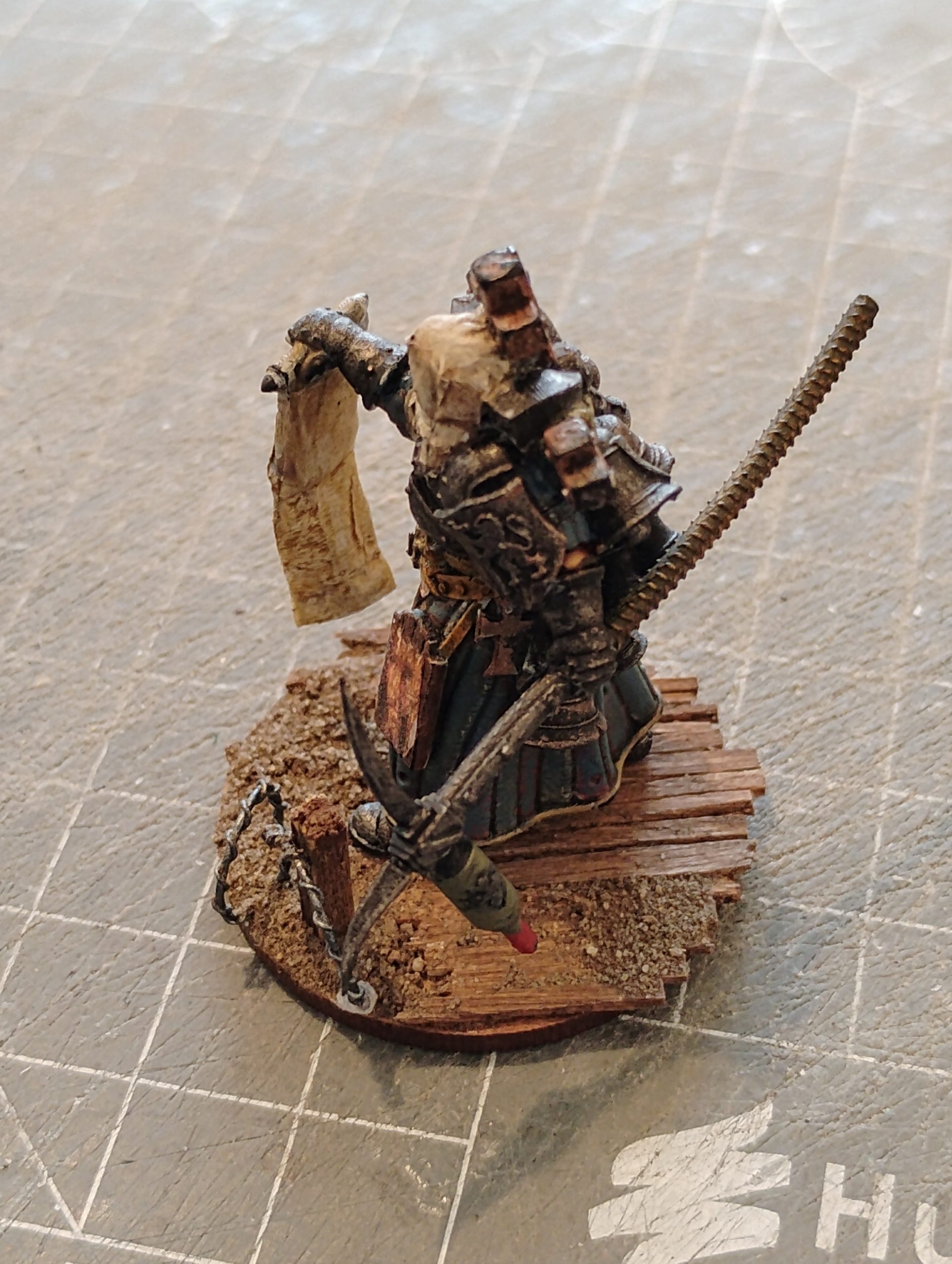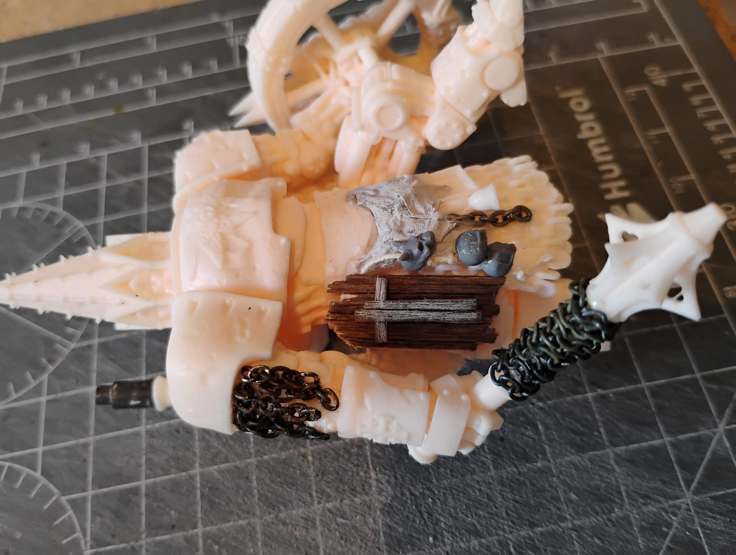 I didnt really like the hanging lamb and so shaved this away, and replaced this with a tabbard (again tissue soaked into PVA) and used some chain to try to help blend into the model and to form some contours.