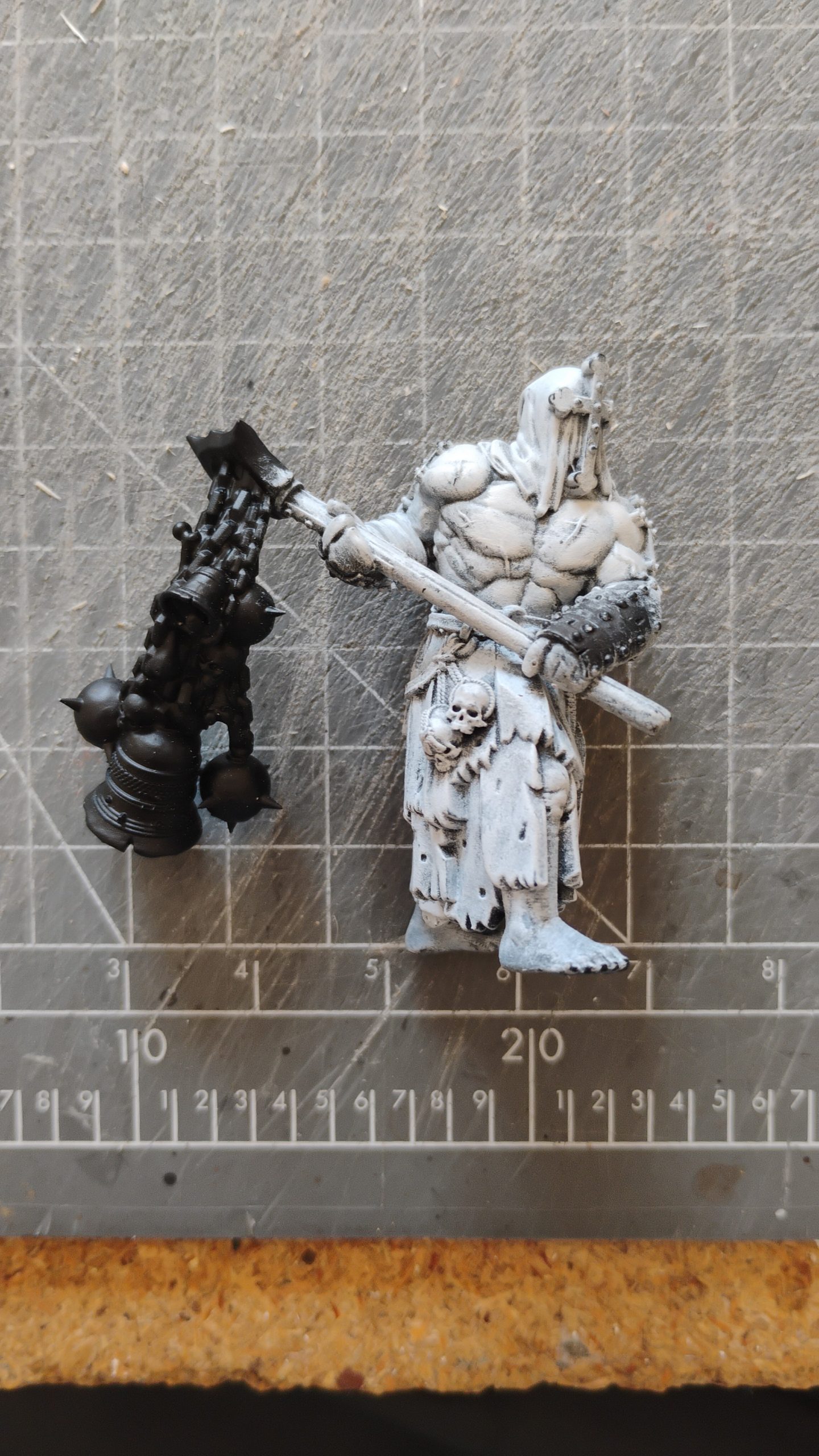 To make things appear a bit more “grim” I also decided to make a skull trophy. I found some spare heads, and drilled through them and threaded some string and glued into place. this would be attached to the midriff of the model and hang next to the tabbard.