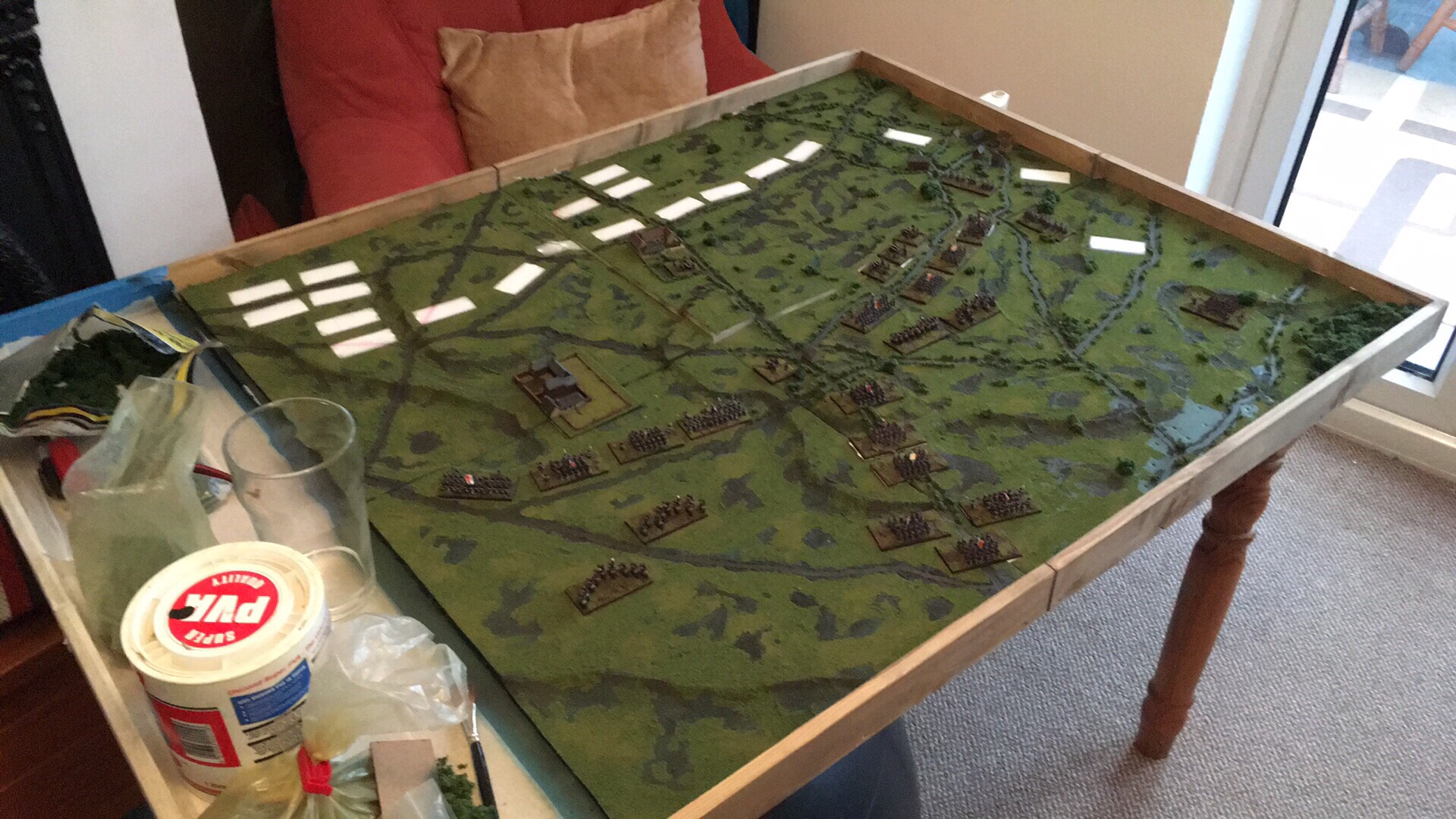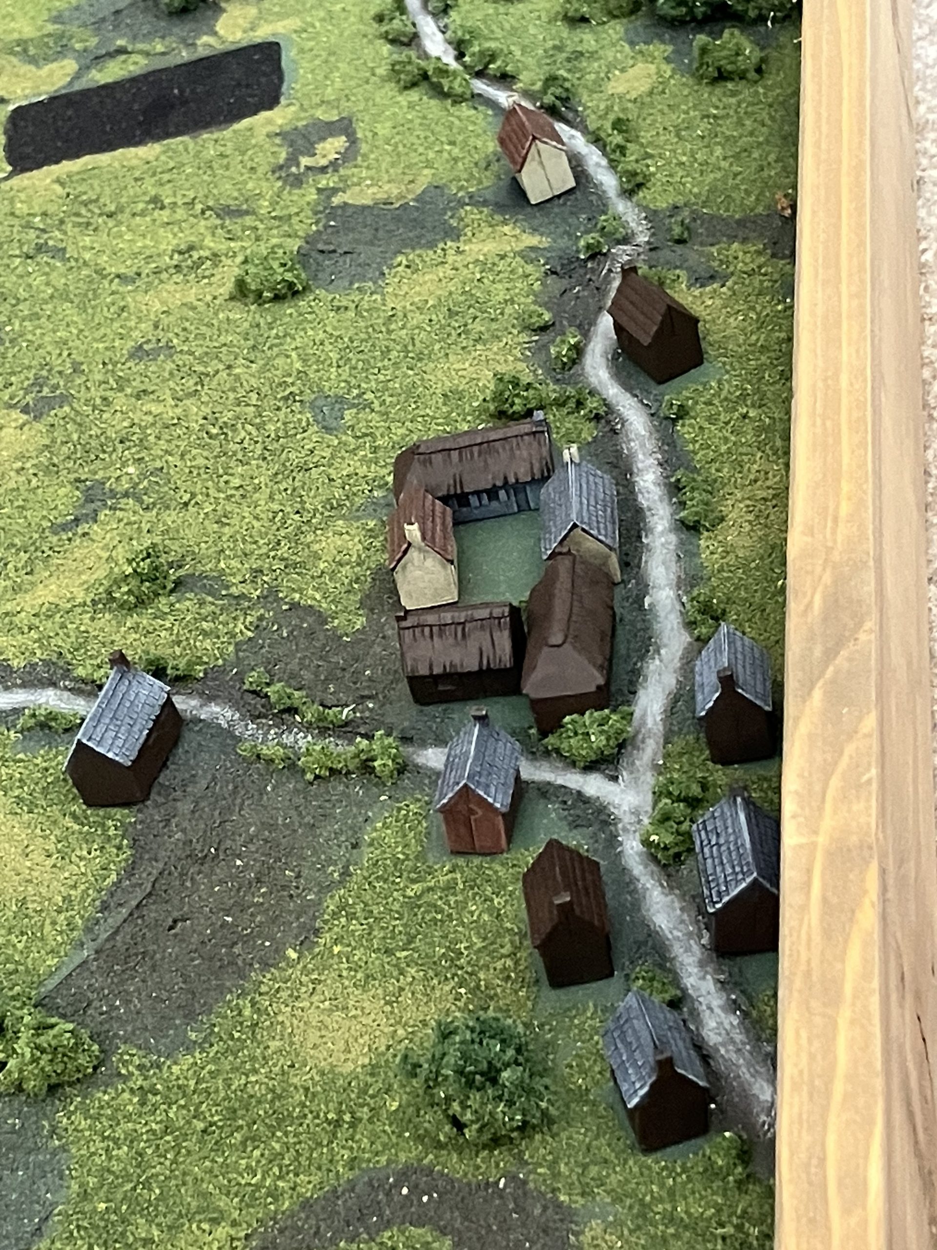 roads were drybrushed with denheb stone (citadel) to make them stand out, and conversely, all the locations for the models and buildings (except hougoumont….. don’t rememeber why…) were painted black so they disappear a little more into the landscape.