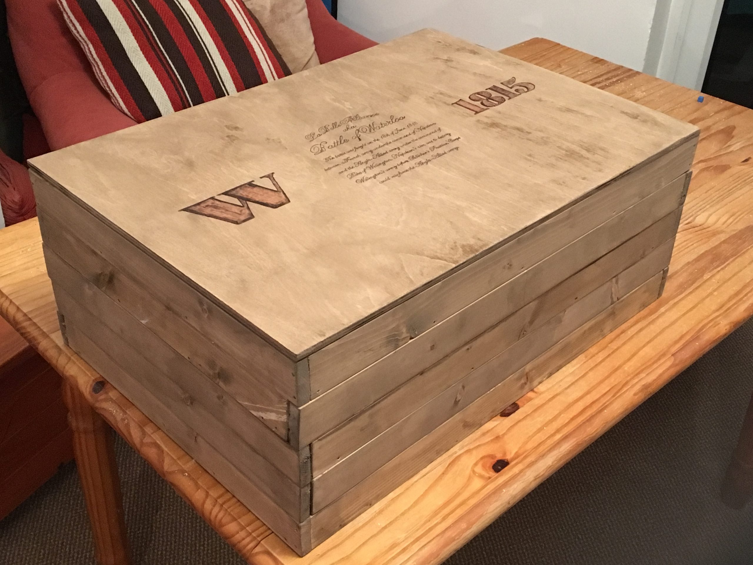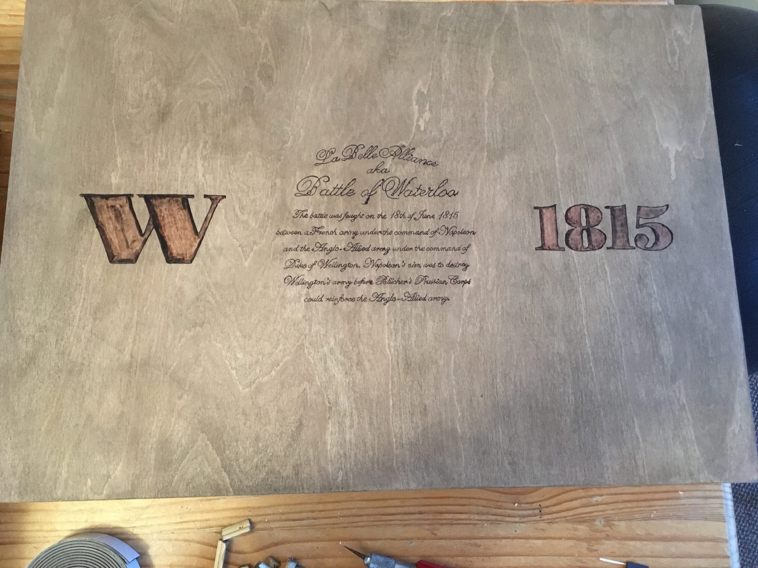 the four sections stack together with dowel fixings and a Fifth section, which is intended to take the models and cards for the game, was made as a solid layer with a hinged lid. This goes on top making the appearance of one large, old, wooden box.