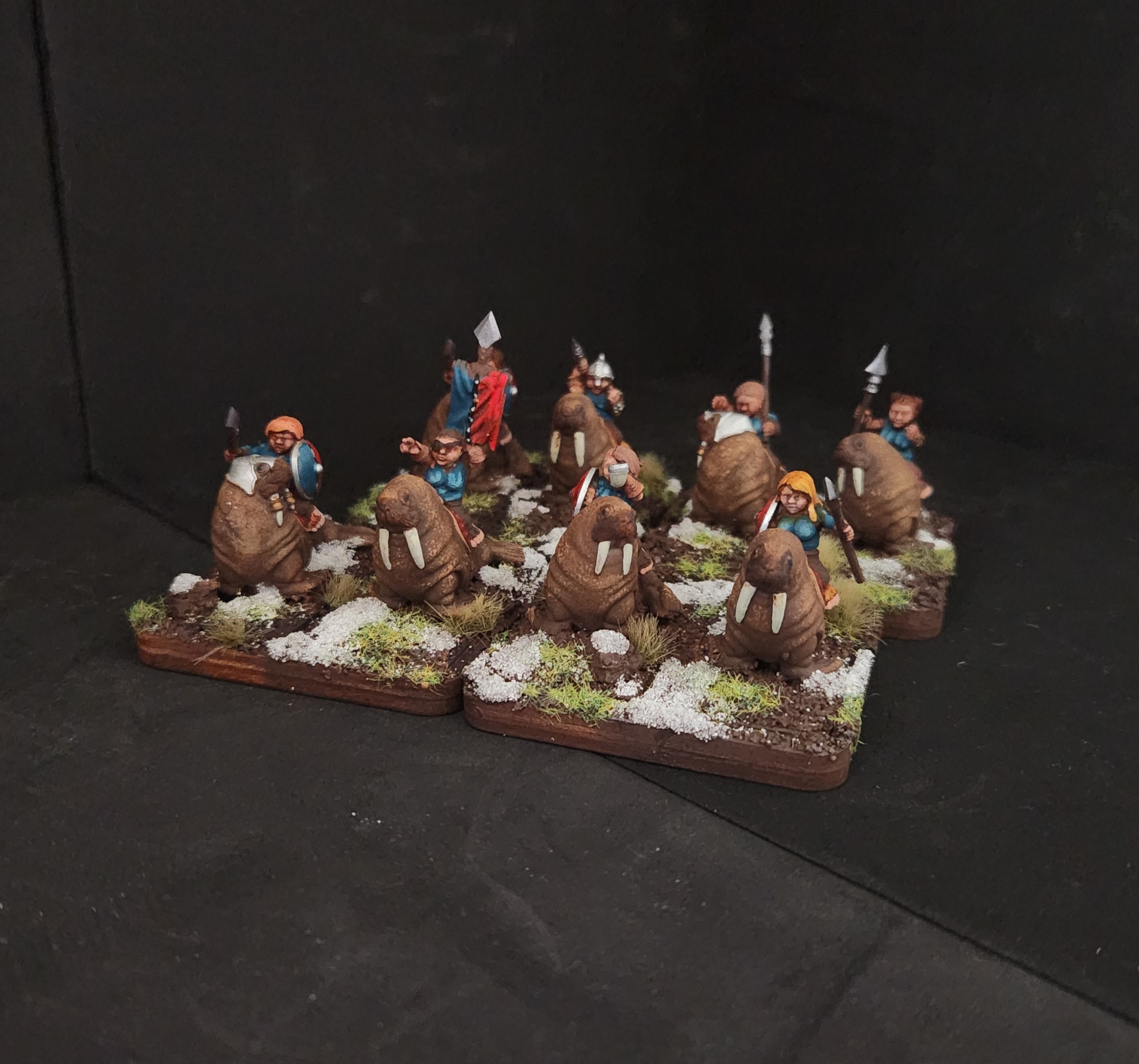 Second unit complete and the walrus wranglers are ready for the fray. My only issue with these is that the bases have taken all the sealant and fit tighter than I would like. I just need to have people be careful when removing figures. I could go back and sand them down (the likely course of action). I still need magnets for their bases. Once more, these are meant to get out onto the table.to I skipped the eyes.