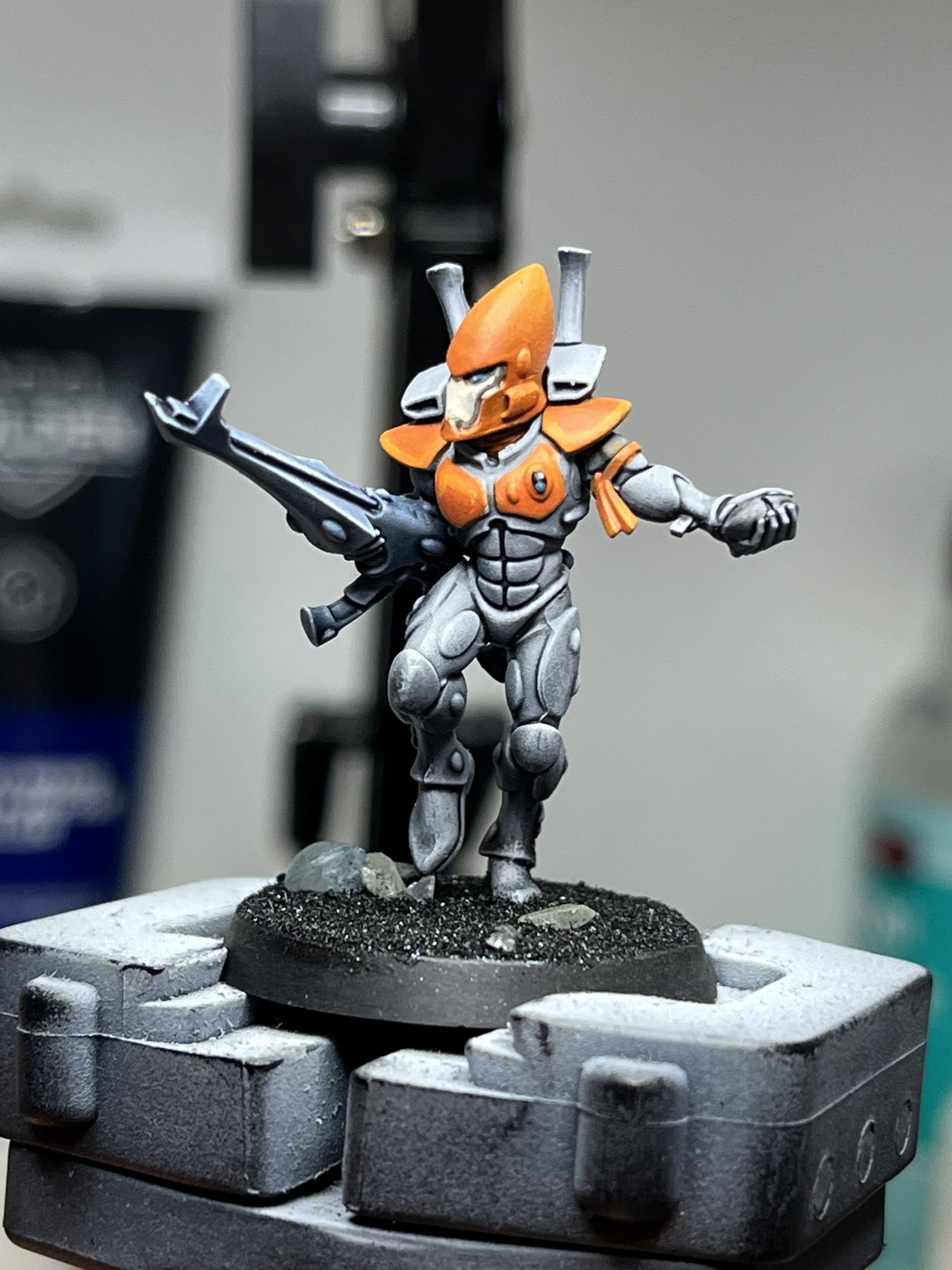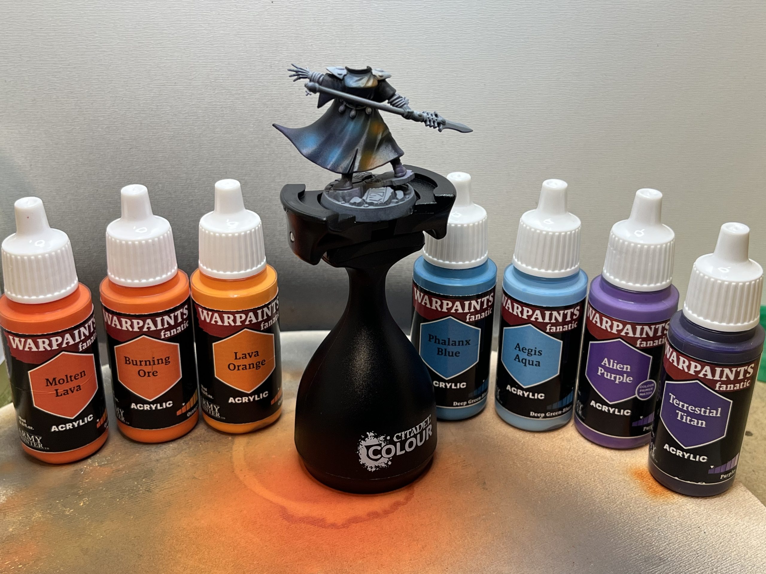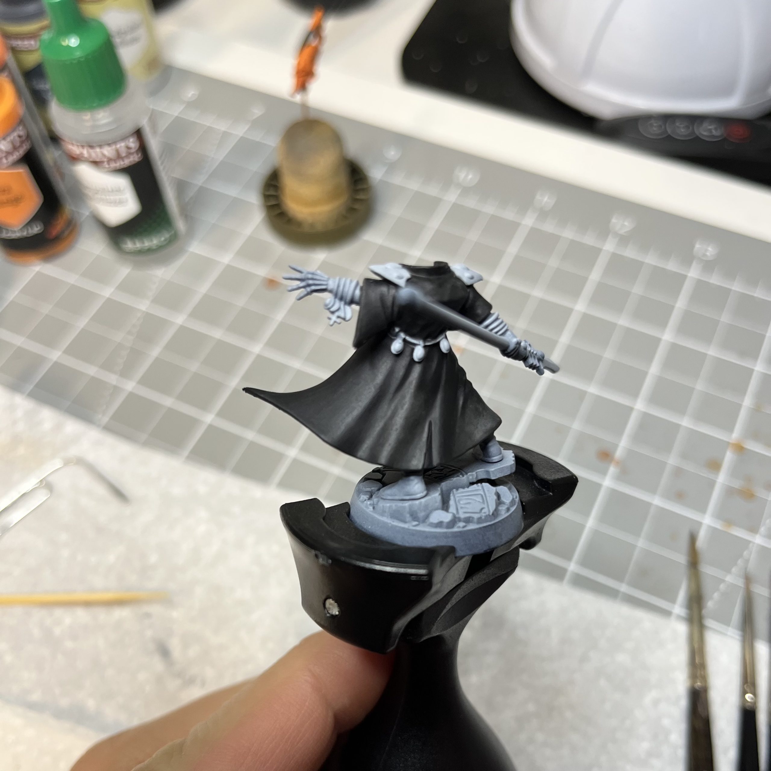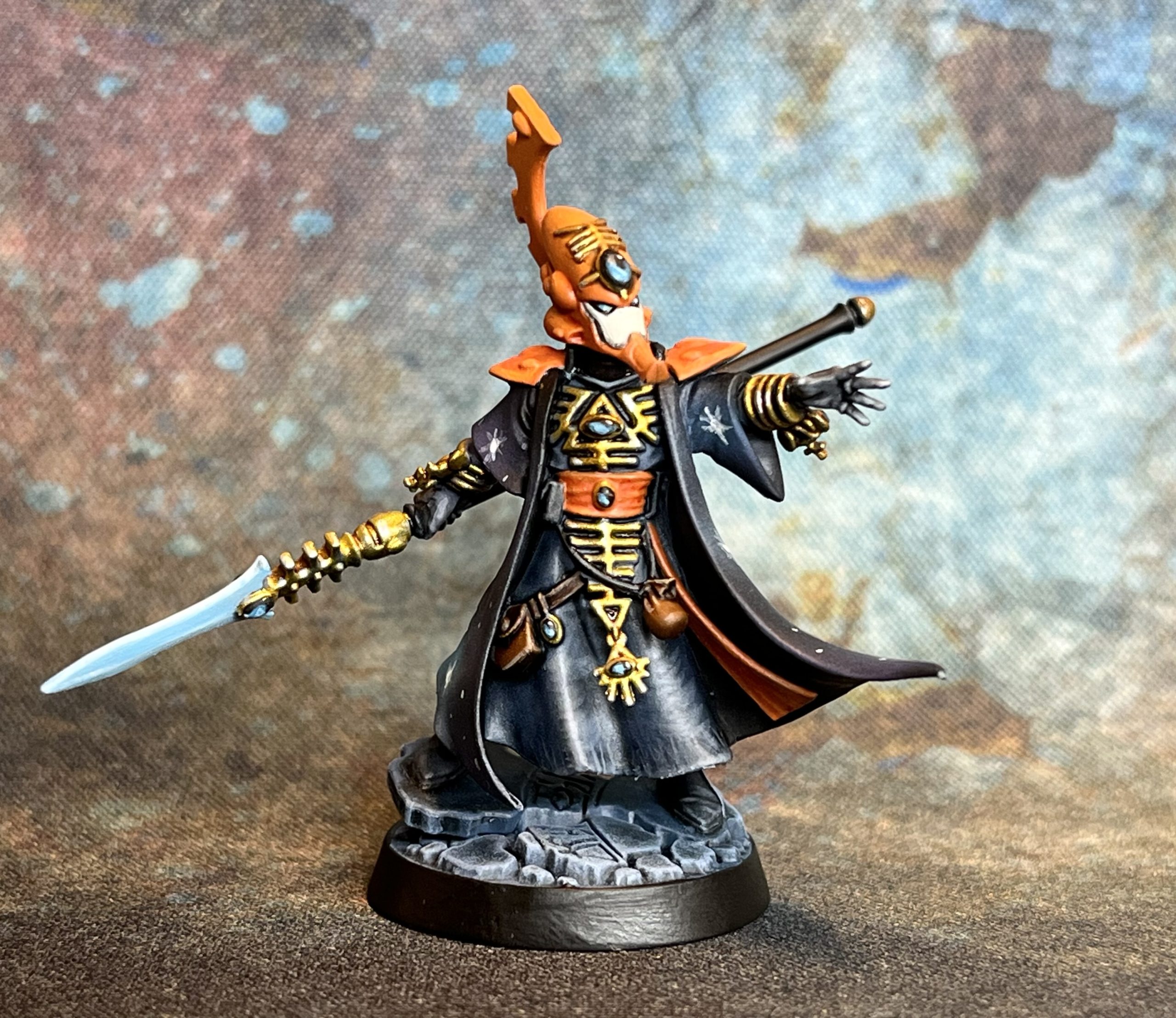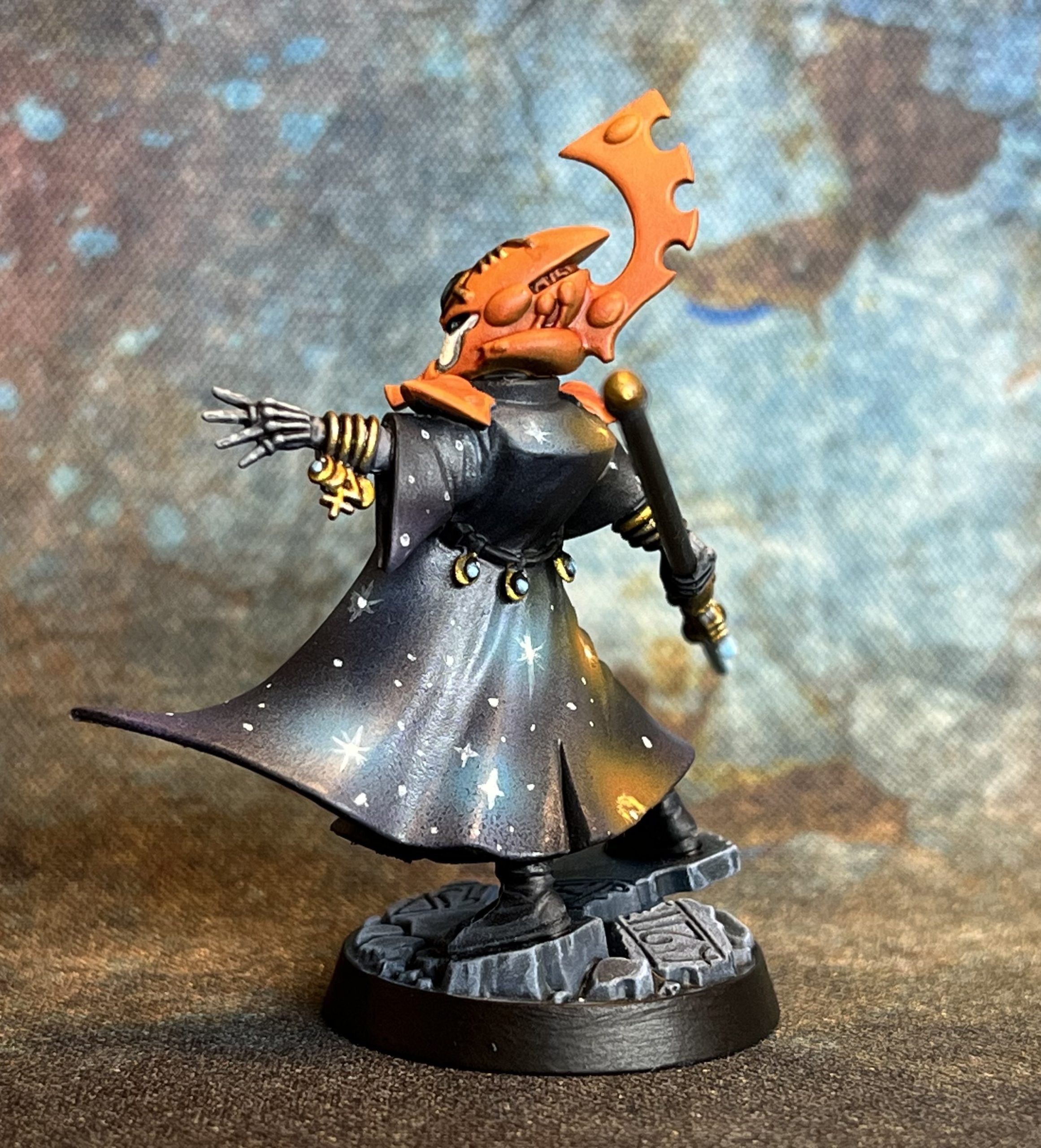 Two models to go, but two very individual ones. Farseer first. I have an idea to do something fancy on the cloak, perhaps one of those galaxy effects…. But it would need to be simple and fast (as is my pledge for this project). I’ve painted the cloak black while I ponder..
