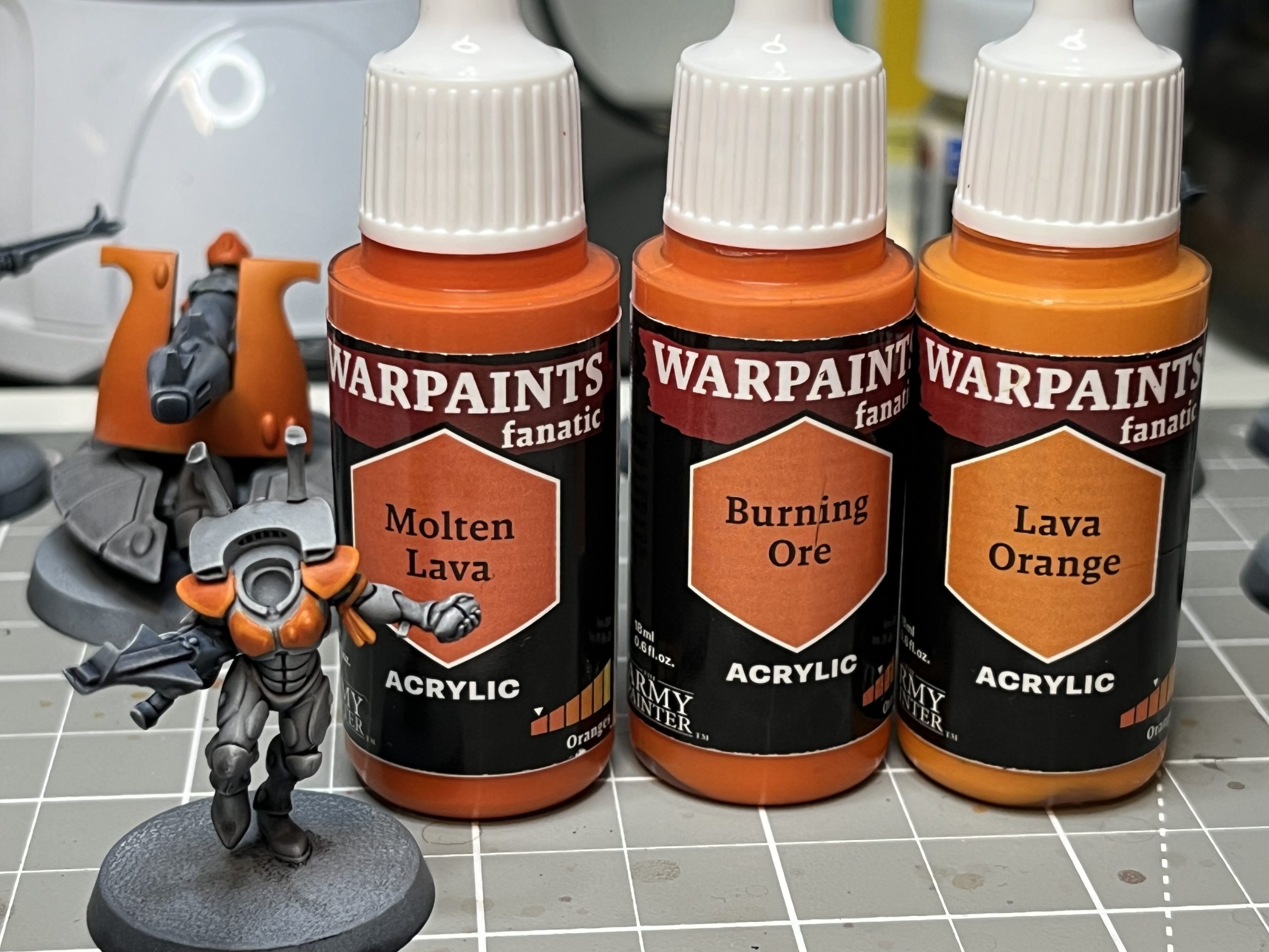 The orange parts next. I used the orange Speedpaint to intensify the base coat before working up the highlights. The Speedpaint really helps to reduce the telltale ‘airbrush look’ and creates a stronger colour more quickly.Airbrushing done, and onto the brush work. It’s worth pointing out that I also airbrushed a matt varnish over everything before the next step. When testing, I noticed that manipulating the Speedpaint in the next step was lifting the thin airbrush coats in places, so I decided to protect it just in case.