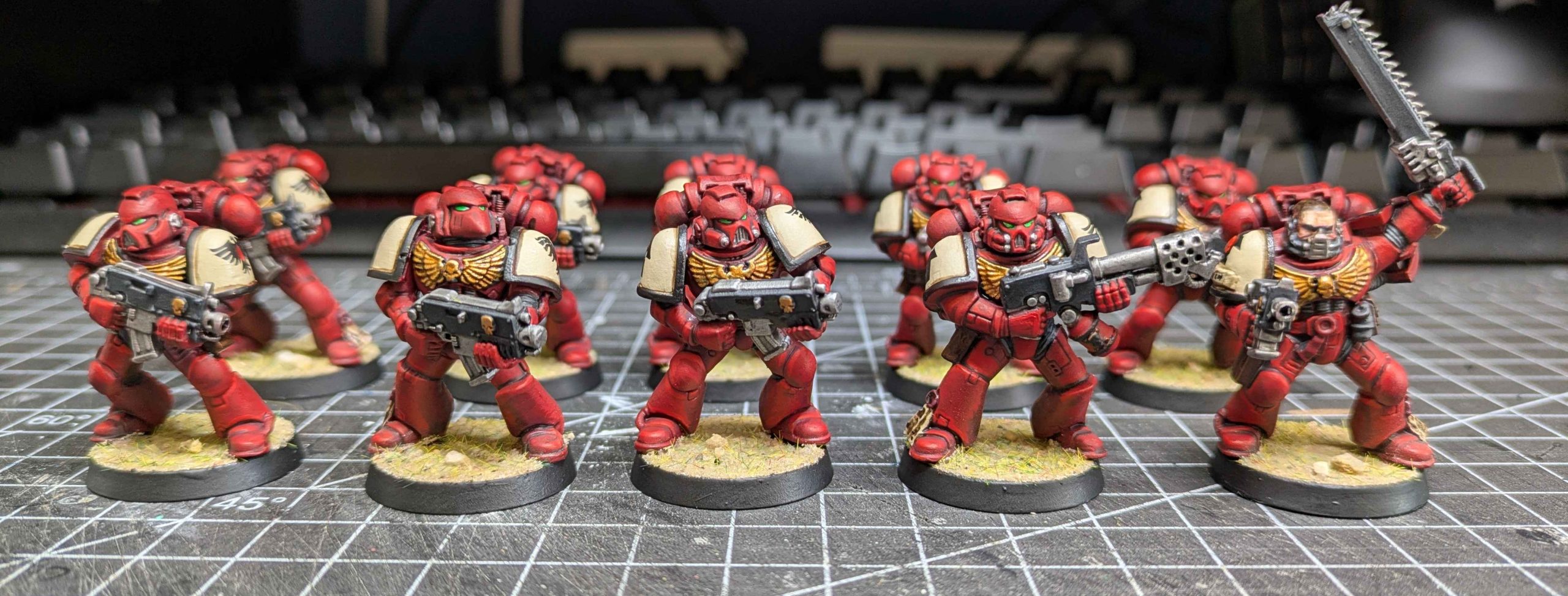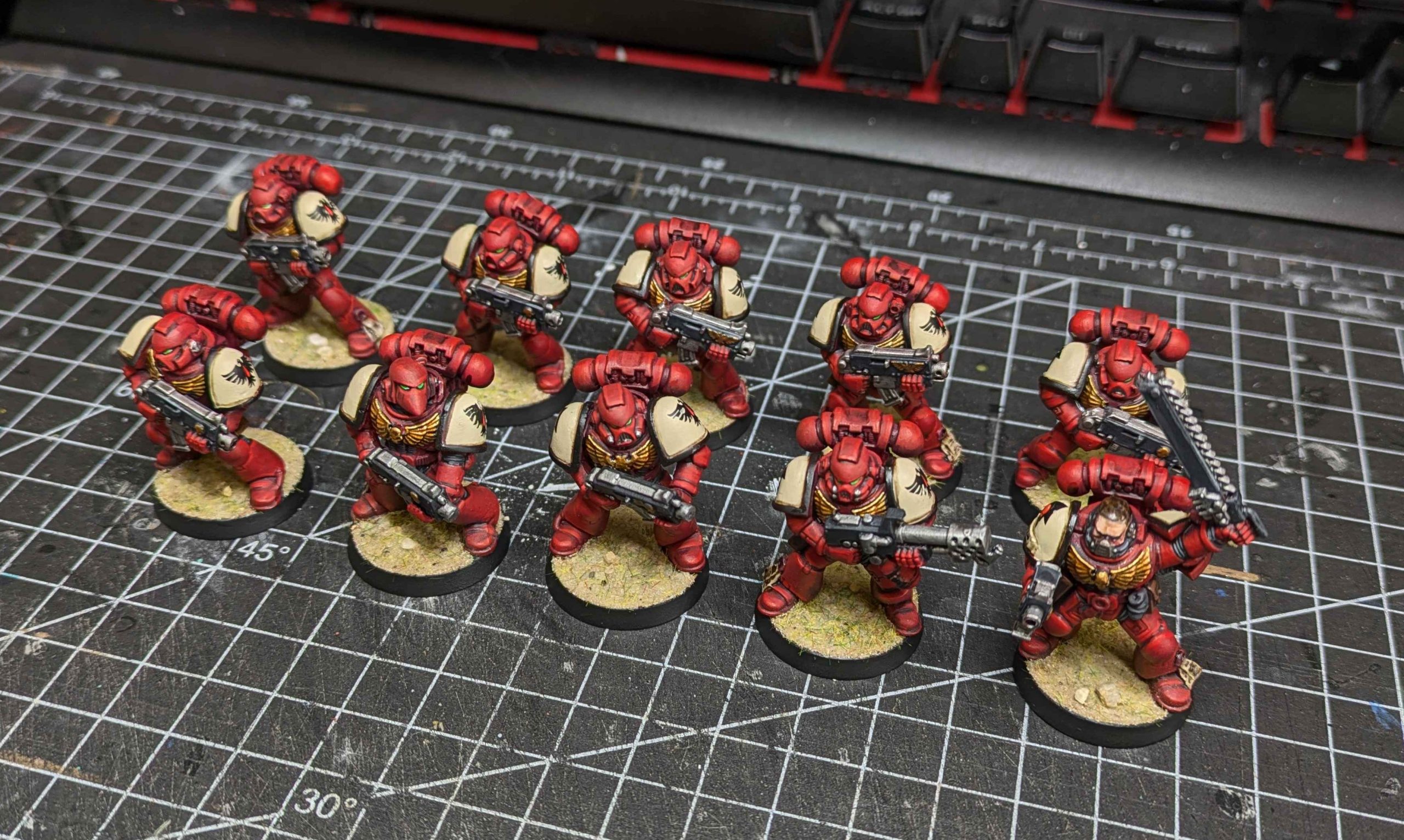The first stage of painting was bundled all together on one afternoon: everyone got two coats of Citadel Khorne Red then a drybrush of Citadel Mephiston Red. Next up I base coated the undersuit and weapons with Vallejo 70.995 German Grey and Army Painter Gun Metal. I prefer this for “black” areas of the models rather than an actual black cos I think the wash afterwards looks more effective. Everyone got an all over wash of Citadel Nuln Oil at this point. Initially I was going to do this as a recess wash but honestly it was faster to do an all over wash and layer back up than recess wash. The red got layered back up with Citadel Mephiston Red and then an edge highlight with Citadel Evil Suns Scarlet. The grey/black got a highlight of Army Painter Ash Grey.