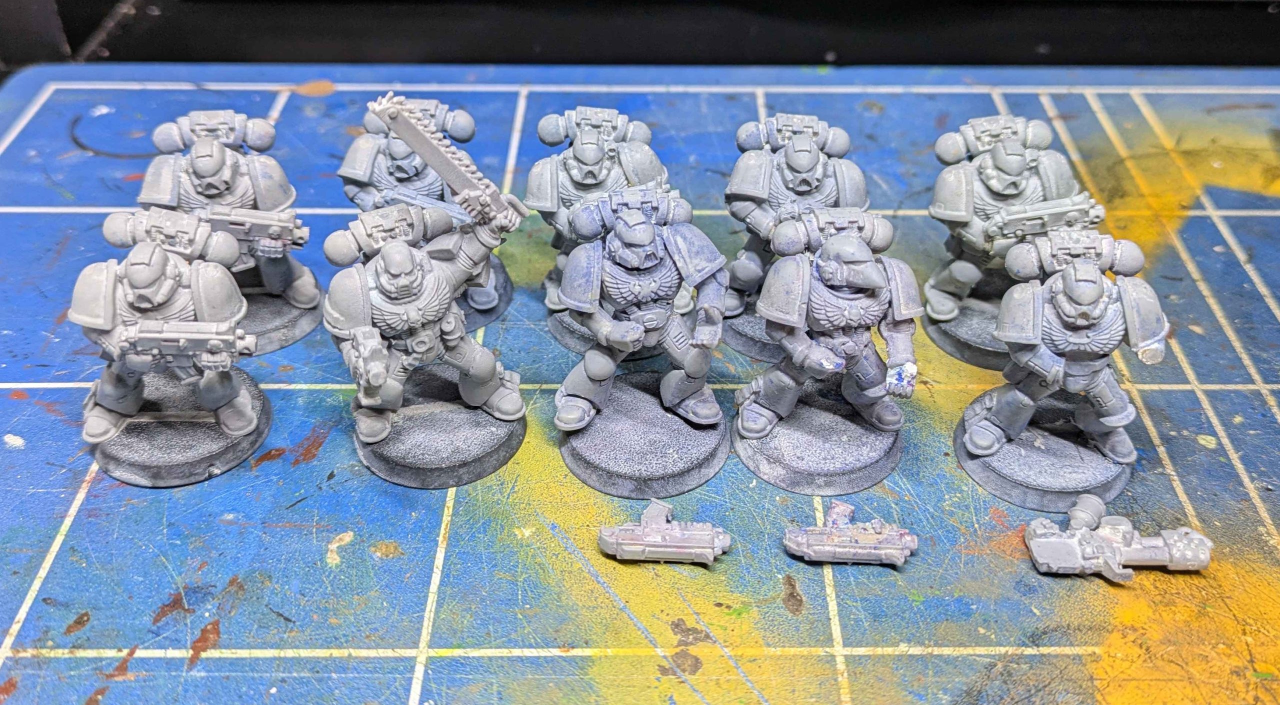 I then spent the rest of the evening tidying them up. Scraping mould lines, straightening up packs and shoulder pads and on two of them properly trimming the bolters so they look right on the hands. The flamer just fell off in the goop and I’m going to keep it off for painting. I debated prying off all the other weapons but they’ll do as they are.