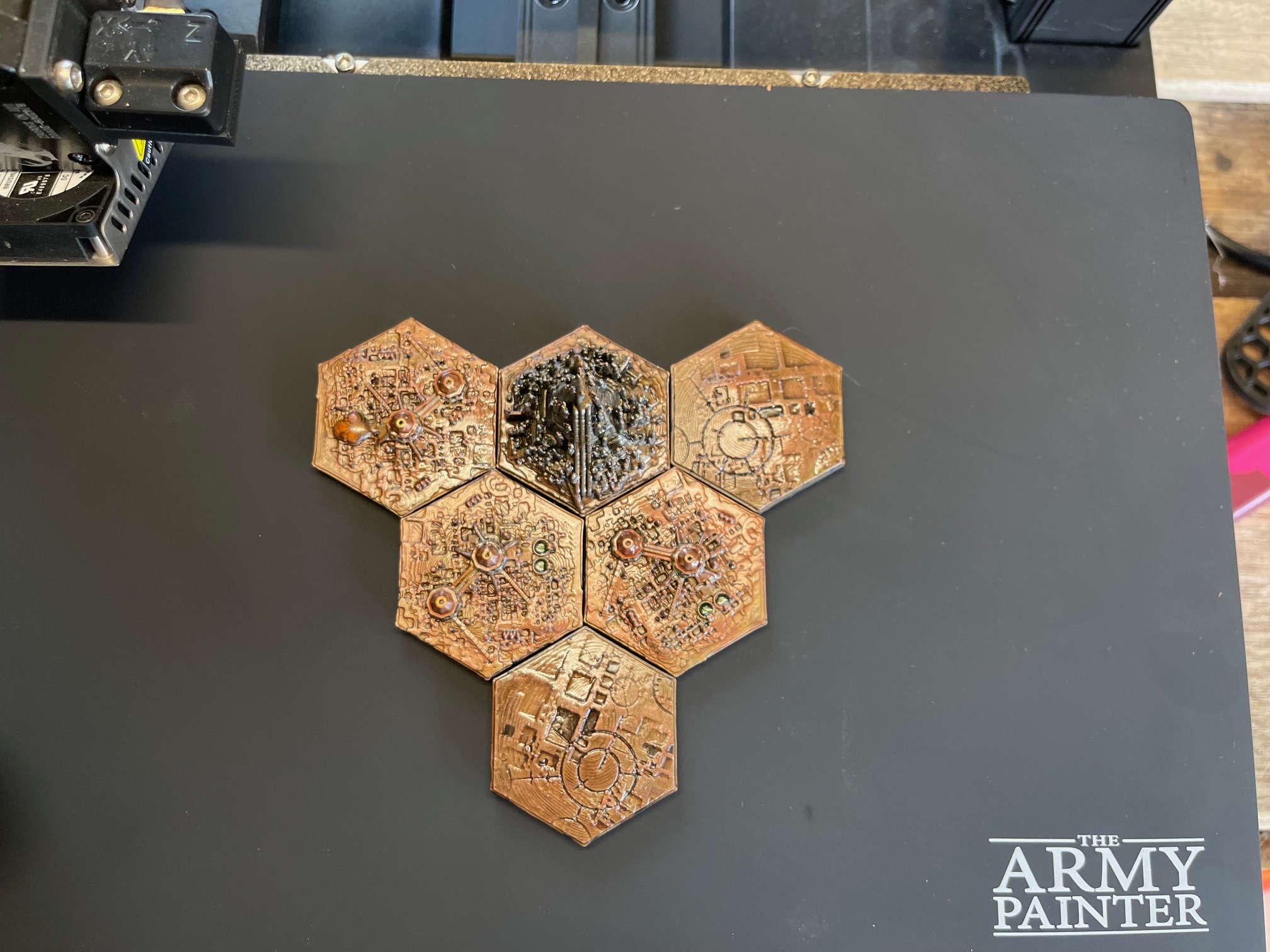 - Print Times: • Standard hex tiles (less intricate): ~50 minutes each • Hive Spire: ~1 hour 40 minutes