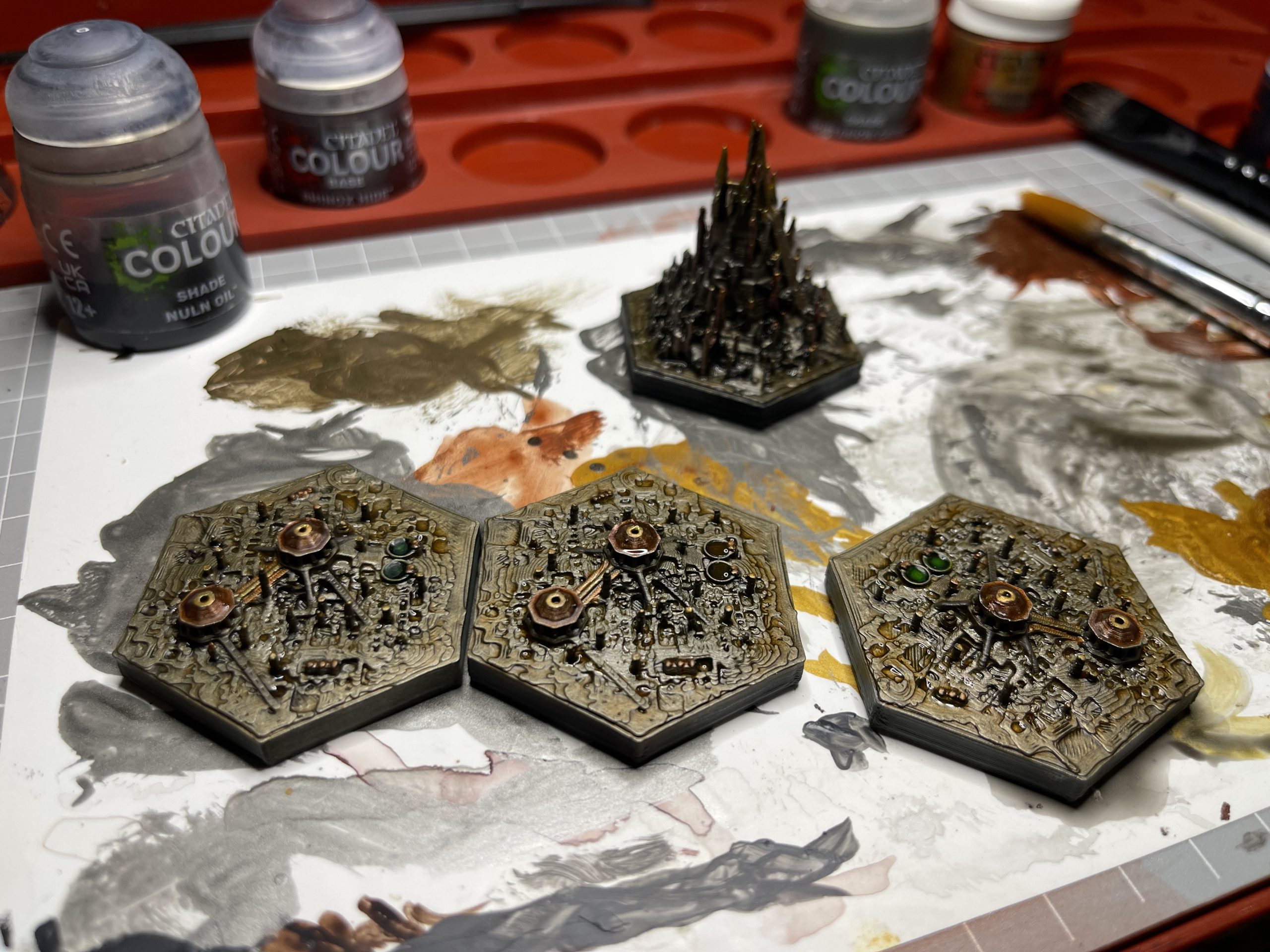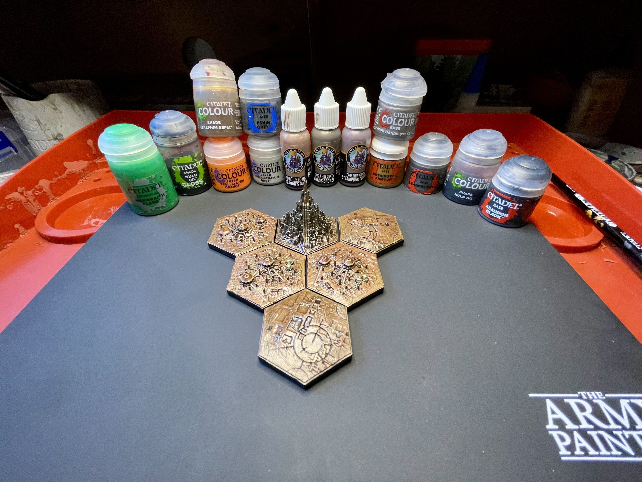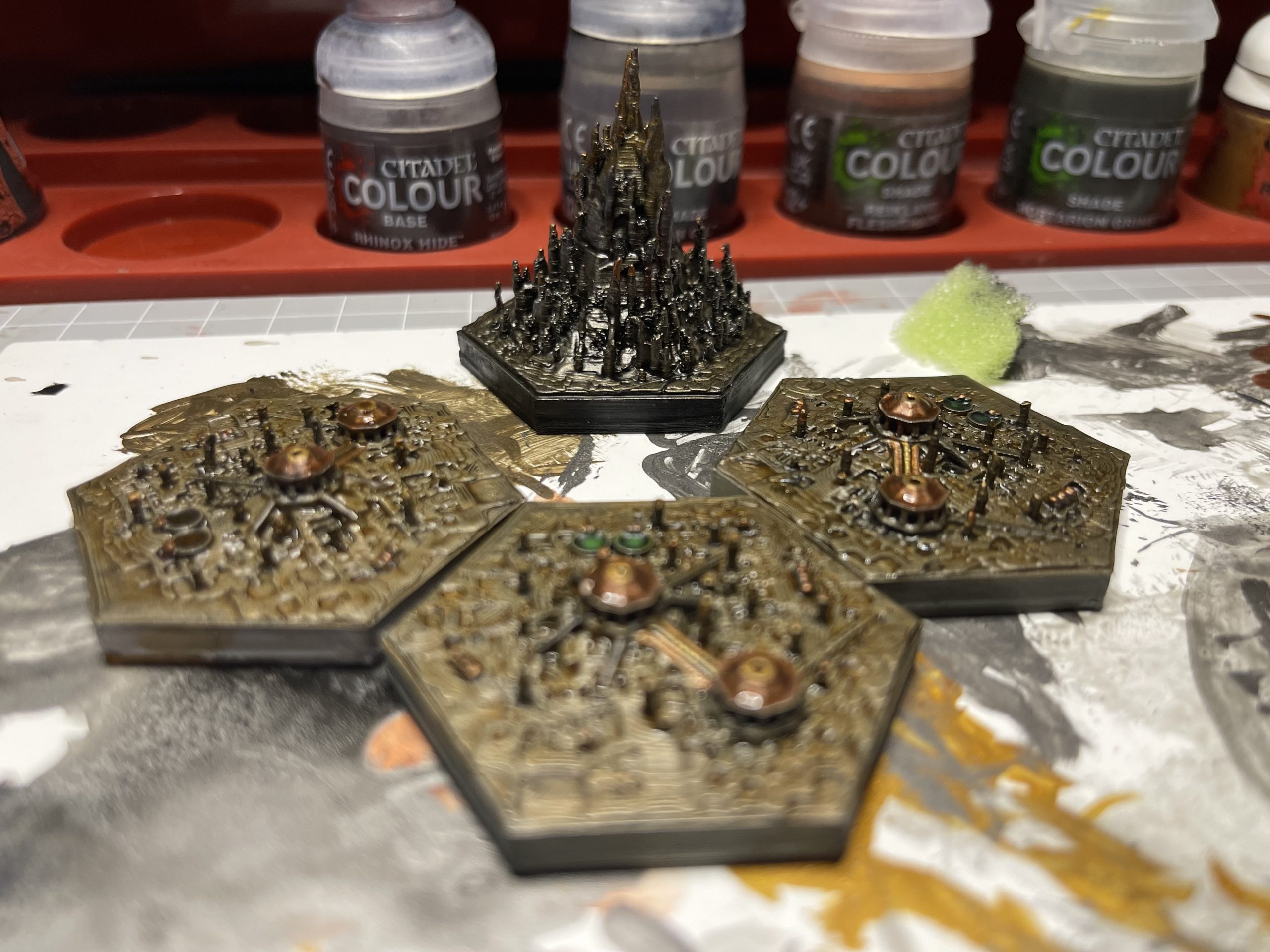 - Hive Spire (focal point): • After Nuln Oil, drybrushed with copper, gold, Eshin Grey, Administratum Grey, and Leadbelcher. • Seraphim Sepia around the base edges for smooth transition. • Highlighted again with the same colours after washes. • Gold highlights concentrated on spire tips and ridges. • Copper and bronze elements layered for richness. Some Sponge Work to apply speckled Eshin grey for texture.
