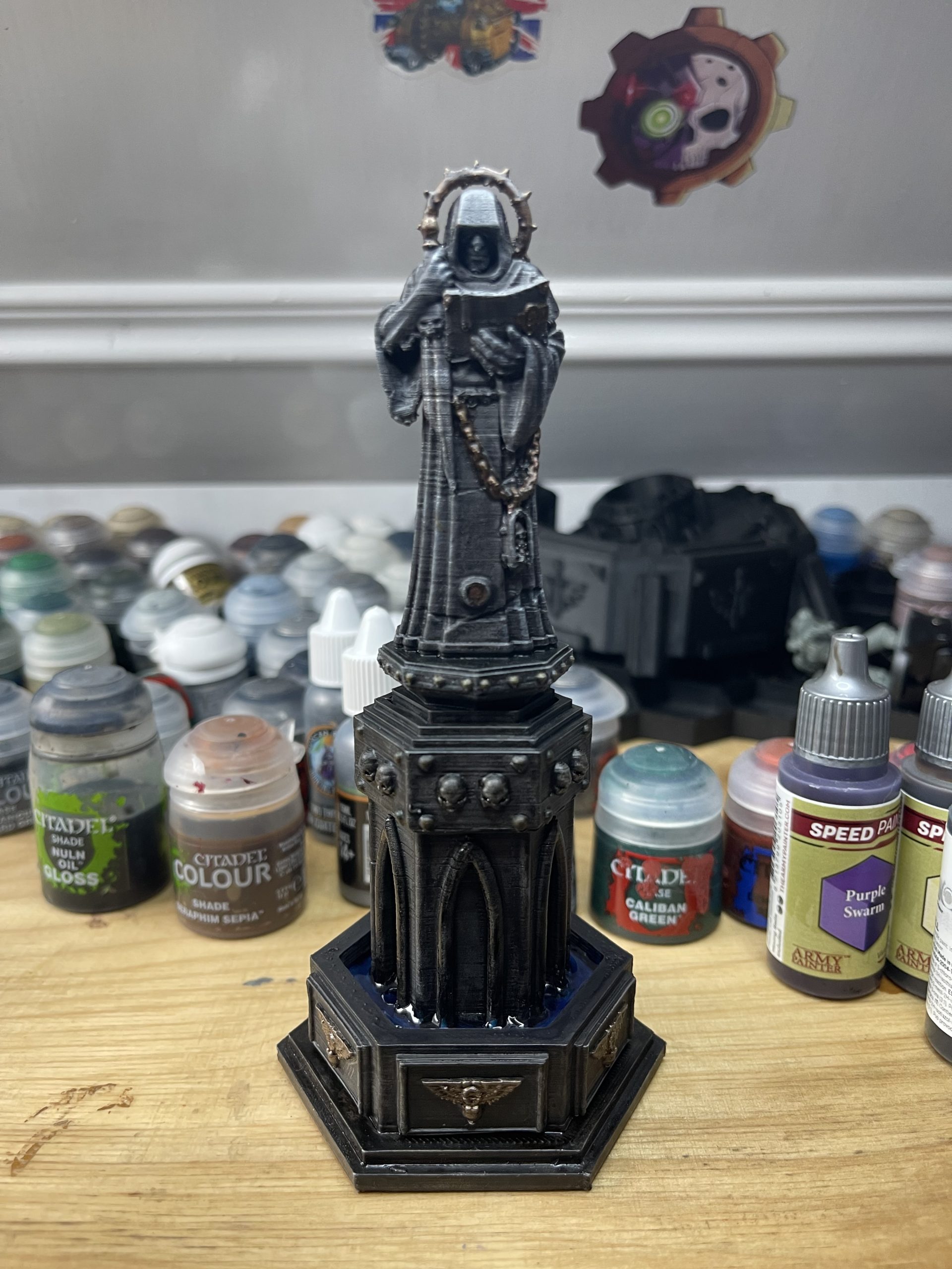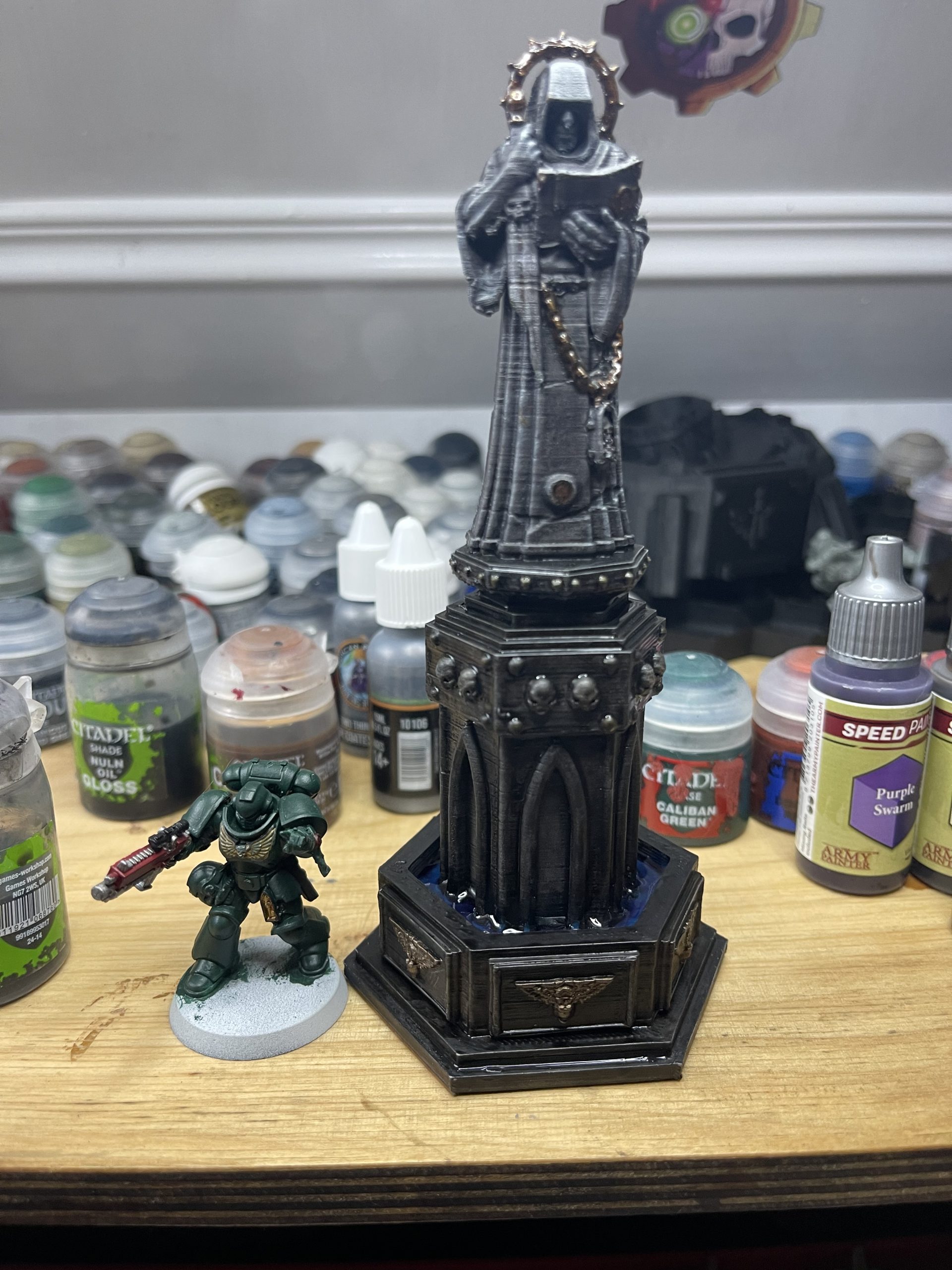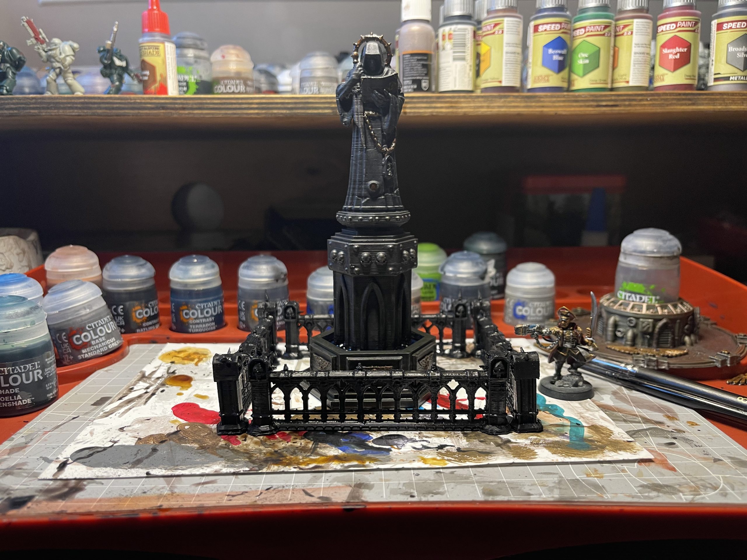 - Statue: Administratum Grey basecoat → Nuln Oil wash → Brass and Metal Details → Agrax Earthshade