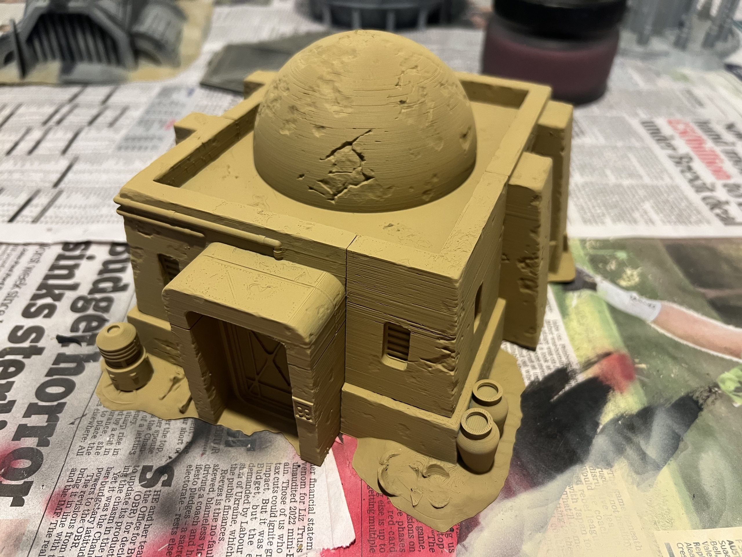 I did some test priming with a rattle can and always had the intention to base most of it with ColorForge Desert Sand and then bring out the airbrush