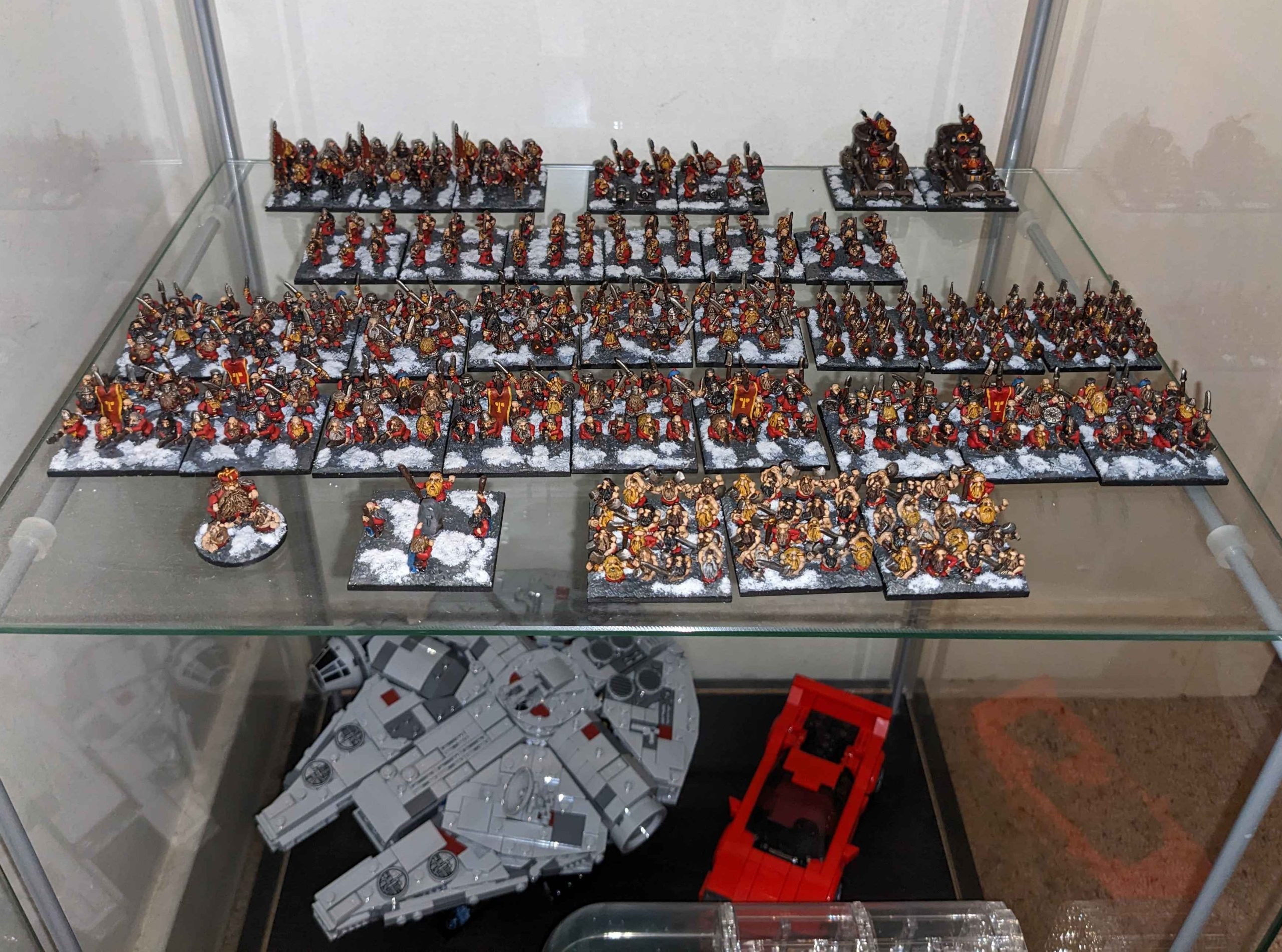 The original models came from Pendraken’s Hill Dwarf line and later I added in models from Kallistra. At some point (probably to be found in another project but I’m not going back through all my posts to figure it out) I not only finished the army, I rebased it onto 40mmx40mm for Fantastic Battles. They have sat in my glass cabinet ever since.