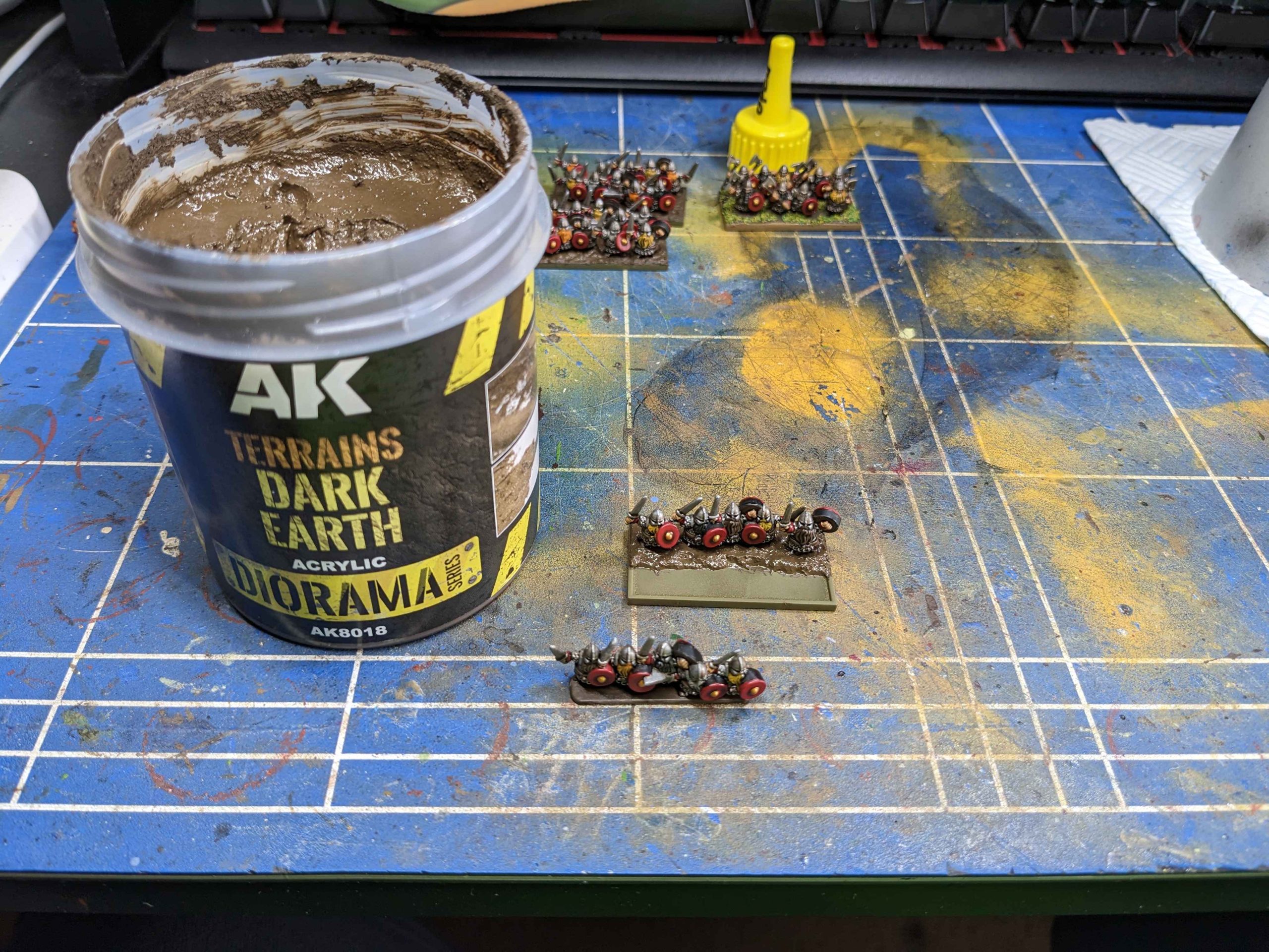 The bases themselves are the Wargames Atlantic 40mmx20mm plastic bases which come with the dwarves (and are available separately). They come with holes for small magnets so those go in before anything else.